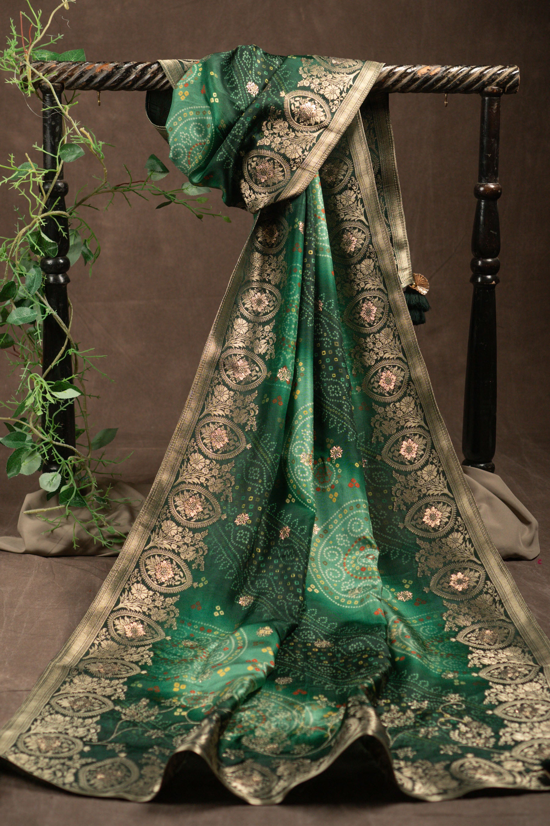 This magnificent dupatta is crafted from luxurious Banarasi Dola Silk fabric, featuring a rich, deep forest green ombre effect. The body of the dupatta is intricately adorned with a dense digital Bandhani print composed of traditional circular and geometric motifs. The entire piece is framed by an elaborate and heavy woven zari border featuring detailed floral and paisley motifs in silver and gold. The dupatta is finished with matching tassels at the corners, completing its opulent look. This piece masterfully combines the elegance of Banarasi weaving, the fine pattern of Bandhani, and a sophisticated color palette, making it a perfect choice for grand events.