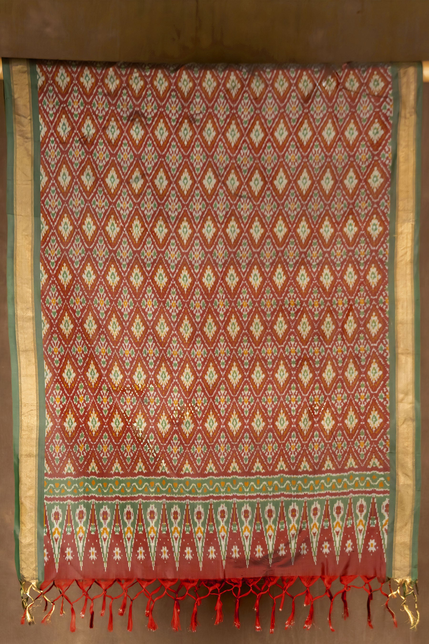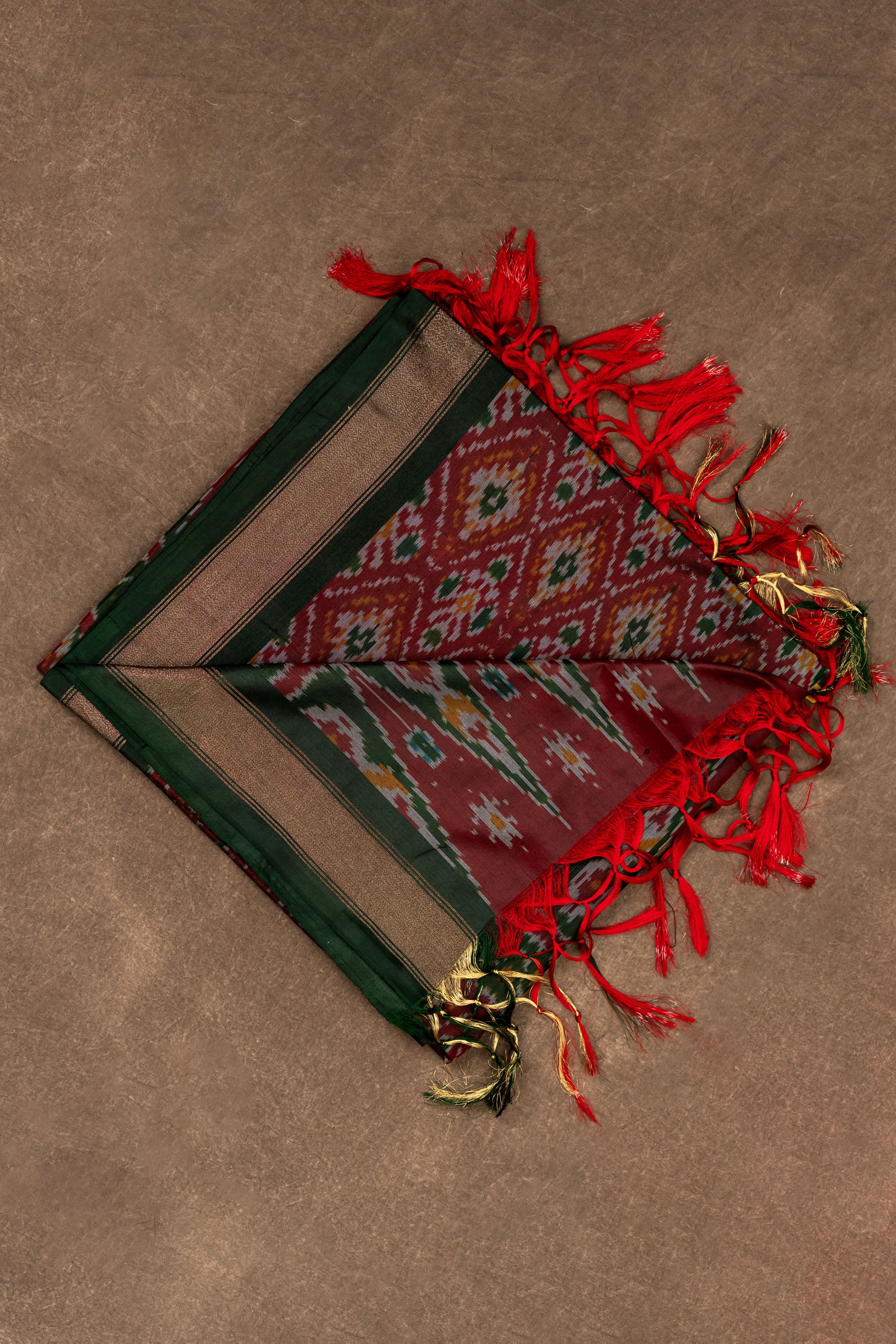 This magnificent dupatta is an authentic Handloom Pure Silk Dupatta, showcasing the traditional Ikat weaving technique. The body features a diamond shaped Ikat pattern in rich shades of maroon, deep red, and green. The borders are simple yet elegant, featuring a contrasting dark green edge with a subtle gold zari line, which frames the detailed Ikat design beautifully. The pallu (end border) is adorned with a decorative geometric pattern and finished with playful red tassels, enhancing its traditional appeal. This piece is a testament to skilled handloom artistry and the rich heritage of Indian textiles.