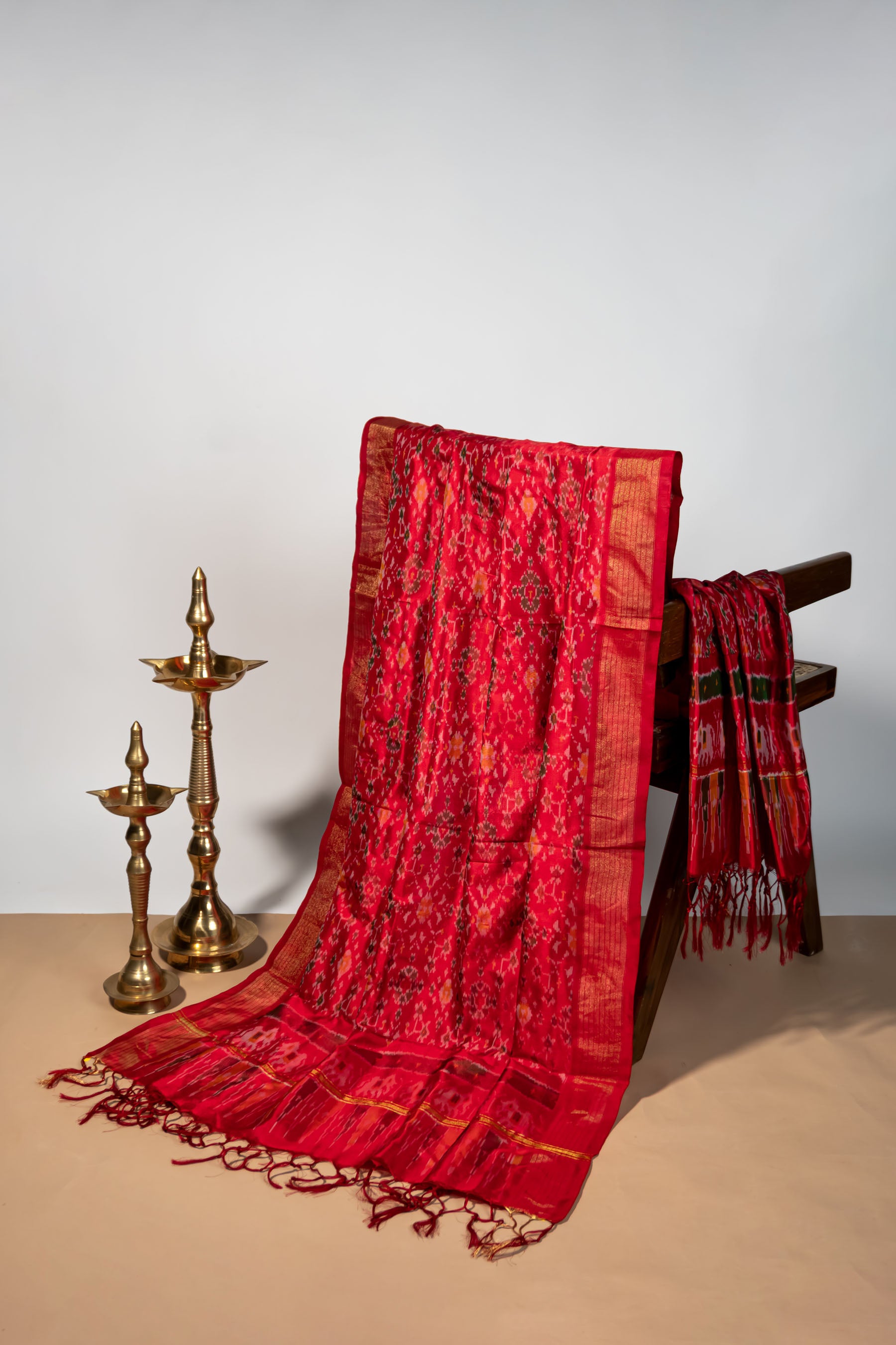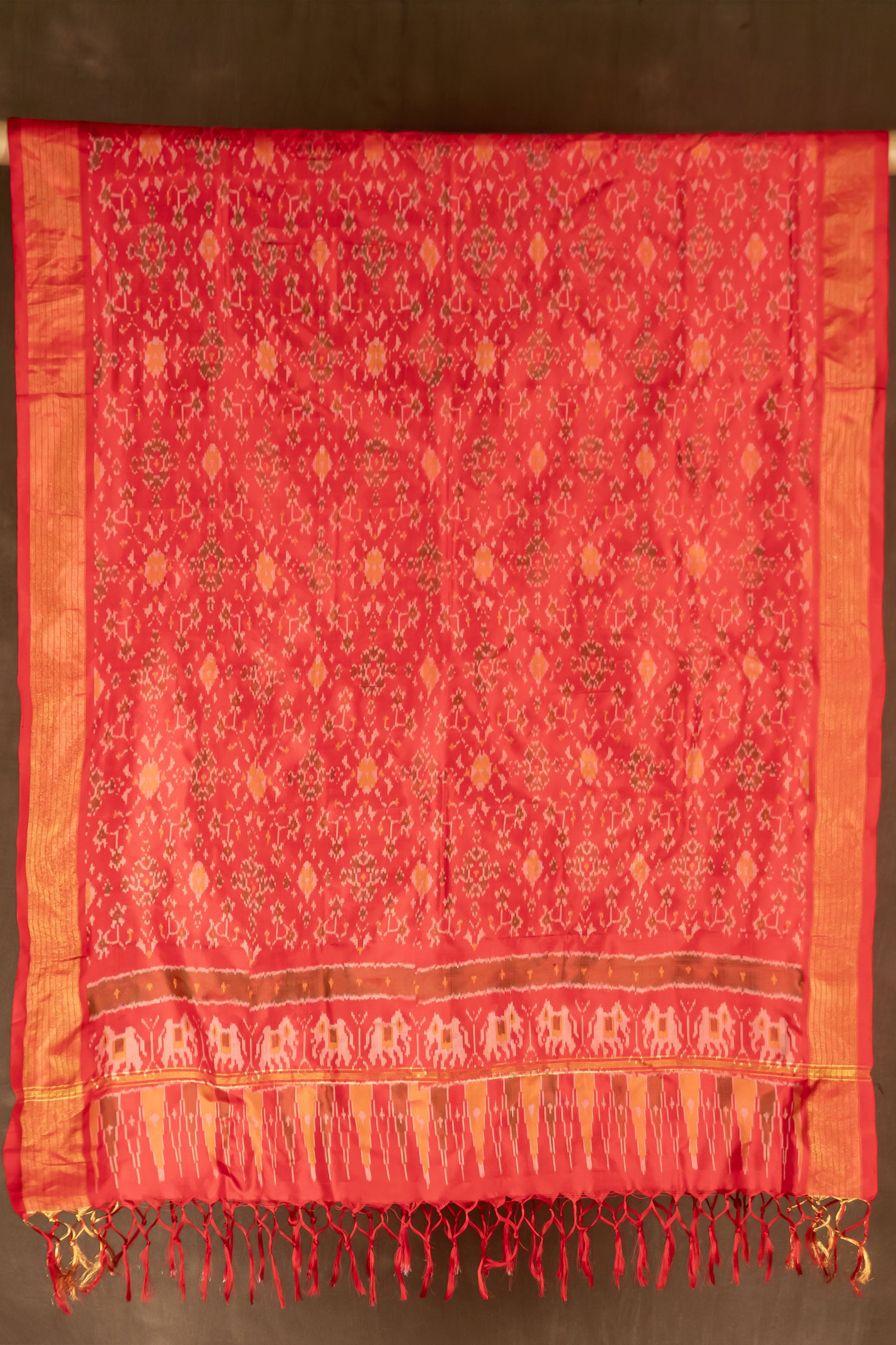 This exquisite accessory is a Pure Silk Dupatta handwoven on a Handloom, embodying the rich textile heritage of India. The vibrant, deep Red silk base is beautifully contrasted by intricate, authentic Ikat (or Ikkat) prints featuring geometric and subtle floral motifs in shades of orange, yellow, and brown. Its luxurious drape is enhanced by lustrous gold-toned borders and a detailed pallu that showcases bold patterned bands and a row of pointed design elements. The dupatta is elegantly finished with matching Red Tassels along the edges, making it a perfect statement piece to elevate any ethnic ensemble for festive occasions or formal wear.