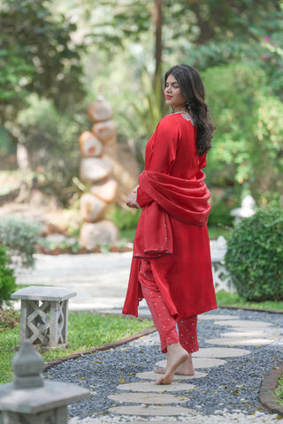 Crimson Red Modal Satin Silk Tanjore Suit with Elaborate Hand Embroidered Zardozi