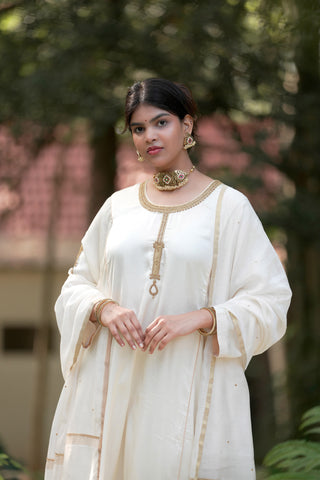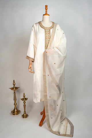 White Tanjore Modal Silk Kurti Pant Dupatta Set with Hand Embroidered Zardozi and Stone Work