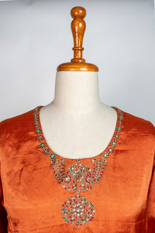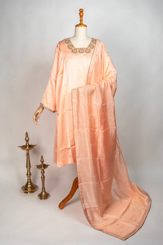 Peach Tanjore Modal Silk Kurti Pant Dupatta Set with Hand Embroidered Zardozi and Stone Work