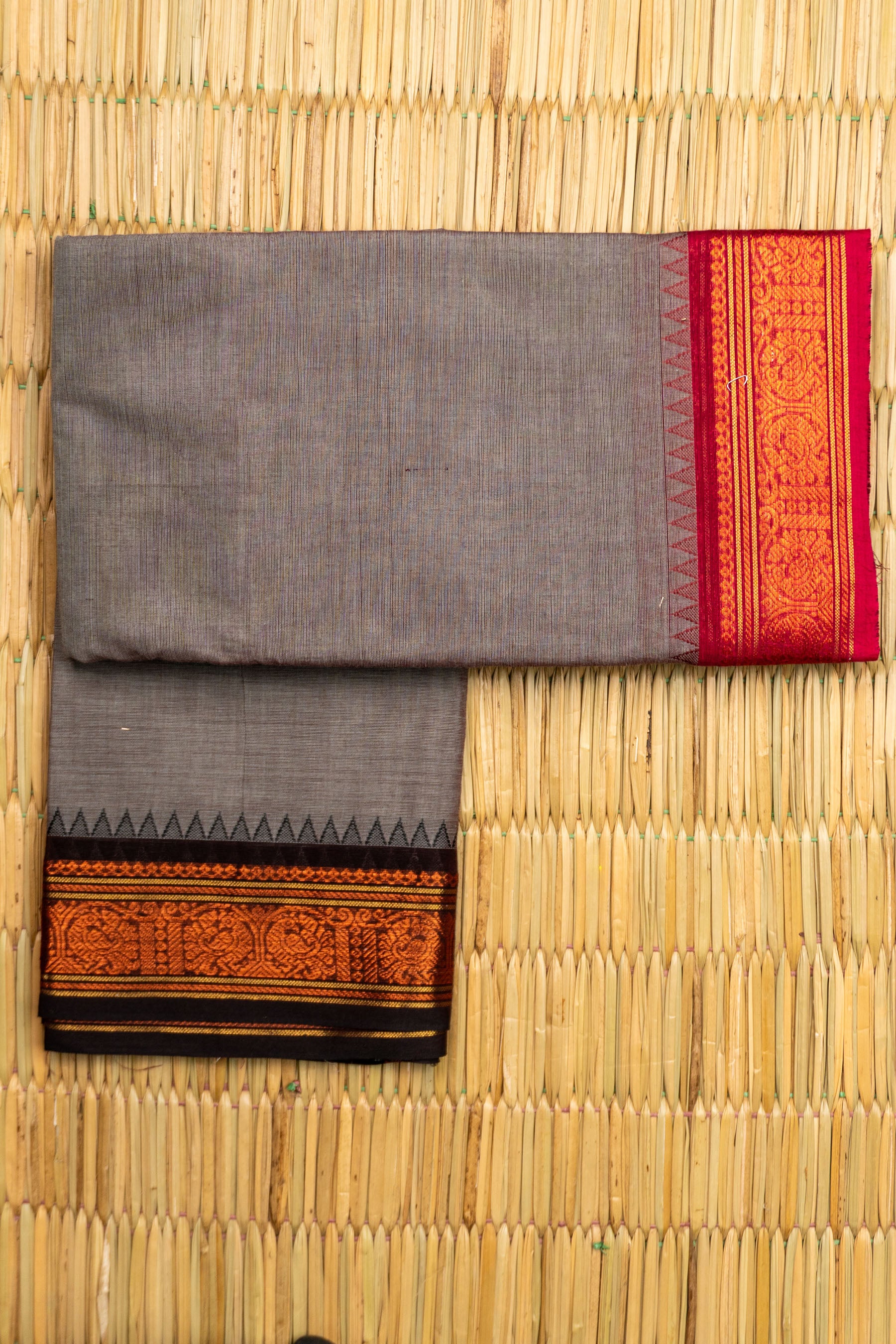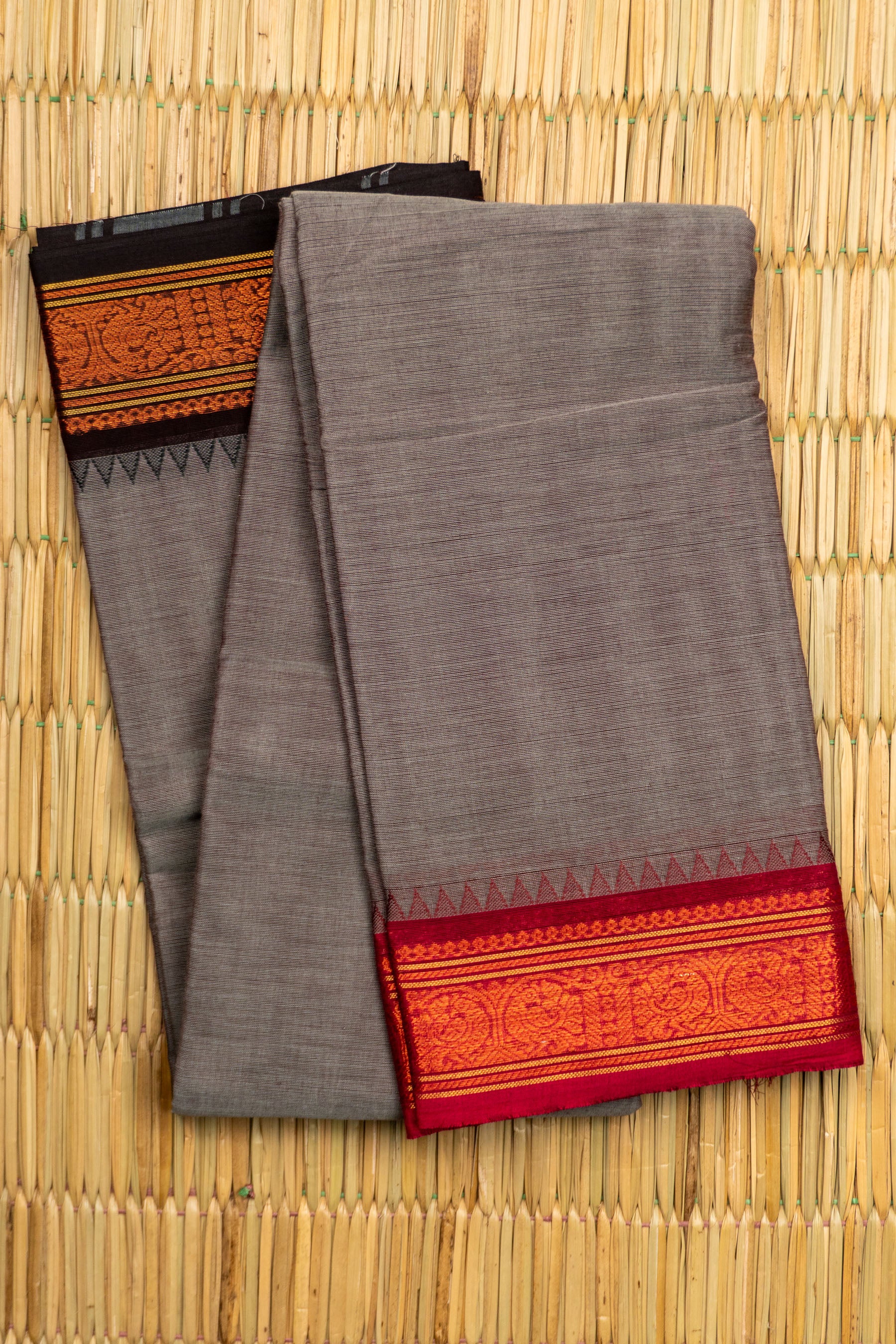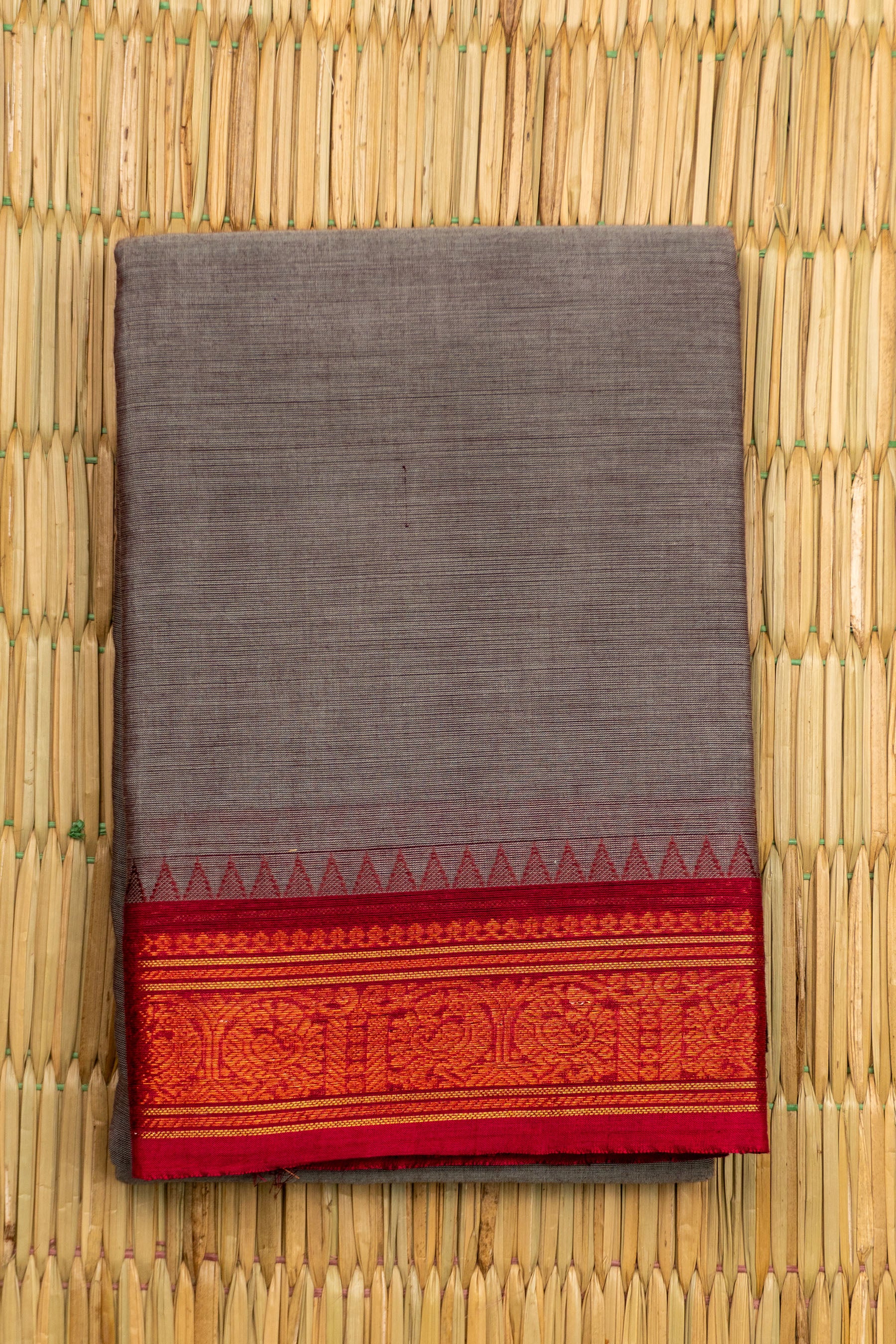 This elegant handloom saree is crafted from soft, textured Chettinad Cotton in a sophisticated Charcoal Grey or Ash Grey shade. The body's subtle, dual-tone weave is perfectly contrasted by its bold, traditional border. The border features a rich Maroon/Deep Red color at its center, separated by woven gold lines from a dark Black/Brown bottom edge. The main design panel is intricately woven with traditional Rudraksham or Chakram (circular/coin) motifs, framed by a striking row of geometric Temple (Gopuram) triangles along the top edge. This striking combination of muted grey with deep, festive red and classic woven motifs makes this piece a sophisticated and culturally rich option for professional wear or formal daytime events.