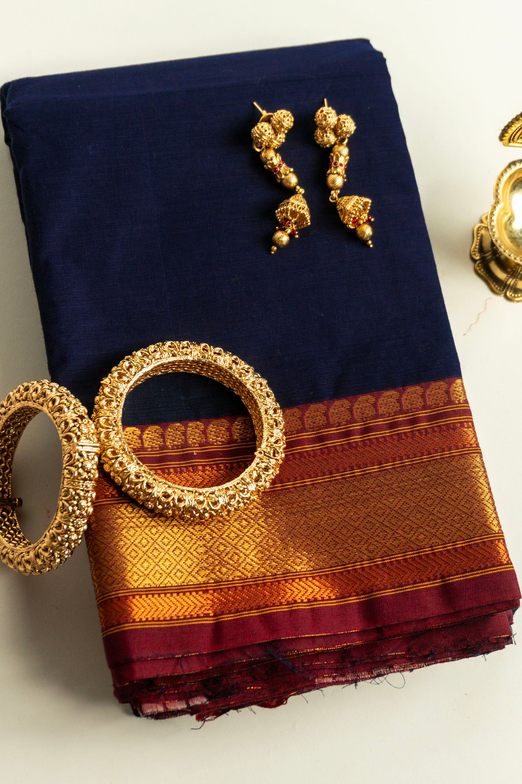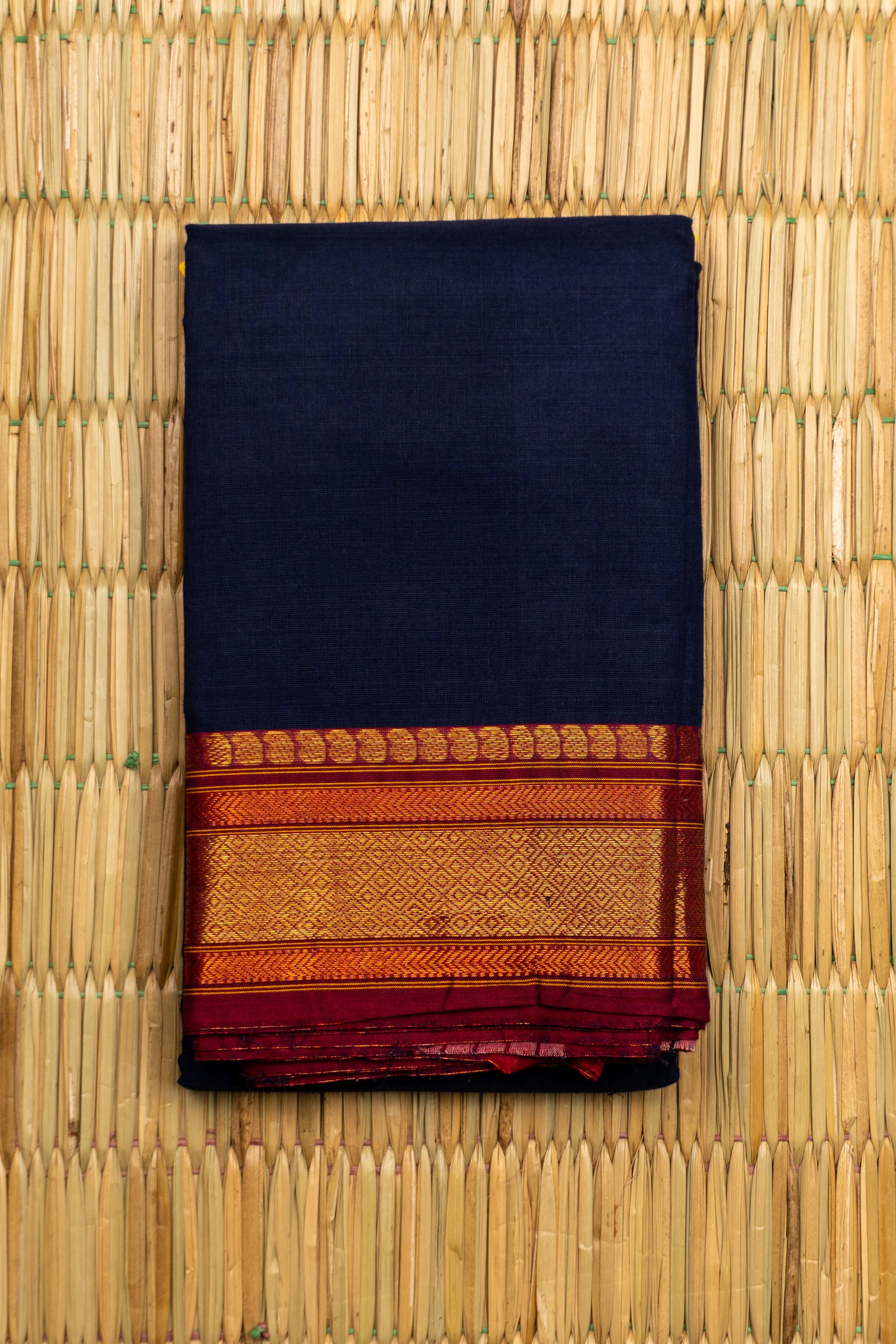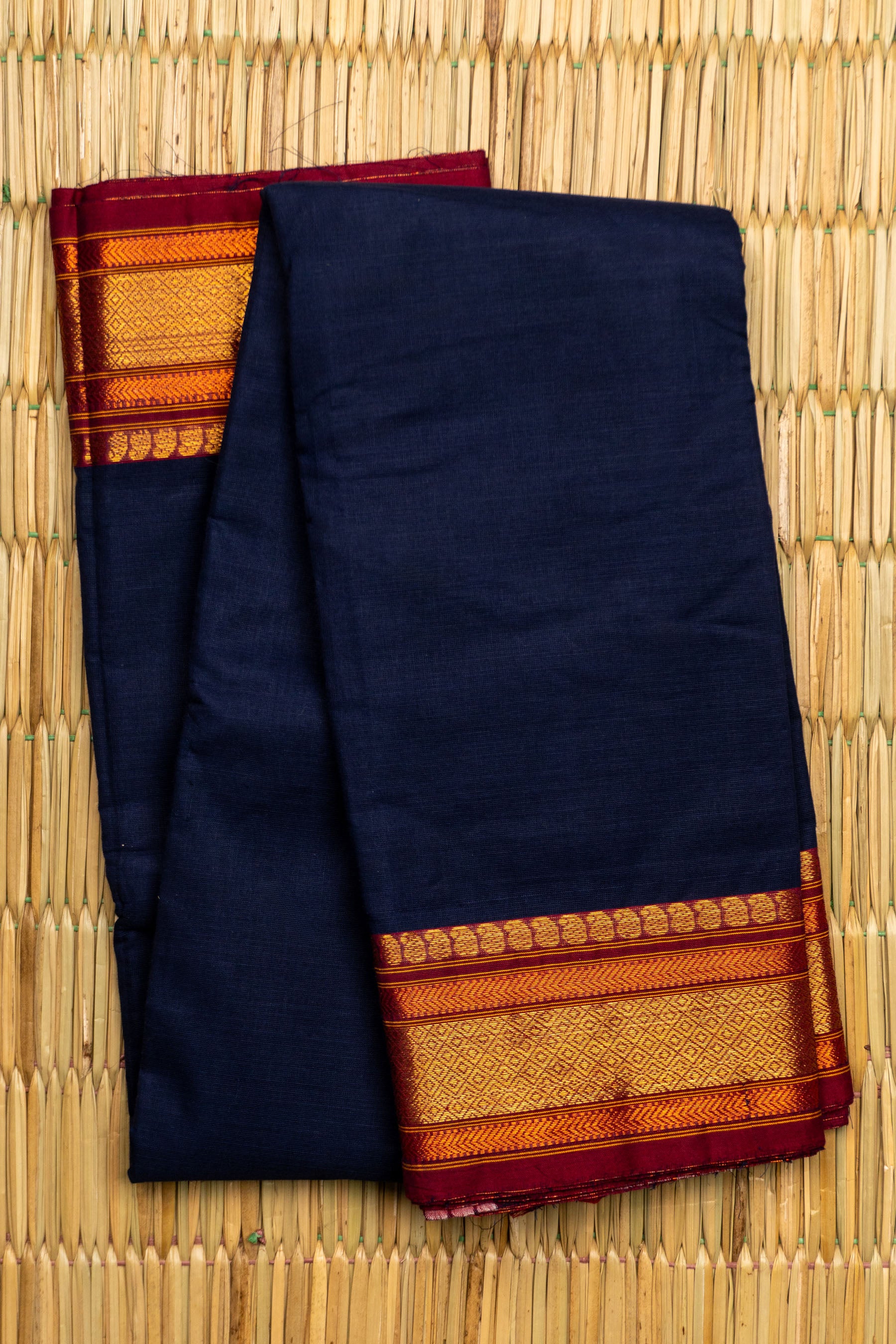 Classic Navy Blue Chettinad Cotton Saree with Rust Red and Solid Gold Zari Border