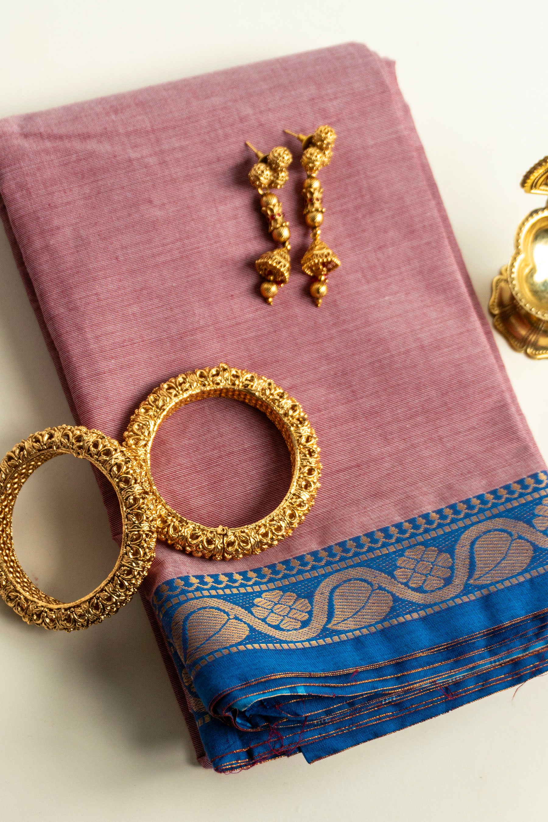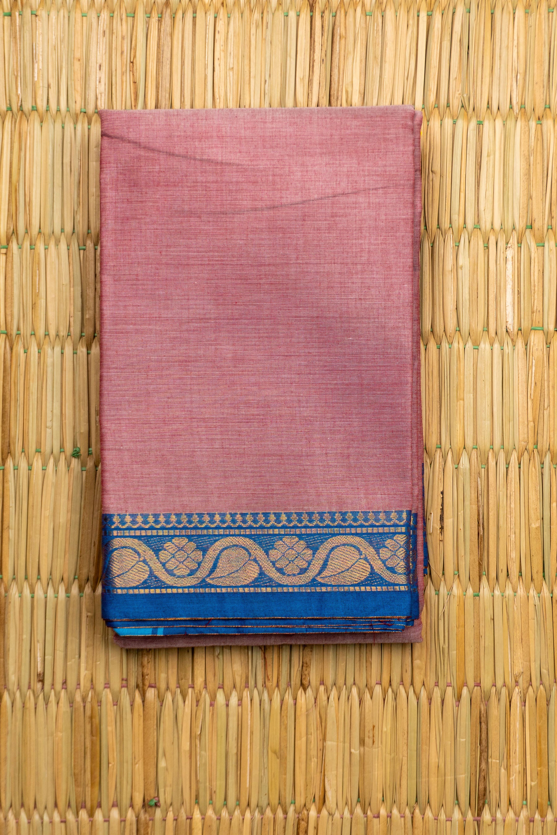 Indulge in the serene beauty of this exquisite Dusty Rose Pink Chettinad Cotton Saree, a testament to the elegant simplicity of South Indian handloom work. The body of the saree is woven from fine, breathable cotton in a soothing dusty rose pink shade, often appearing as a pinkish-mauve, offering exceptional comfort for all-day wear. The gentle body color is beautifully framed by a broad, contrasting border and pallu in a bright Royal Blue. The border features delicate golden zari work depicting a continuous vine of traditional floral or paisley motifs set within the blue band, adding a subtle touch of opulence. This authentic Chettinad cotton piece is the perfect combination of contemporary color and classic design, making it a comfortable yet stylish choice for work, casual outings, or gifting.