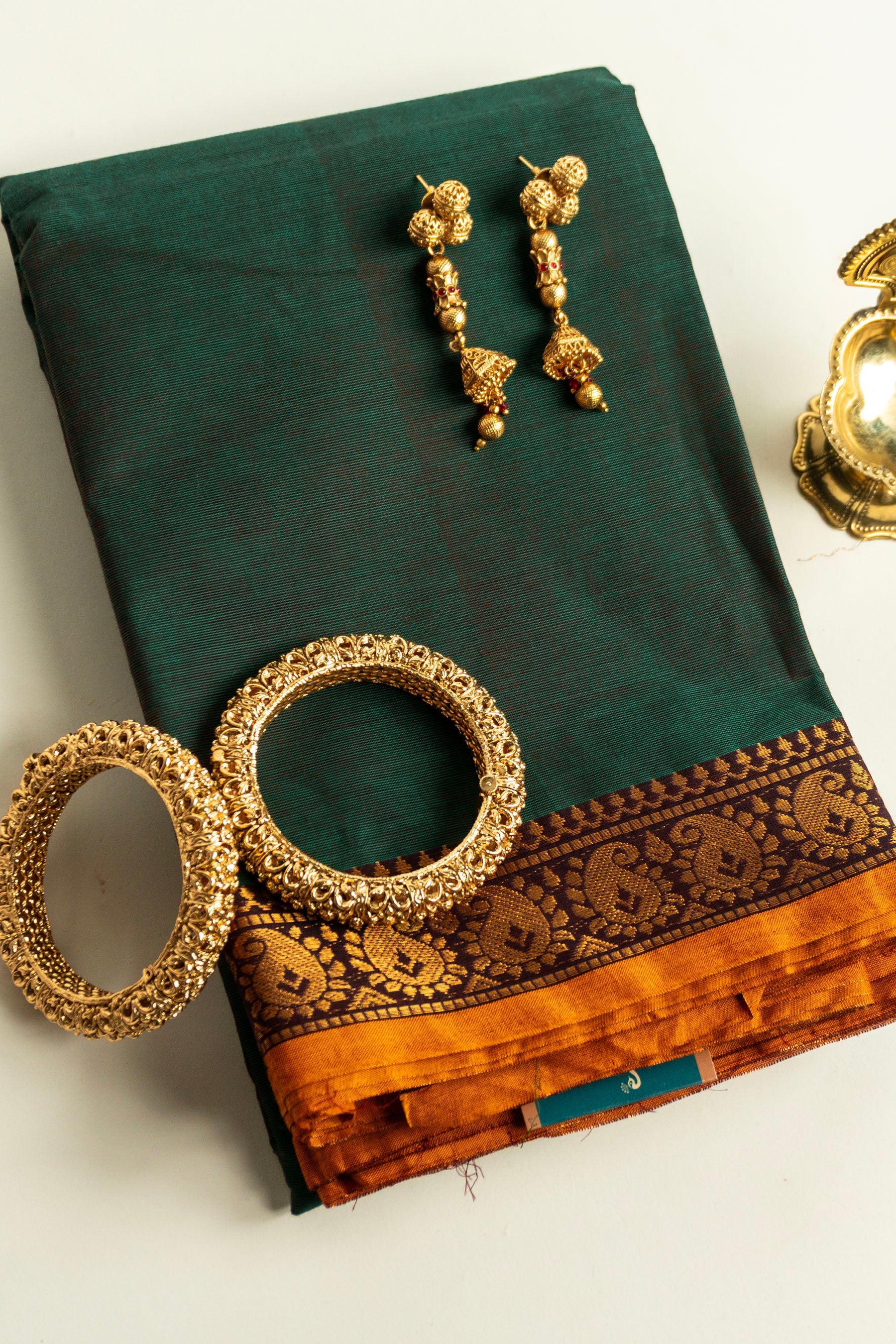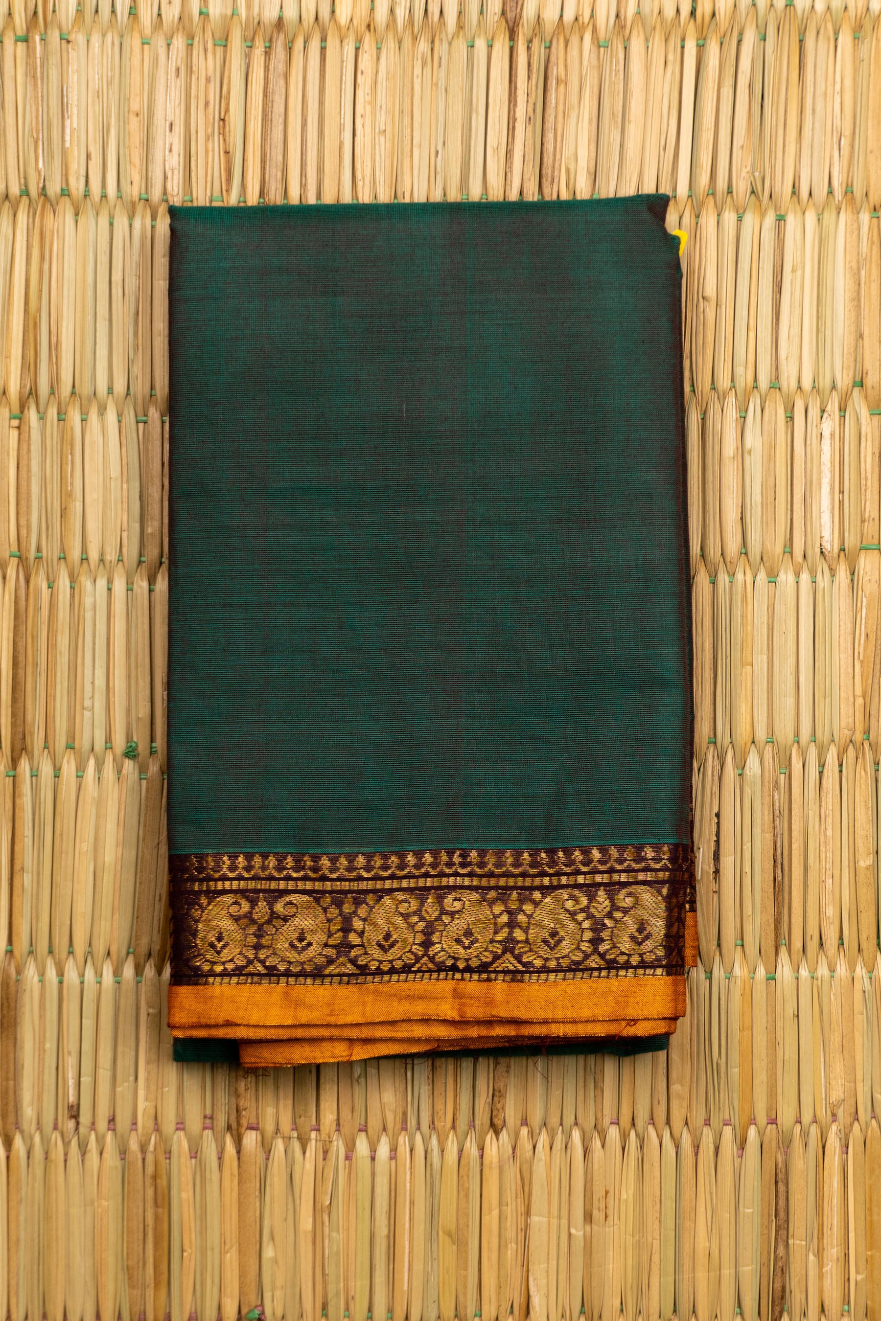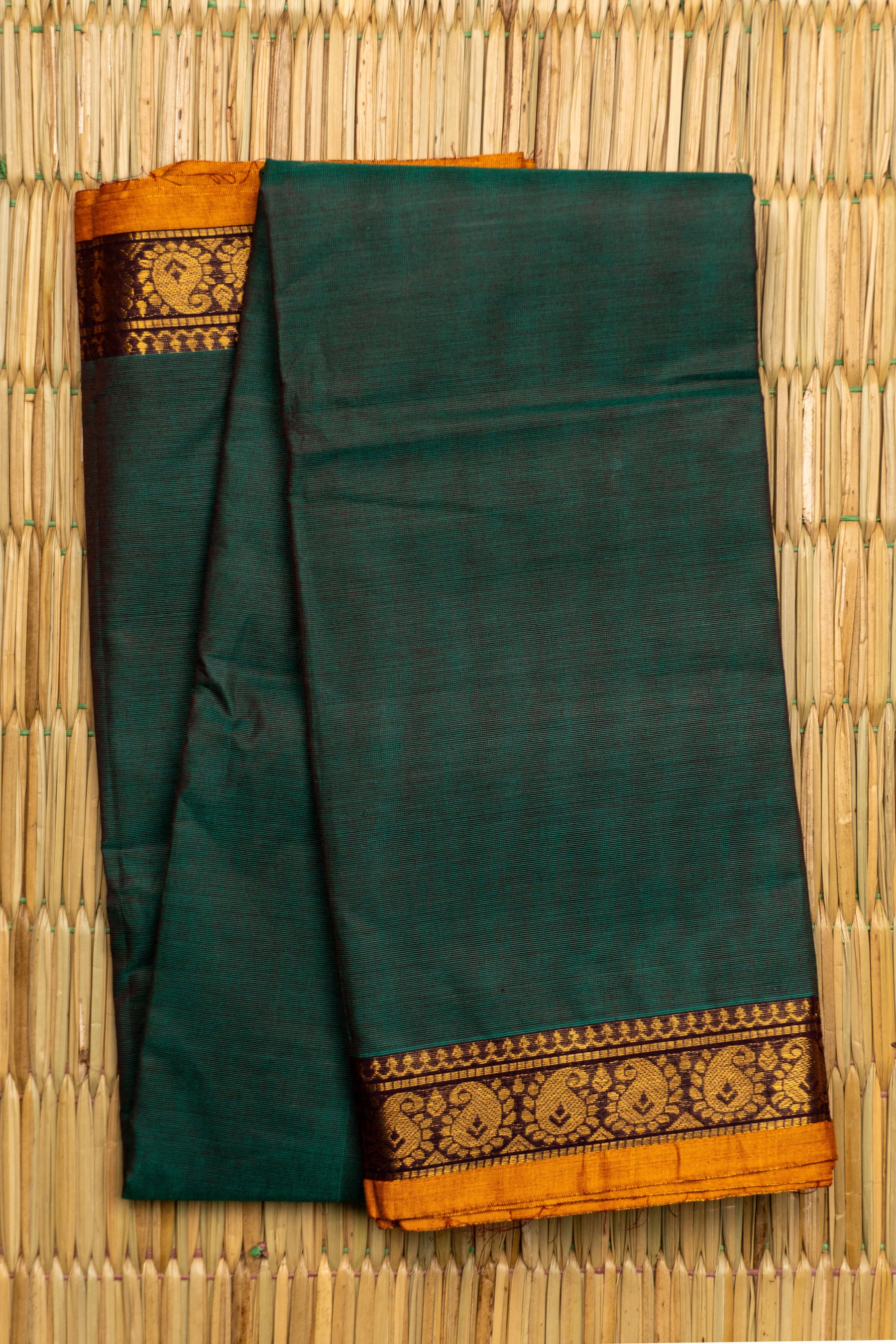 Forest Green Chettinad Cotton Saree with Mango Yellow and Zari Paisley Border