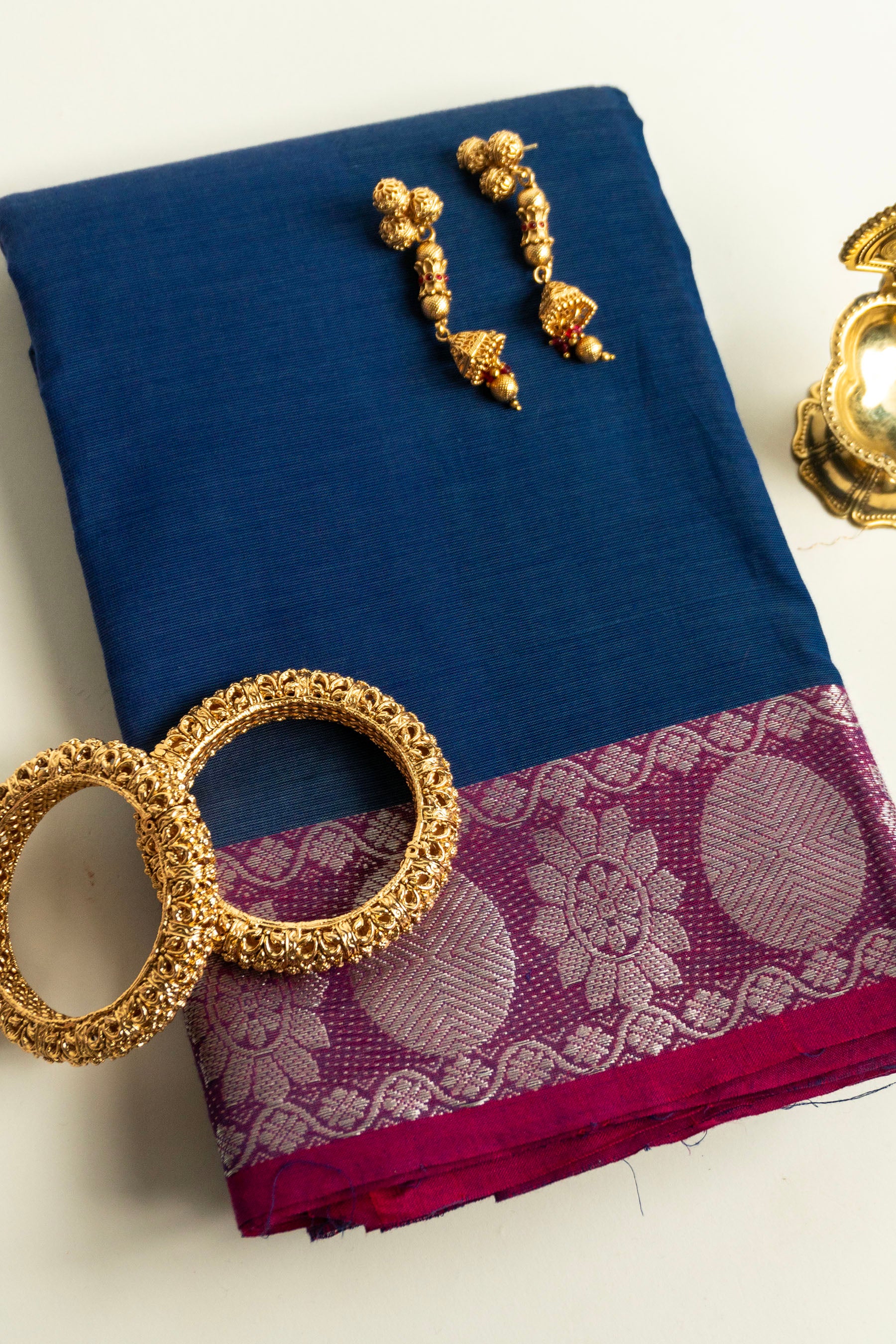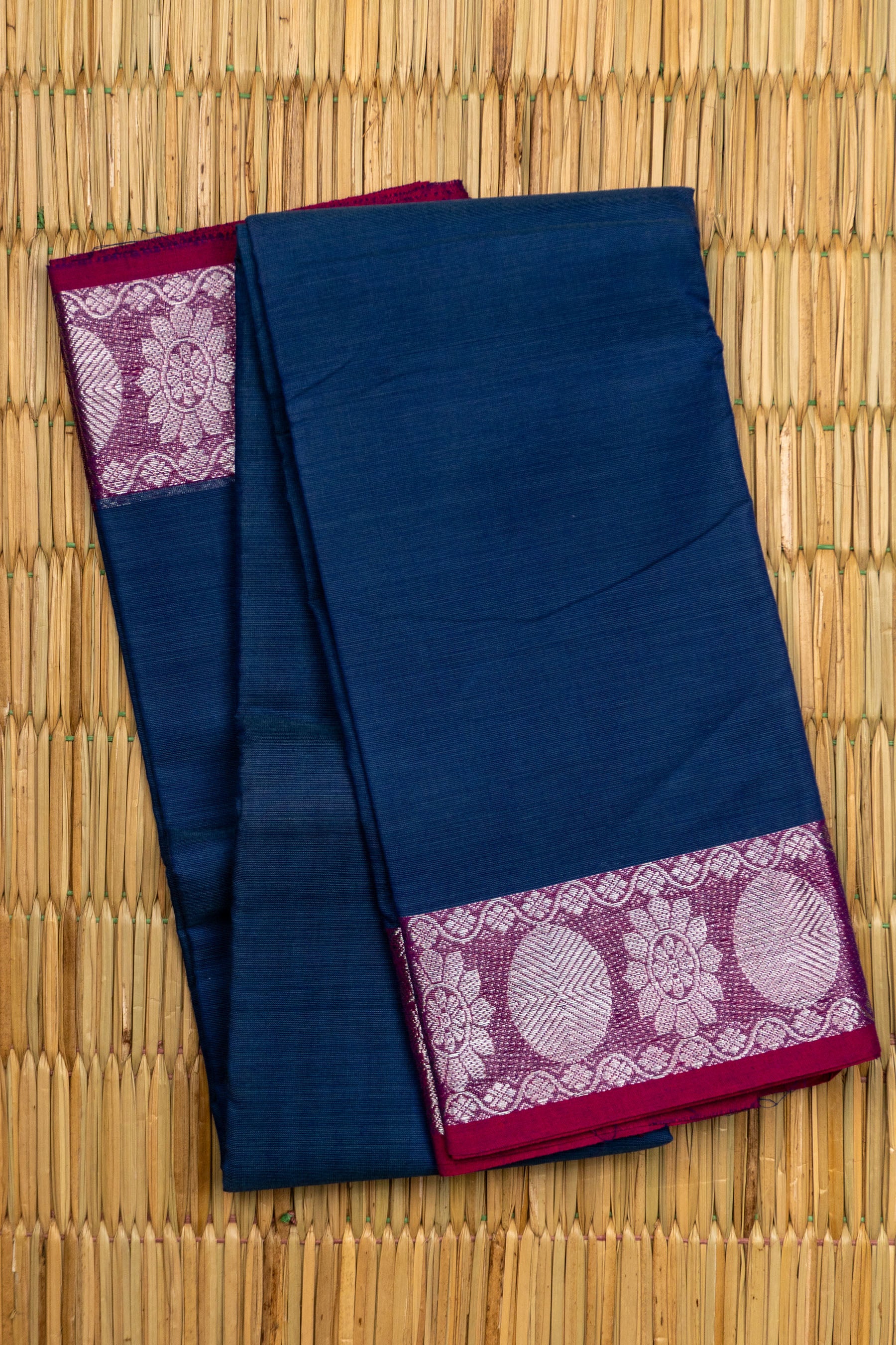 Navy Blue Chettinad Cotton Silver Zari Floral and Oval Motifs