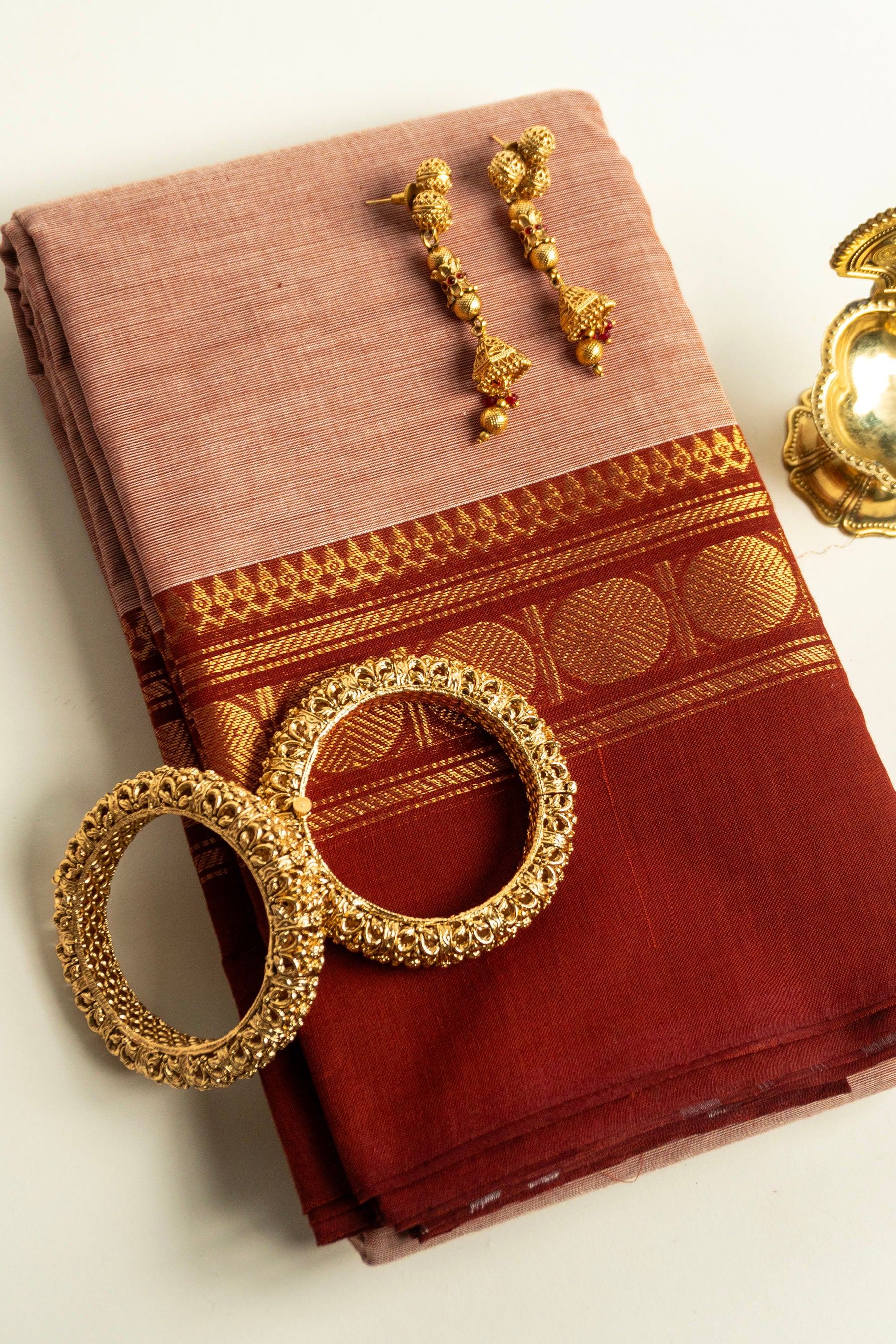 Nude Pink Chettinad Cotton Saree with Rust Red and Golden Coin Border