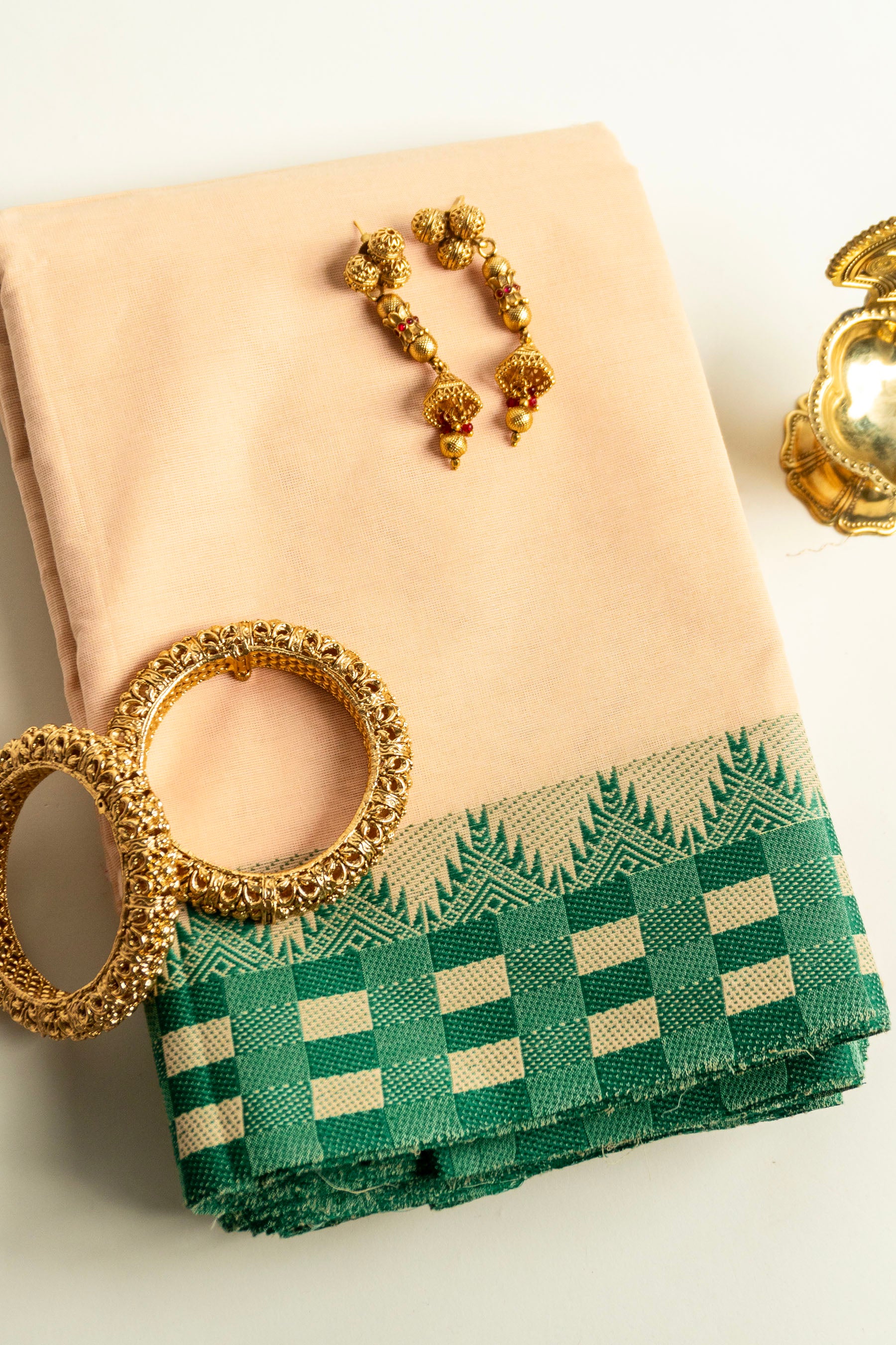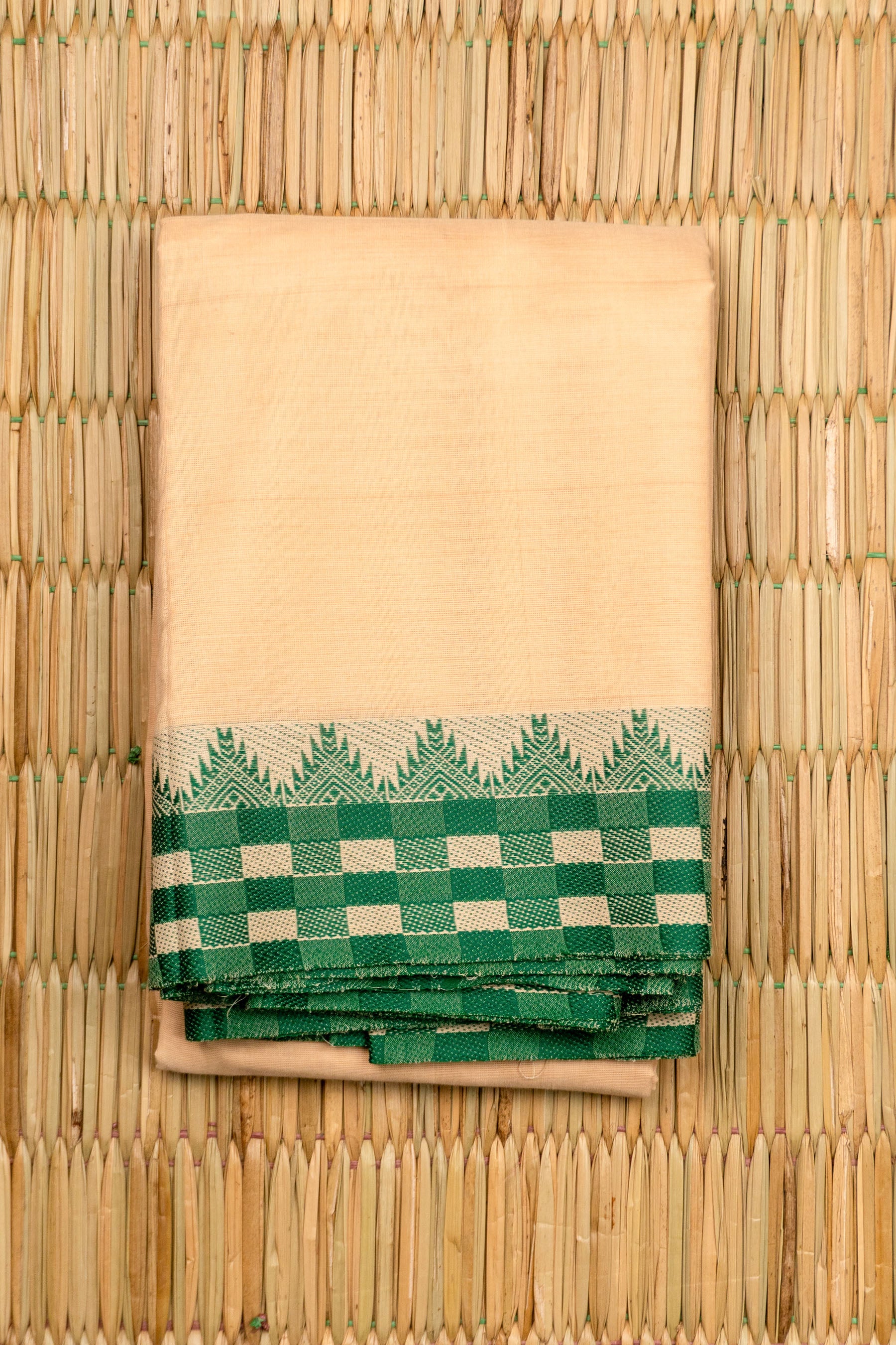 The saree is gracefully complemented by a vibrant Aqua Green Border. This border features a charming checkered pattern interspersed with delicate temple or triangular motifs along its edge. The contrasting colors and classic patterns give this Kanchi Cotton saree a sophisticated yet traditional appeal, suitable for various events, from casual outings to festive gatherings.