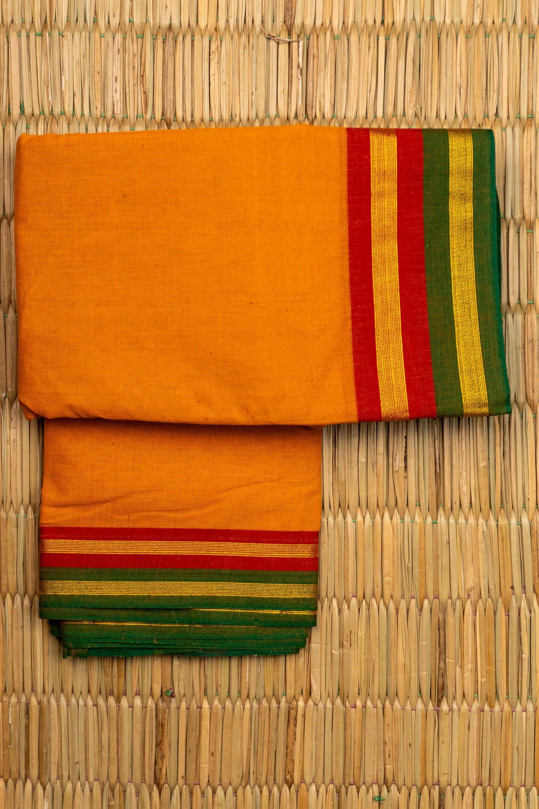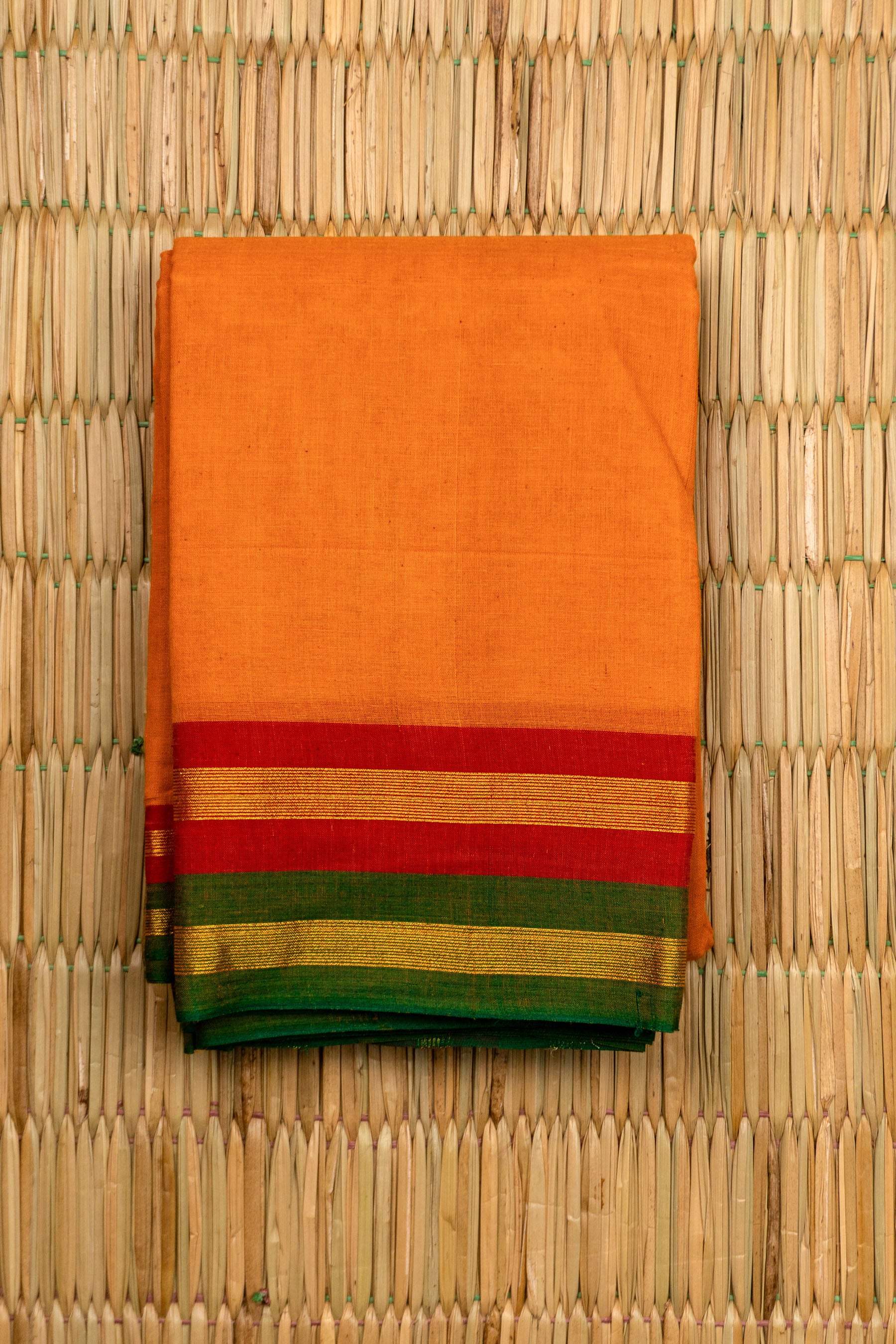 Orange Chettinad Cotton Red Green and Gold Striped Border
