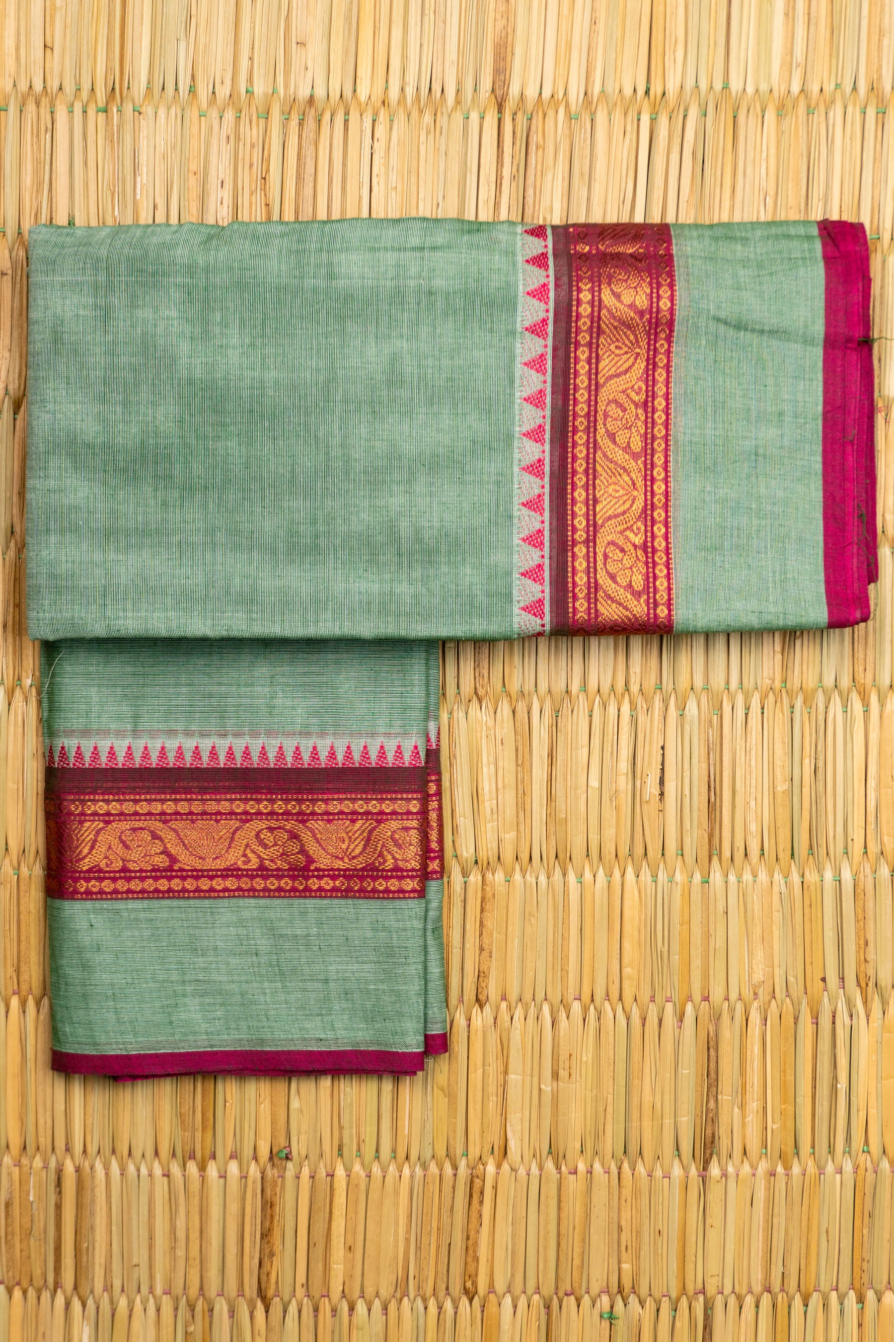 This elegant saree is a quintessential handloom piece crafted from breathable Chettinad Cotton, renowned for its comfort and durability. The body of the saree features a subtly textured, solid Pista Green weave. The saree is defined by its wide, traditional Rani Pink/Magenta border, which is richly detailed with vibrant Gold Zari weaving. The border showcases a prominent row of classic Peacock (Mayil) motifs running along the length, framed by contrasting geometric elements, including fine Temple (Gopuram) triangles along the top. This harmonious blend of cool green with bold, festive pink and gold makes it a traditional and sophisticated choice, ideal for professional wear, casual events, or daytime cultural gatherings.
