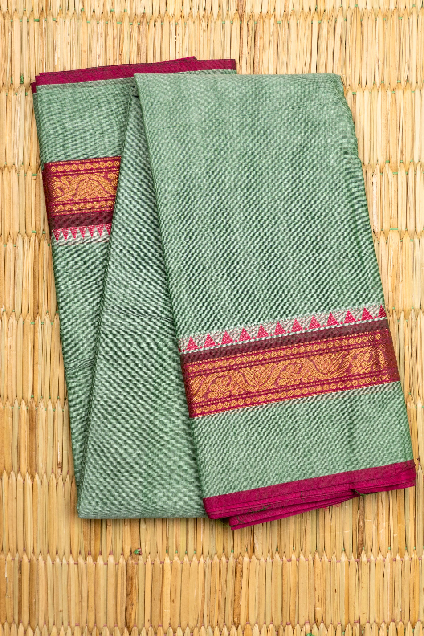 Pista Green Chettinad Handloom Cotton Saree with Magenta and Gold Peacock Border