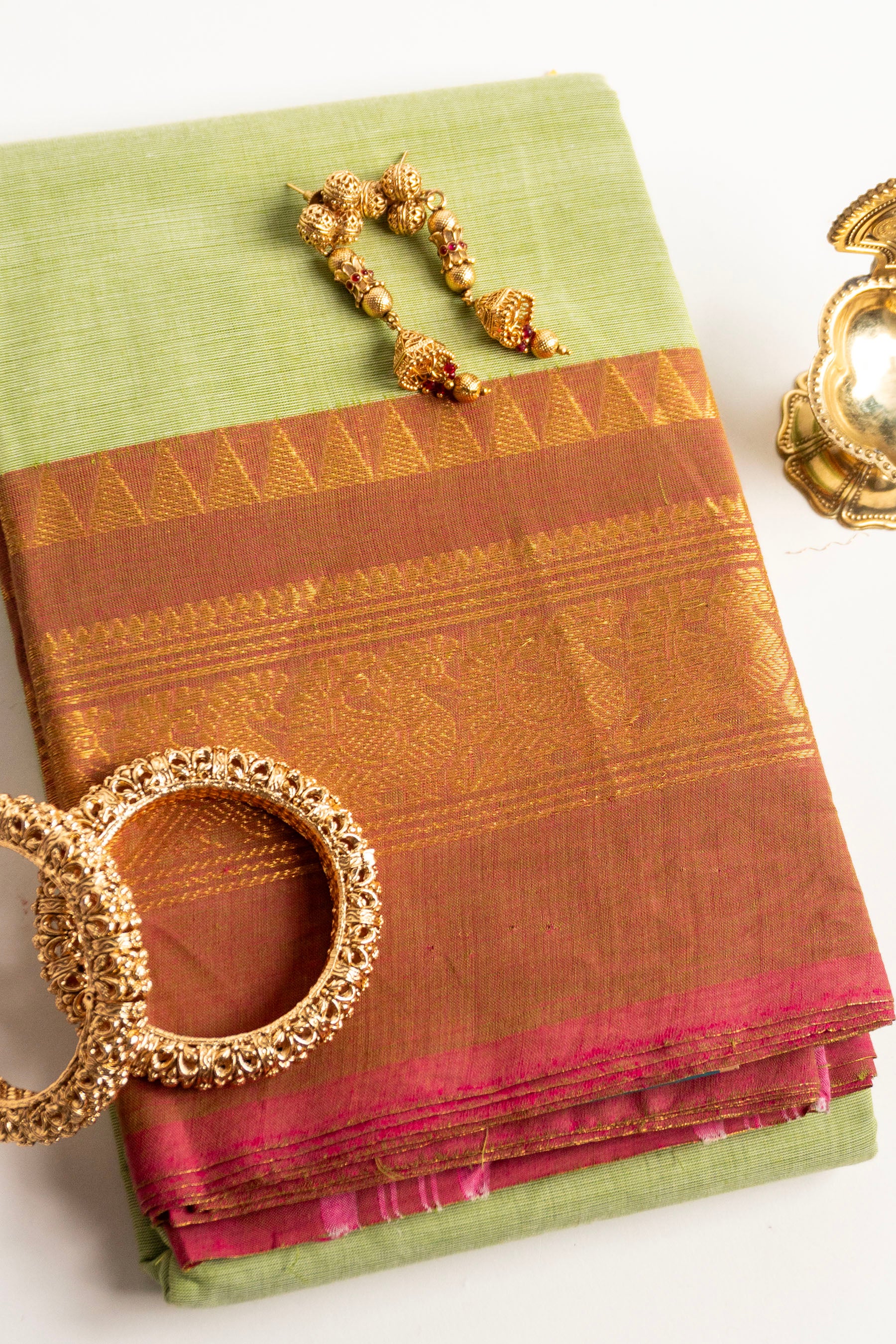 Pista Green Chettinad Handloom Cotton Saree with Rust-Red and Gold Peacock Border