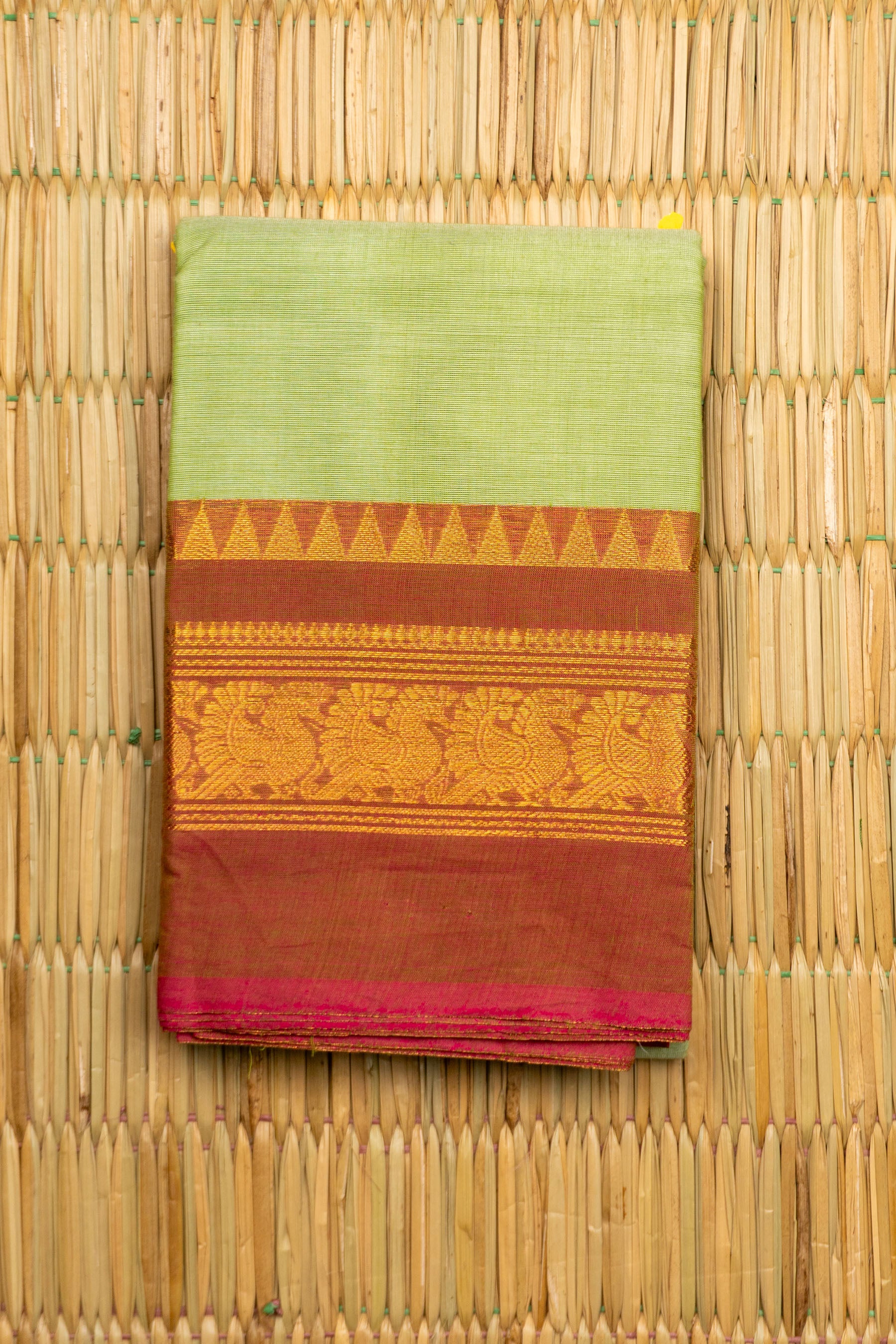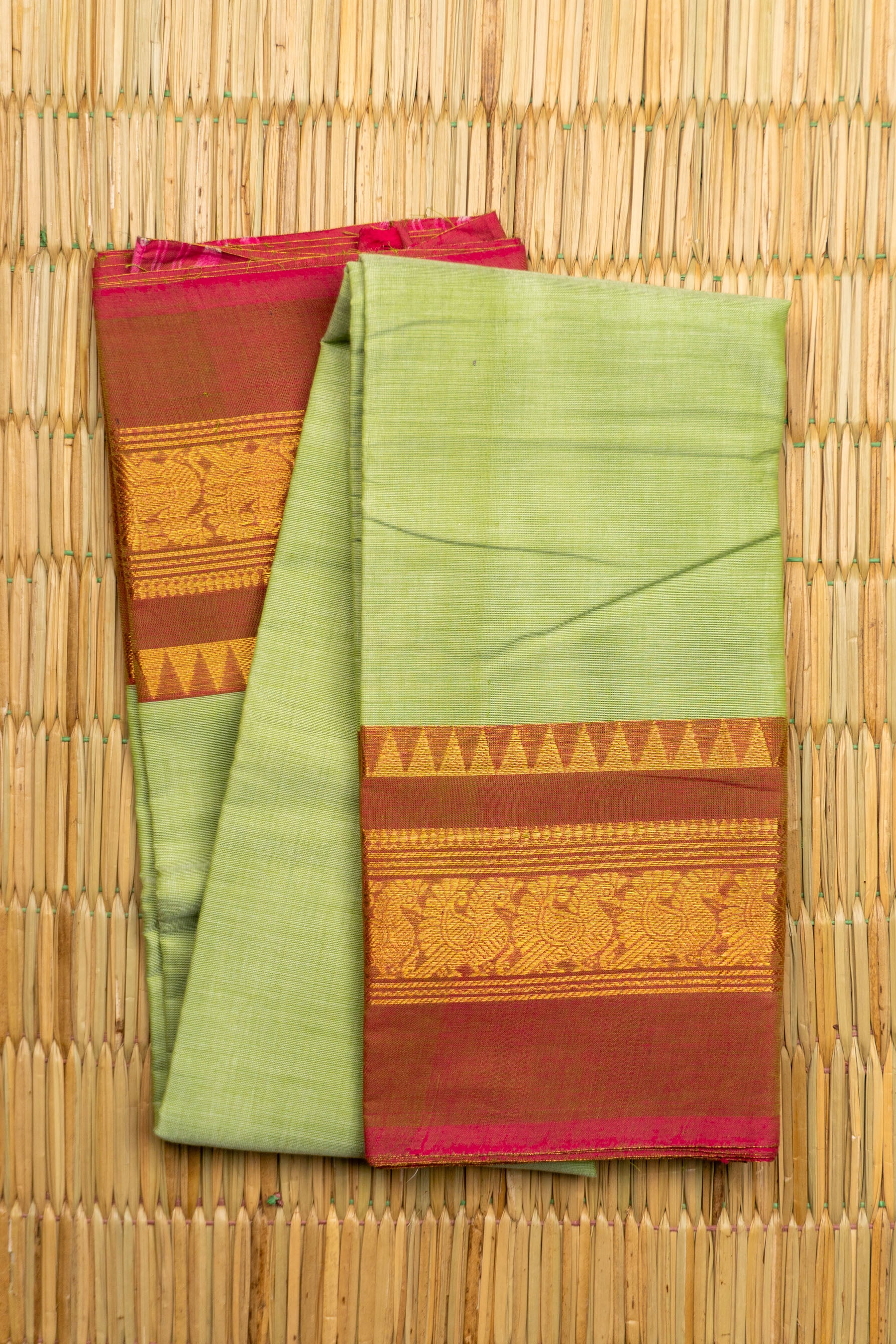 This elegant saree is a classic example of a Chettinad Cotton Handloom in a soothing Pista Green body color, a perfect shade for comfort and sophistication. The weave is defined by its wide, contrasting border in a deep Rust-Red/Brown, intricately woven with rich Gold Zari. The border features traditional motifs, most prominently a row of stylized Peacocks (Mayil) on a textured red base, framed by contrasting geometric elements like the Temple (Gopuram) triangles along the top. The use of breathable cotton and the bold contrast color palette, finished with a bright Rani Pink inner selvage, makes this saree a traditional yet fashionable choice ideal for daily wear, professional settings, or daytime cultural events.