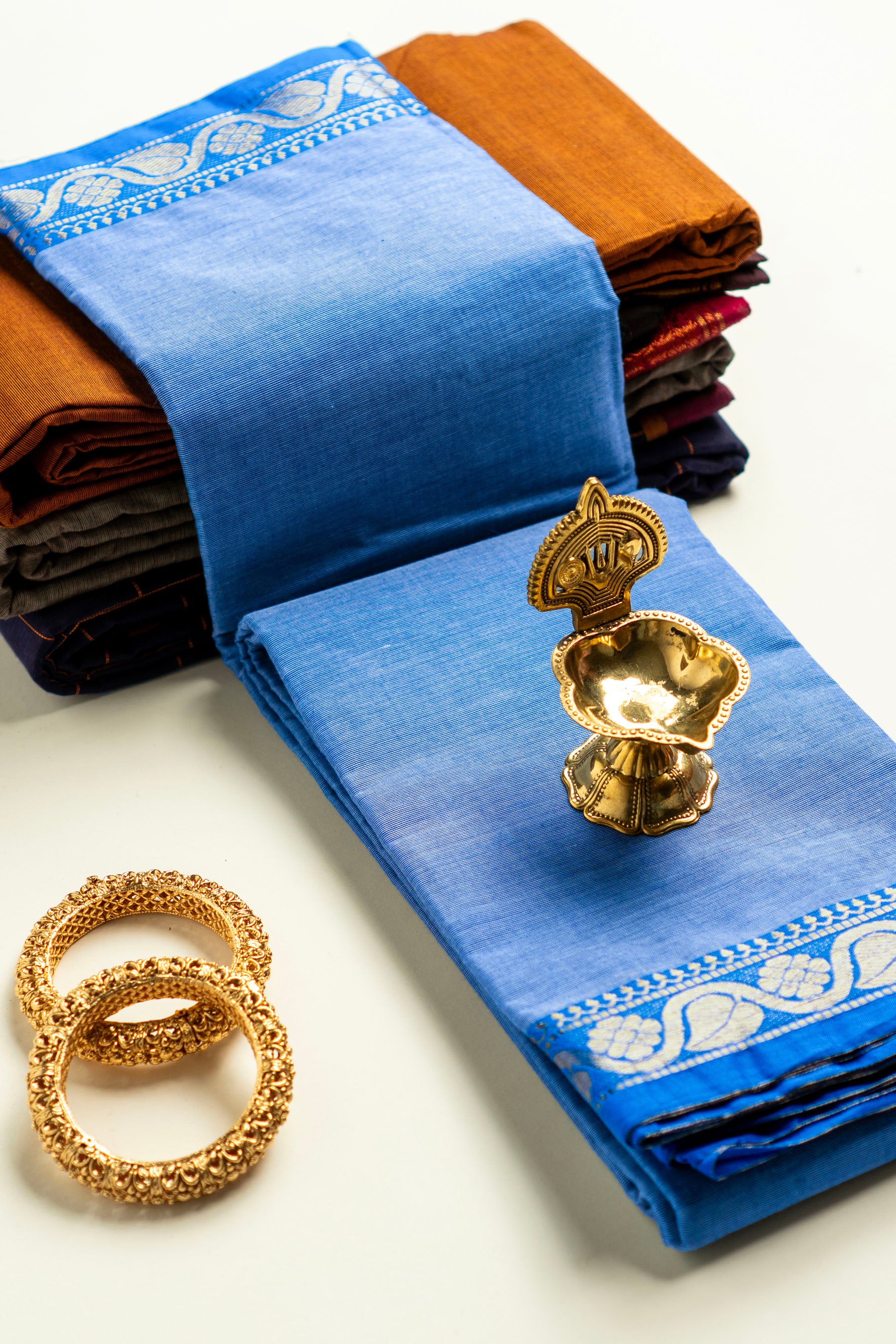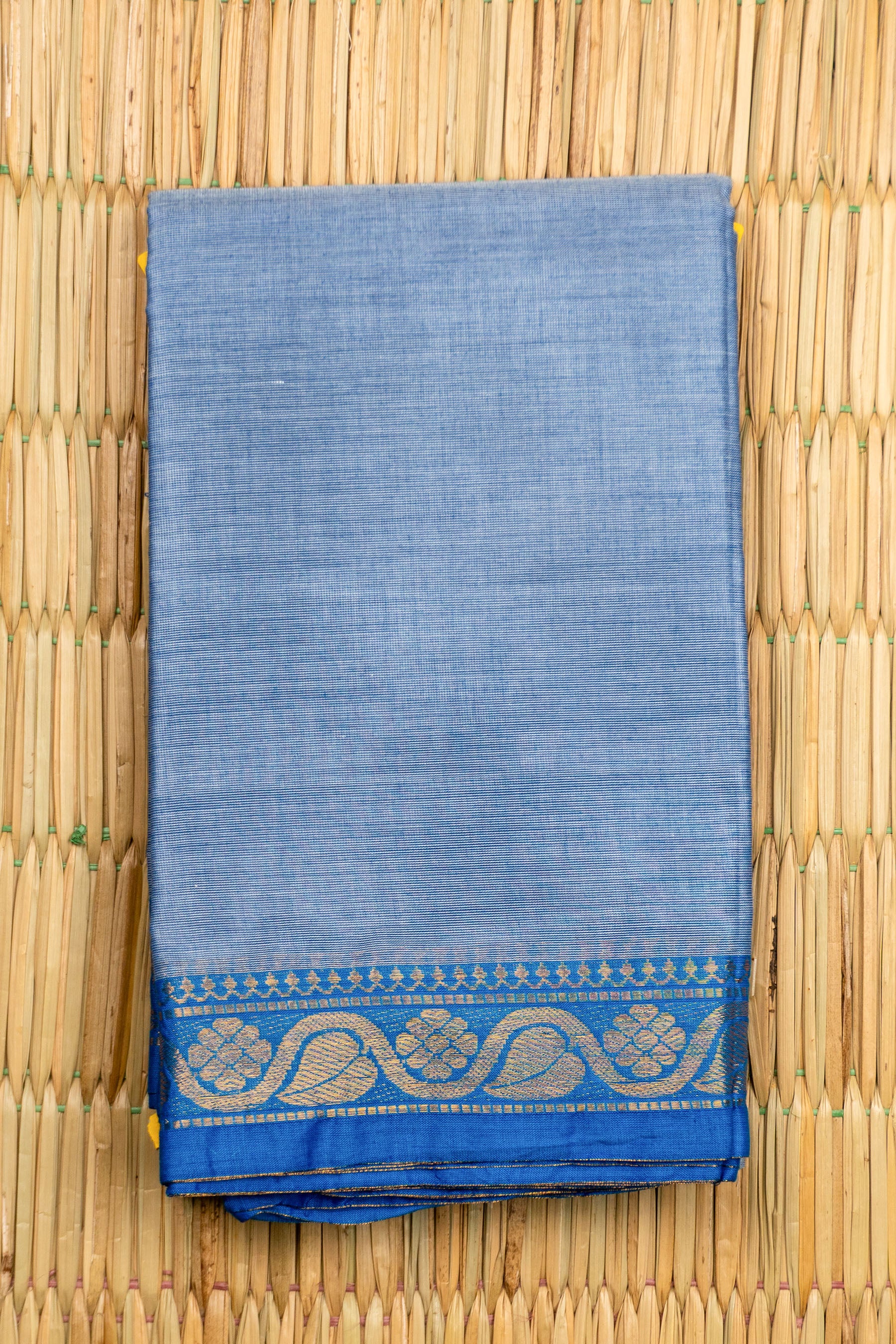 This elegant saree is a quintessential handloom piece crafted from breathable Chettinad Cotton, renowned for its comfort and durability. The body of the saree features a subtly textured, dual-tone Steel Blue or Light Blue weave. Providing a vibrant contrast, the saree is defined by its bold, traditional Royal Blue border. This border is richly detailed with woven Gold Zari in a classic design, showcasing a prominent row of Paisley (Maanga) motifs along with a smaller geometric Temple (Gopuram) pattern along the edge. This harmonious blend of cool colors and traditional gold weaving makes it a sophisticated and versatile choice, ideal for professional wear, casual events, or daytime cultural gatherings.