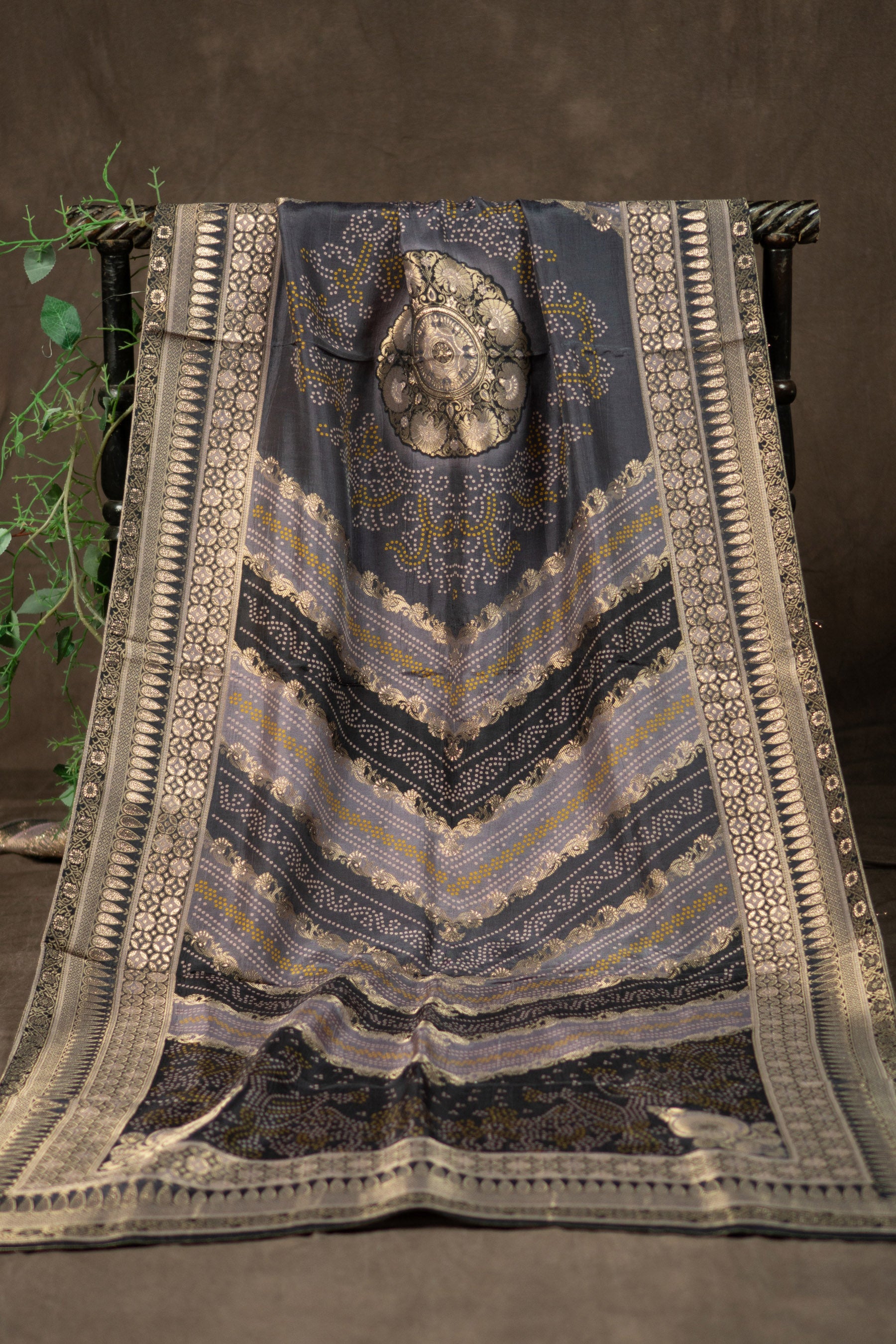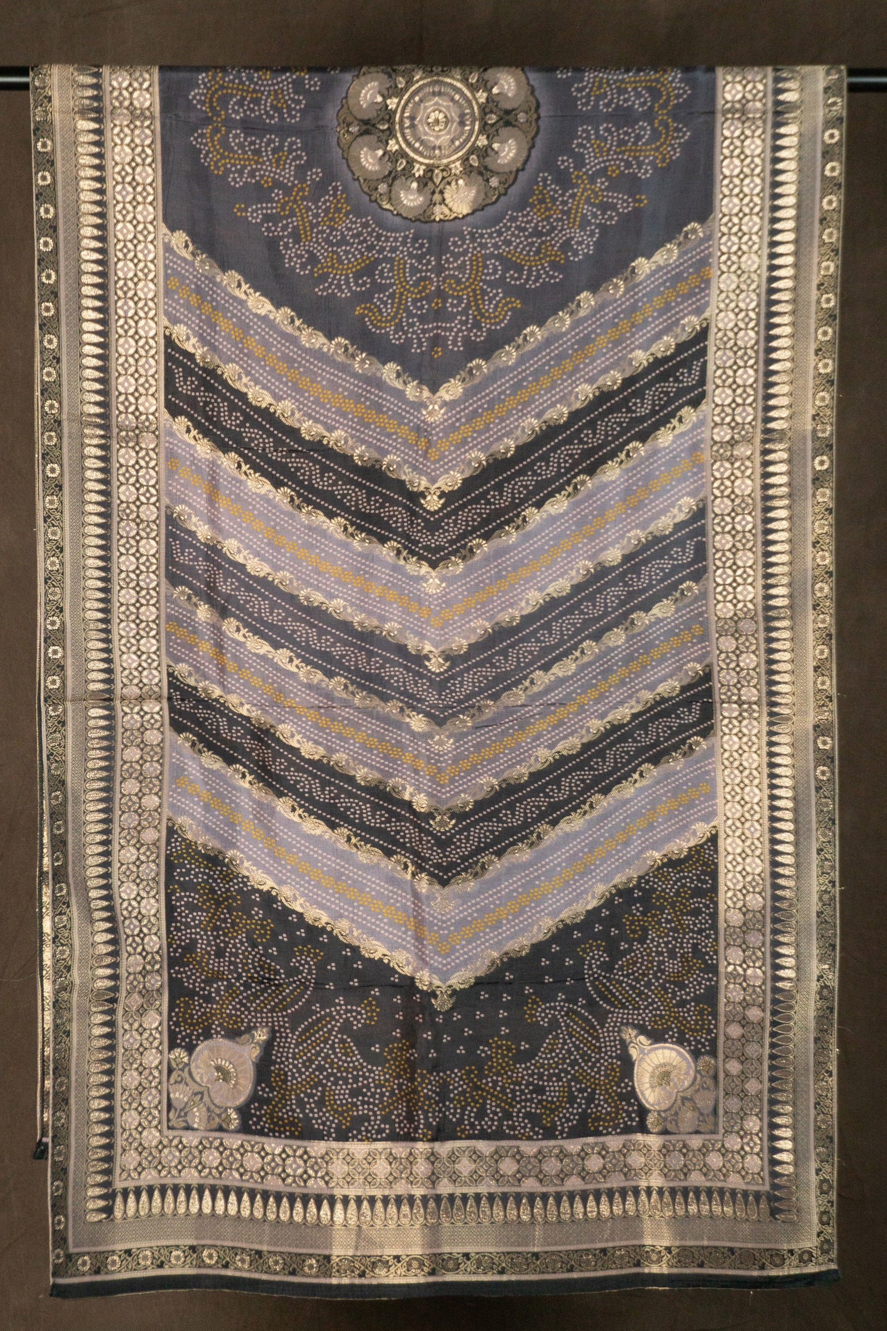 This stunning dupatta is crafted from luxurious art Banarasi dola silk in a deep charcoal grey shade that offers a rich sheen and a graceful drape. The piece features a traditional bandhani print with fine white and yellow tie dye dots arranged in intricate patterns across the main body. Elaborate gold zari weaving enhances the design with a large circular medallion at the top and detailed paisley motifs in the bottom corners. The horizontal chevron patterns and a multi layered decorative border featuring floral and geometric zari work provide a truly regal finish. This sophisticated accessory combines ethnic heritage with contemporary elegance making it a perfect statement piece for festive occasions and formal celebrations.