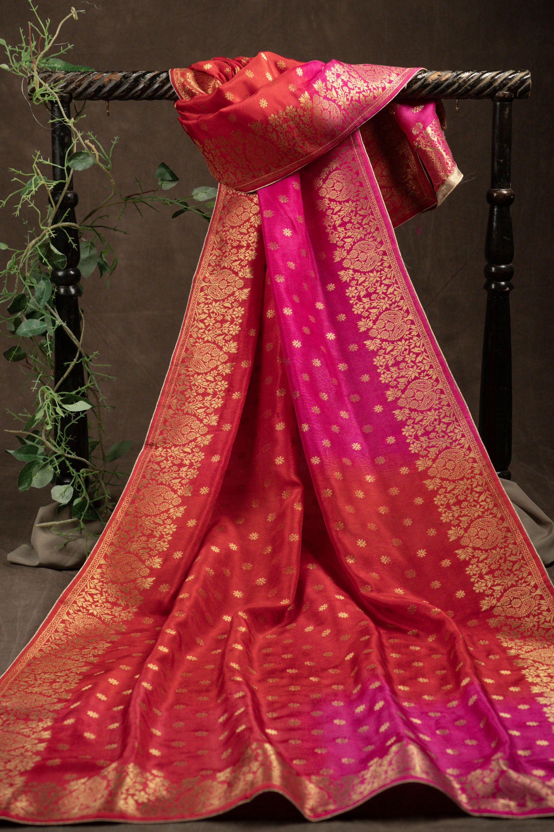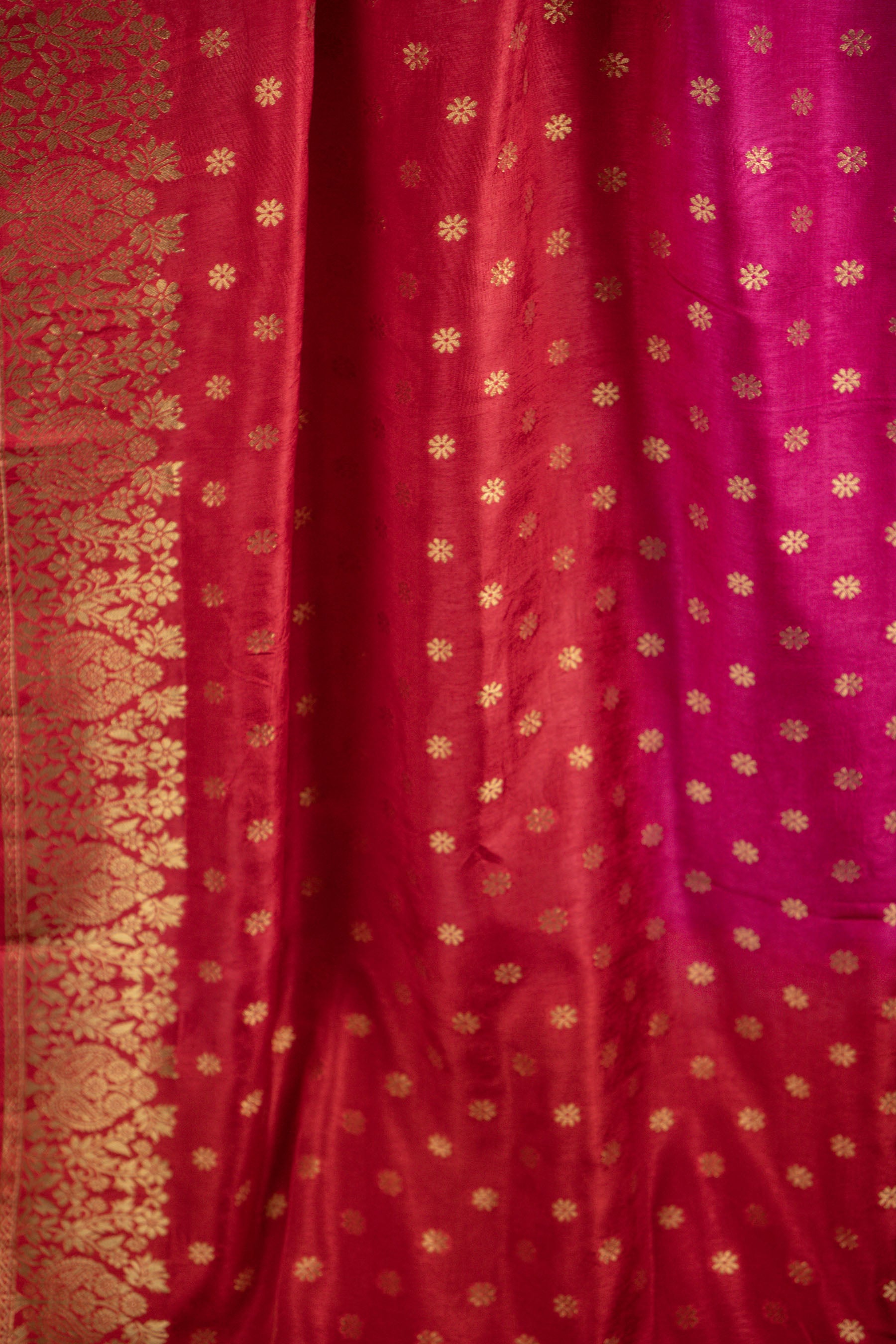 This collection features luxurious Banarasi Art Silk Dupattas known for their rich colors and intricate gold zari weaving. The Art Silk fabric offers a wonderful sheen and a flattering drape, making these dupattas ideal for festive and celebratory wear. The designs showcased include a vibrant Ombre Red and Pink style with scattered floral butis across the fabric. Also featured are a bright Rani Pink with an elaborate diamond jaal pattern, and a deep Magenta with diagonal floral vines. Another distinct style is the Coral Red dupatta featuring an all-over classic floral and vine design. All dupattas are characterized by their traditional, heavy gold zari borders and richly woven pallus, often finished with matching tassels, embodying the timeless craftsmanship of Banarasi weaving.