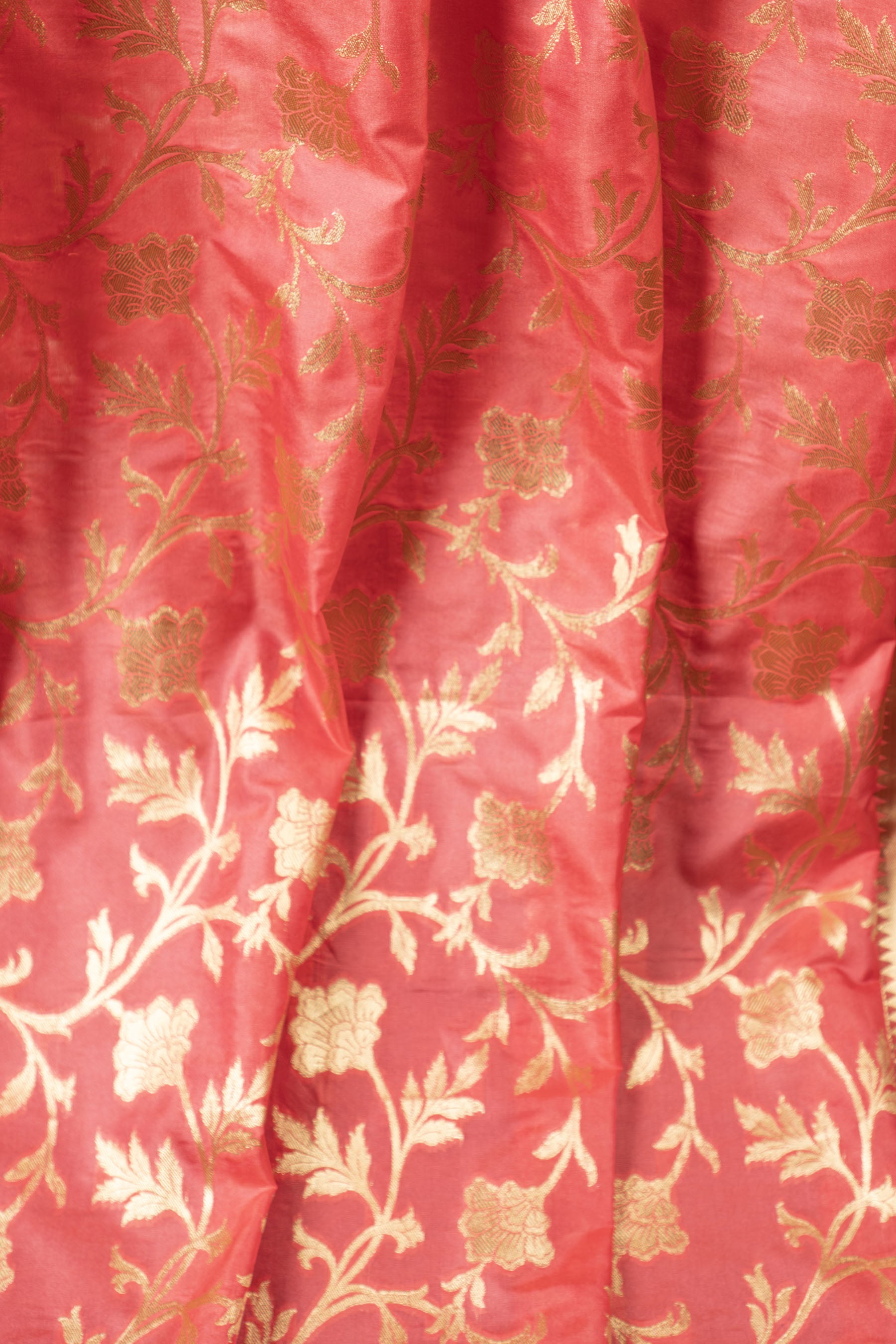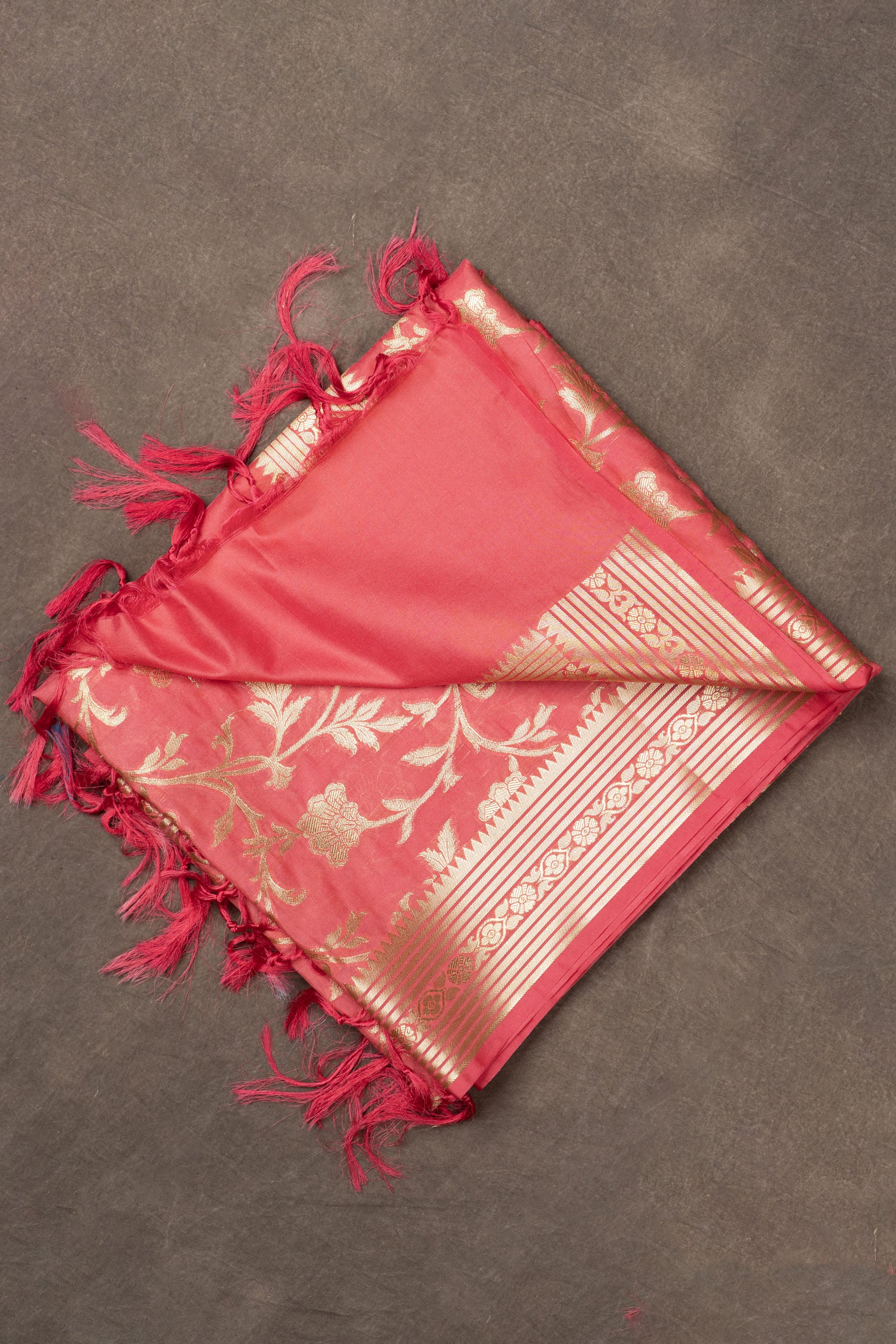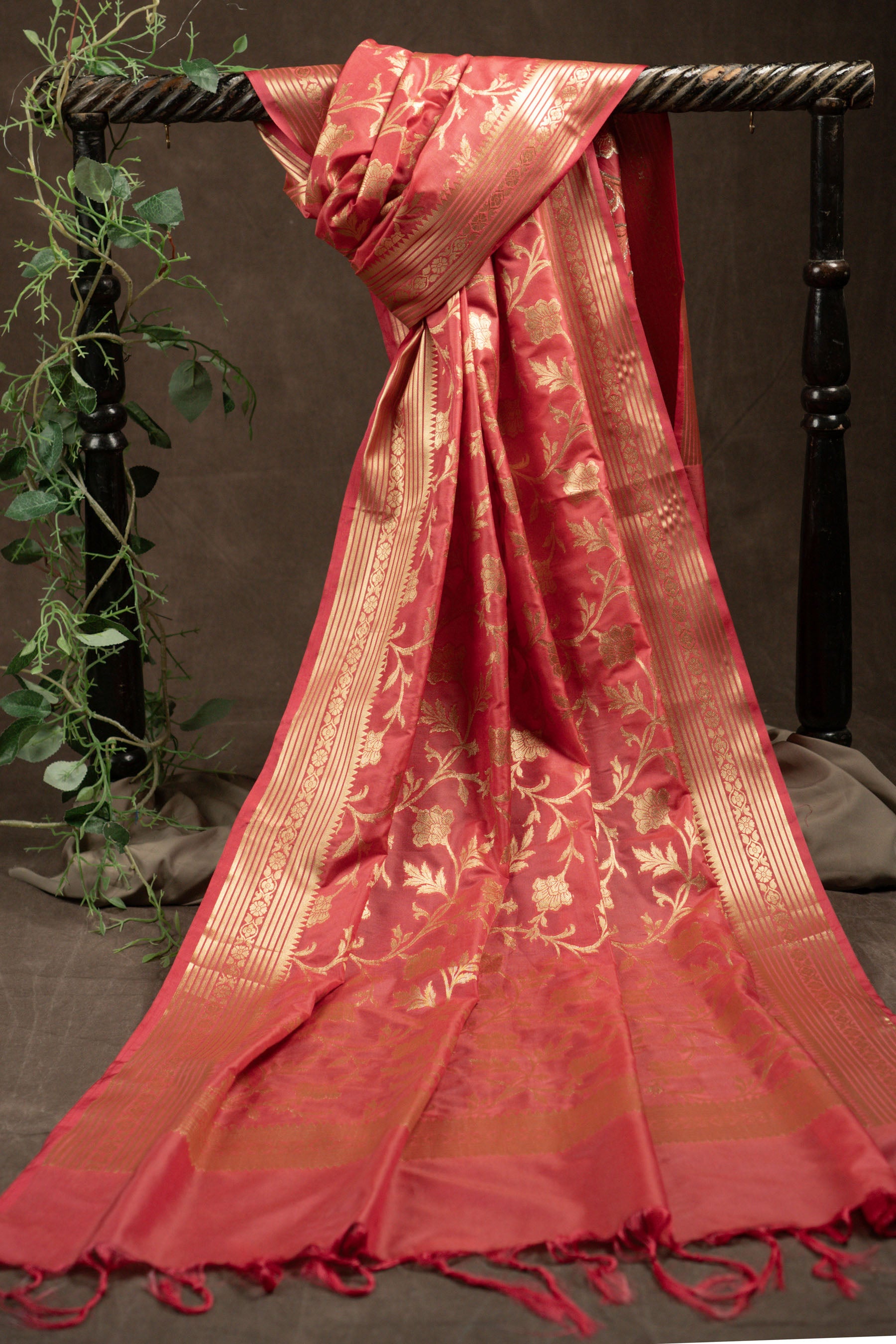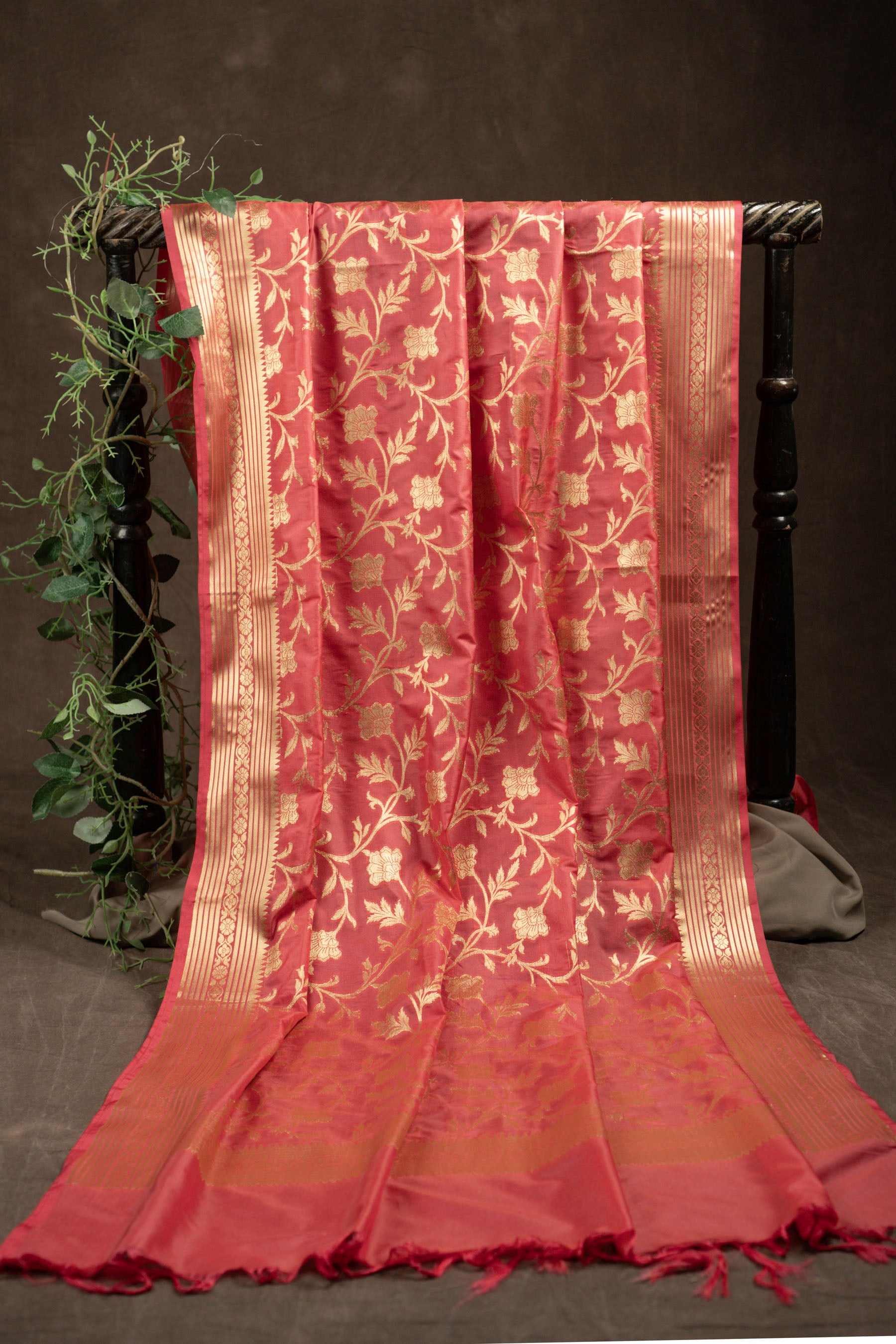 Coral Red Banarasi Art Silk Dupatta with All Over Gold Floral Zari Weaving