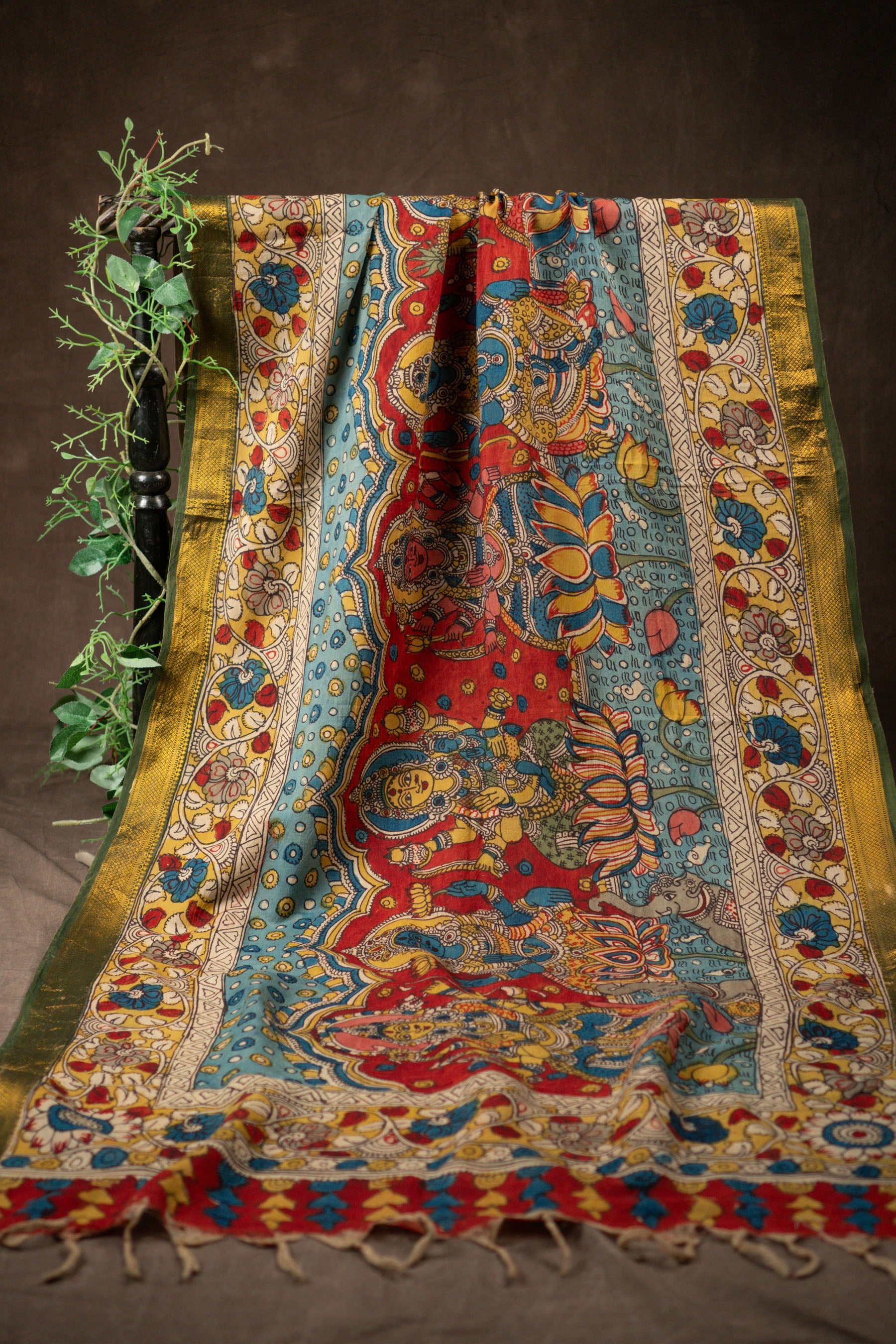 This vibrant Hand Kalamkari Chennuri Silk Dupatta is crafted from lightweight and breathable Chennuri silk fabric, offering excellent drape and comfort. It features a striking yellow base color adorned with traditional hand painted and hand printed floral motifs in shades of coral, deep orange, and teal green, depicting graceful vines and blossoms. The dupatta is framed by elegant borders with geometric patterns and finished with a delicate silver selvedge and natural tassels. This piece is a perfect fusion of traditional Indian artistry and contemporary style