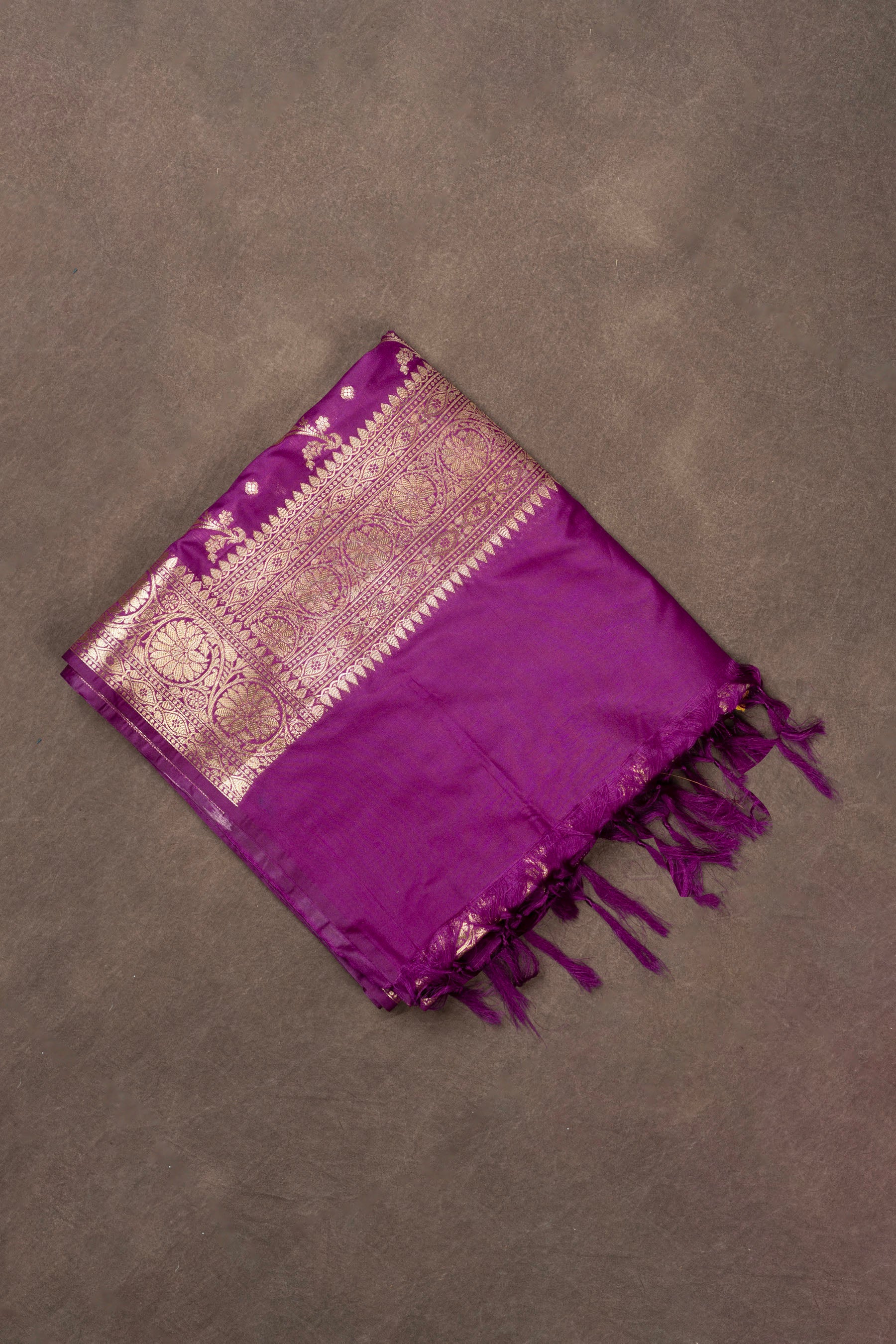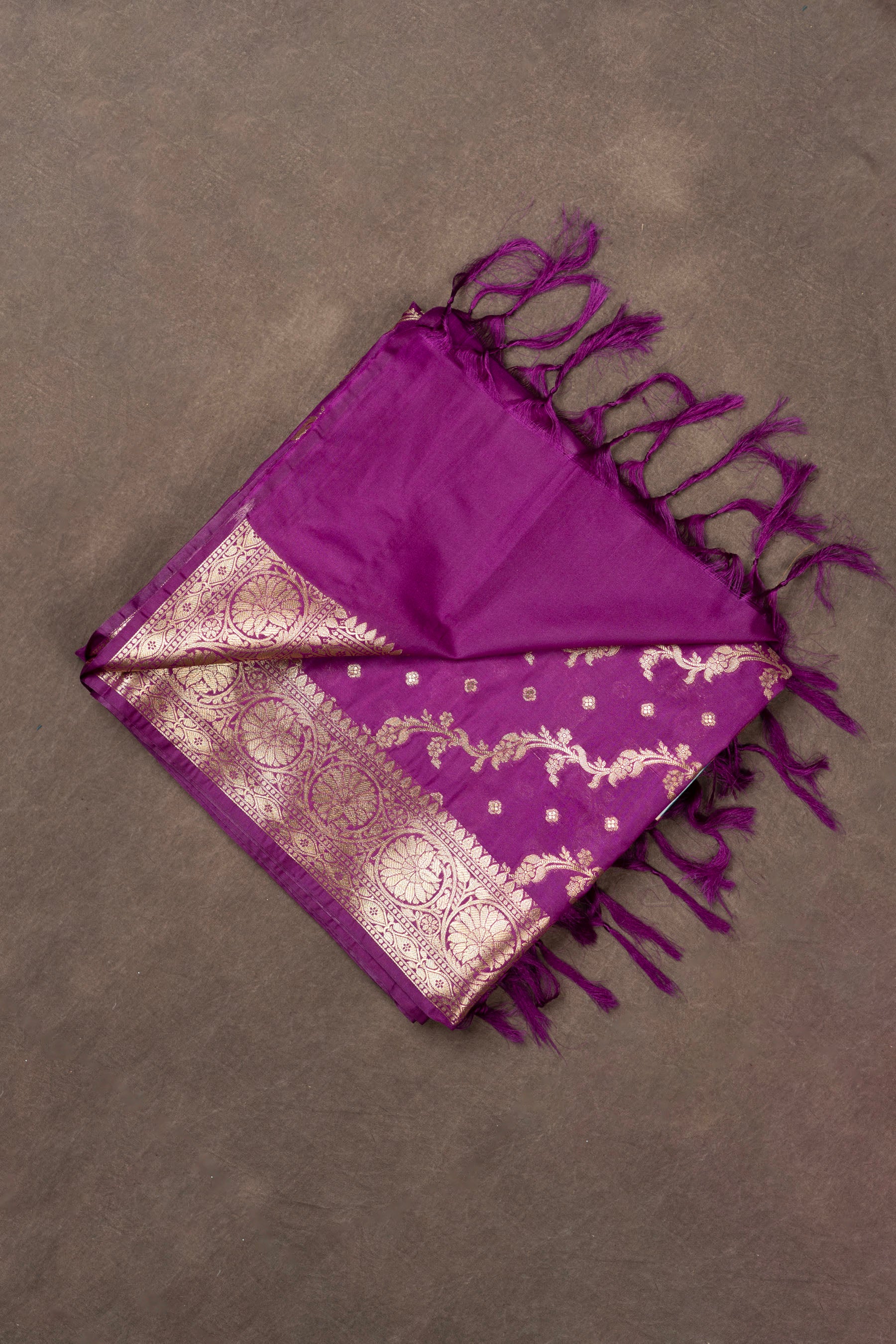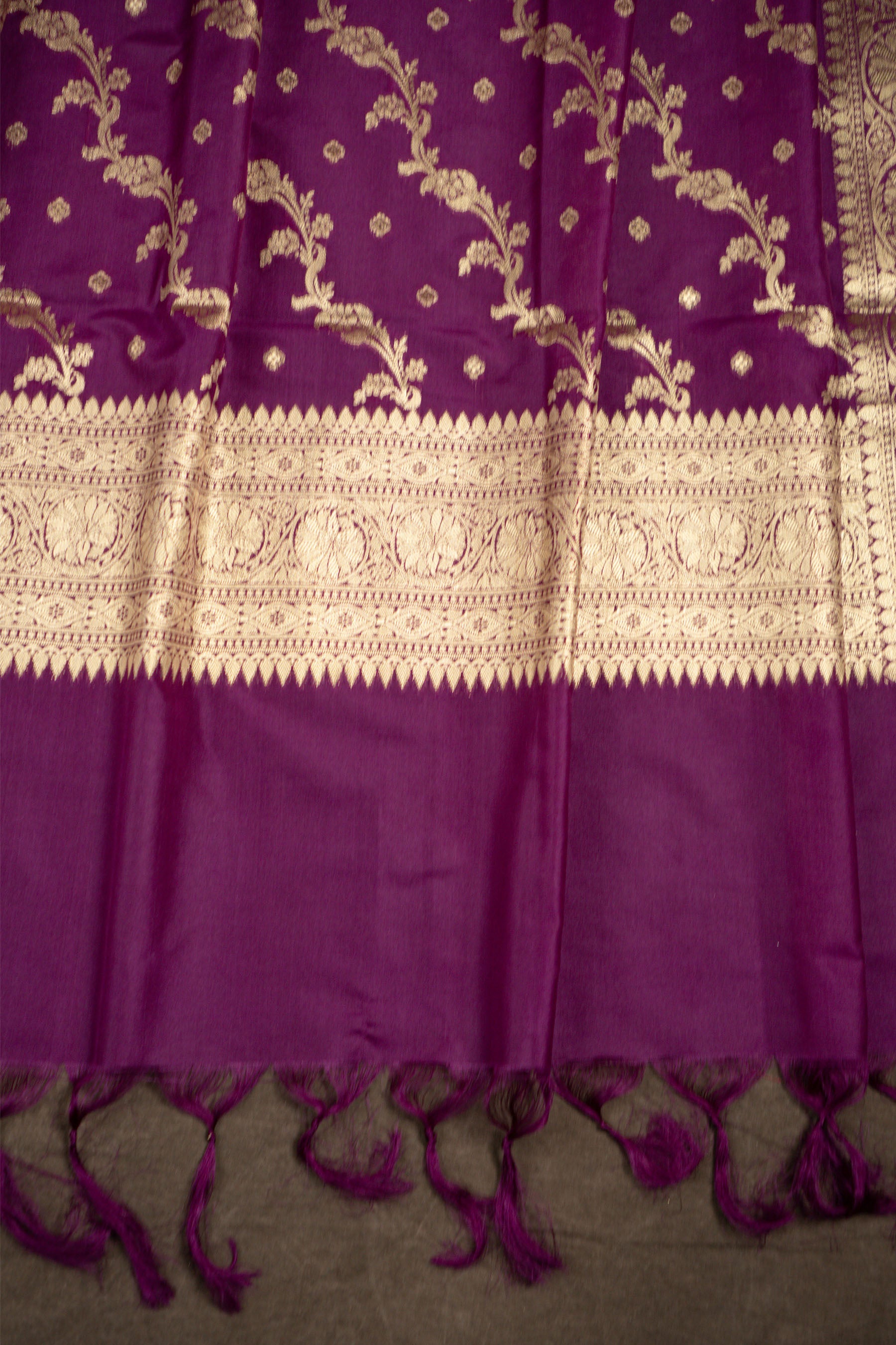 This rich Magenta Banarasi Art Silk Dupatta is a luxurious accessory defined by its striking gold zari work and vibrant color. The body of the dupatta features an exquisite, all over pattern of diagonal, flowing floral or vine motifs, interspersed with small gold butis, which gives it a dynamic and elegant look. The Art Silk fabric provides a beautiful sheen and a sophisticated drape. Framing the dupatta are wide, elaborately woven borders and a heavy pallu, which showcase traditional Banarasi patterns like intricate medallions and geometric bands in dazzling gold zari. The ends of the dupatta are finished with matching fabric tassels, lending a perfect traditional touch to this opulent piece, making it ideal for celebratory occasions.