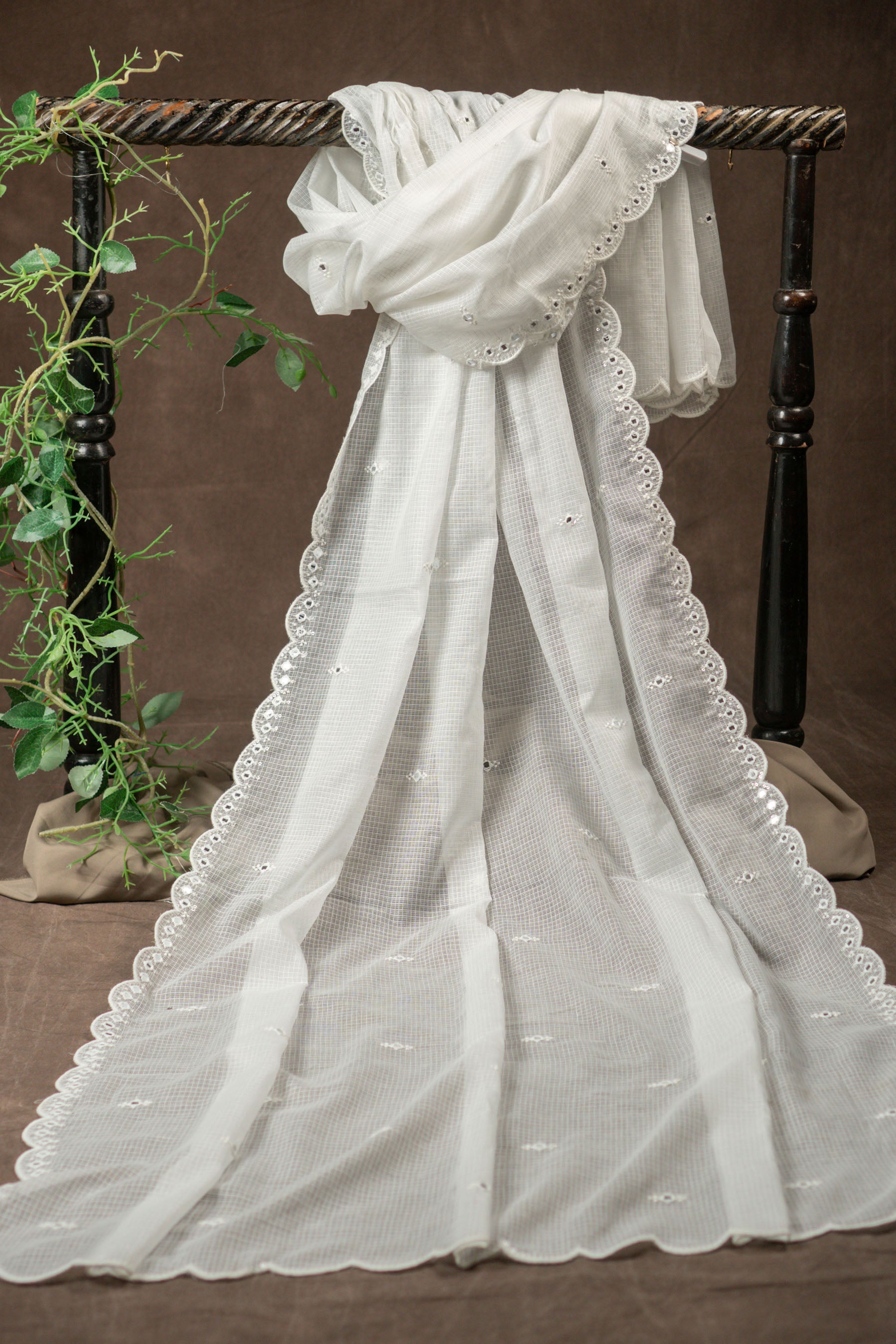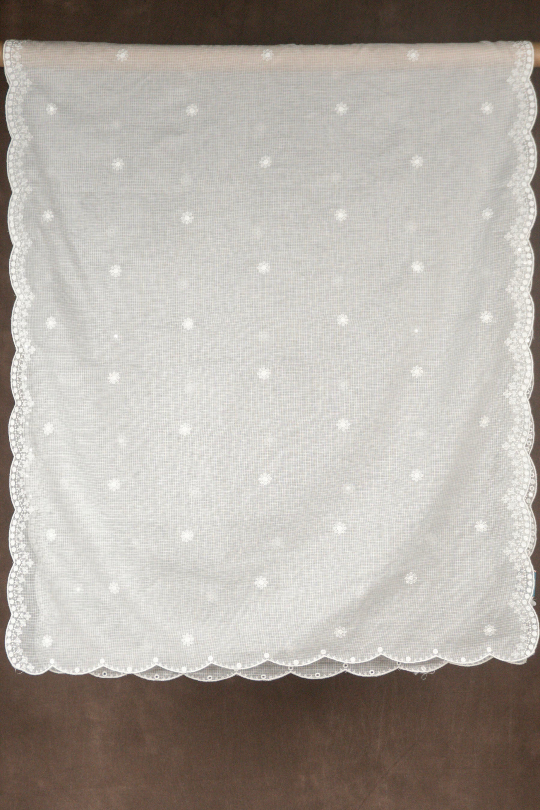 White Kota Doria Dupatta Scalloped Mirror Work Embroidery