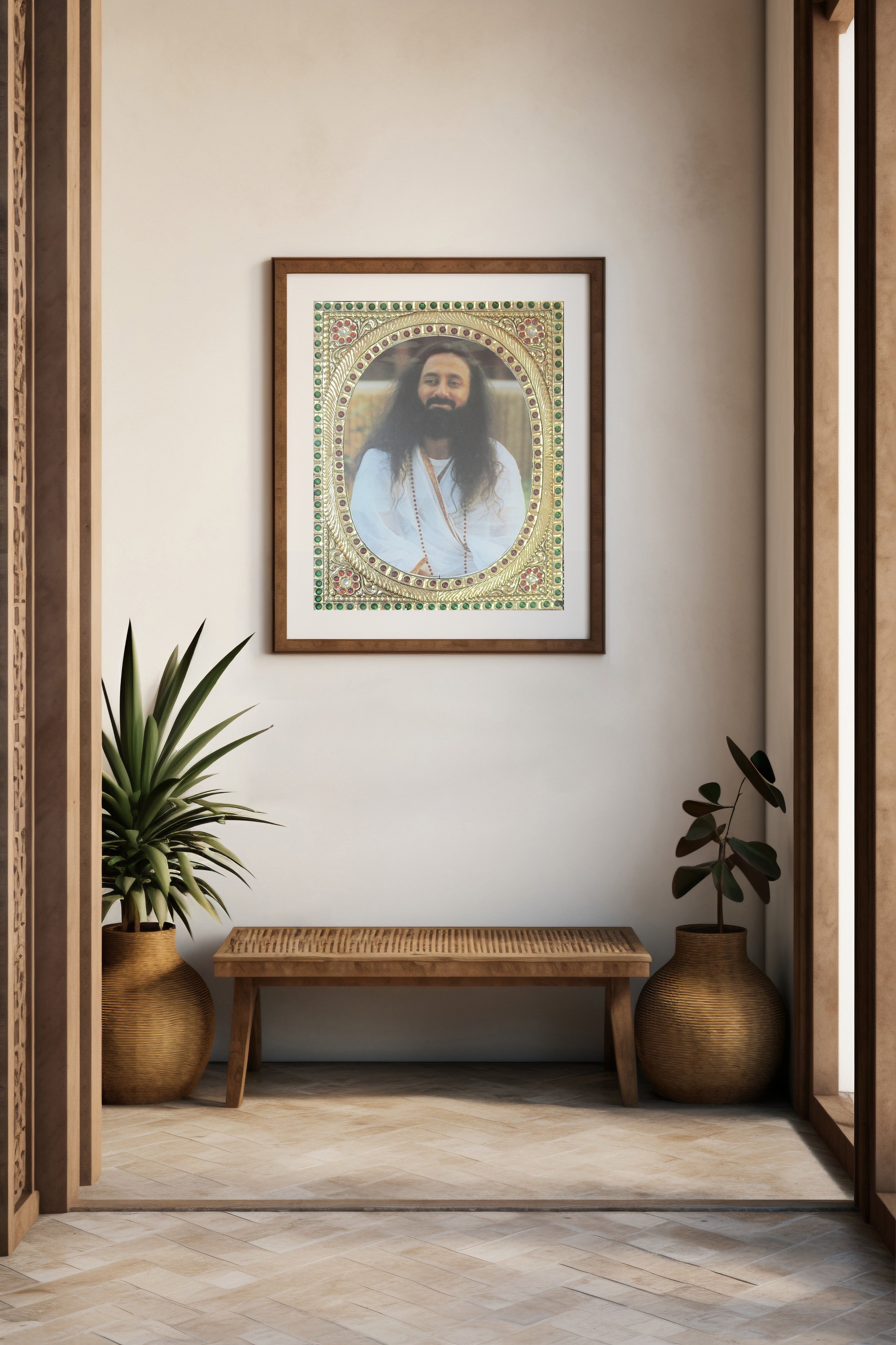 Behold the serene presence of Gurudev Sri Sri Ravi Shankar Ji, beautifully encapsulated in this exquisite Tanjore painting. Framed by a captivatingly ornate 22-carat gold leaf border, the artwork radiates a divine glow, characteristic of traditional Tanjore art. The intricate Gesso work and vibrant hues bring Gurudev's compassionate smile and tranquil demeanor to life. Each detail, from the rich embellishments to the delicate brushstrokes, reflects the spiritual depth and artistic mastery of the craftsmen. This sacred piece is an ideal focal point for your meditation space, home altar, or living room, inviting peace, positive energy, and spiritual harmony into your surroundings. A true masterpiece for devotees and art connoisseurs.