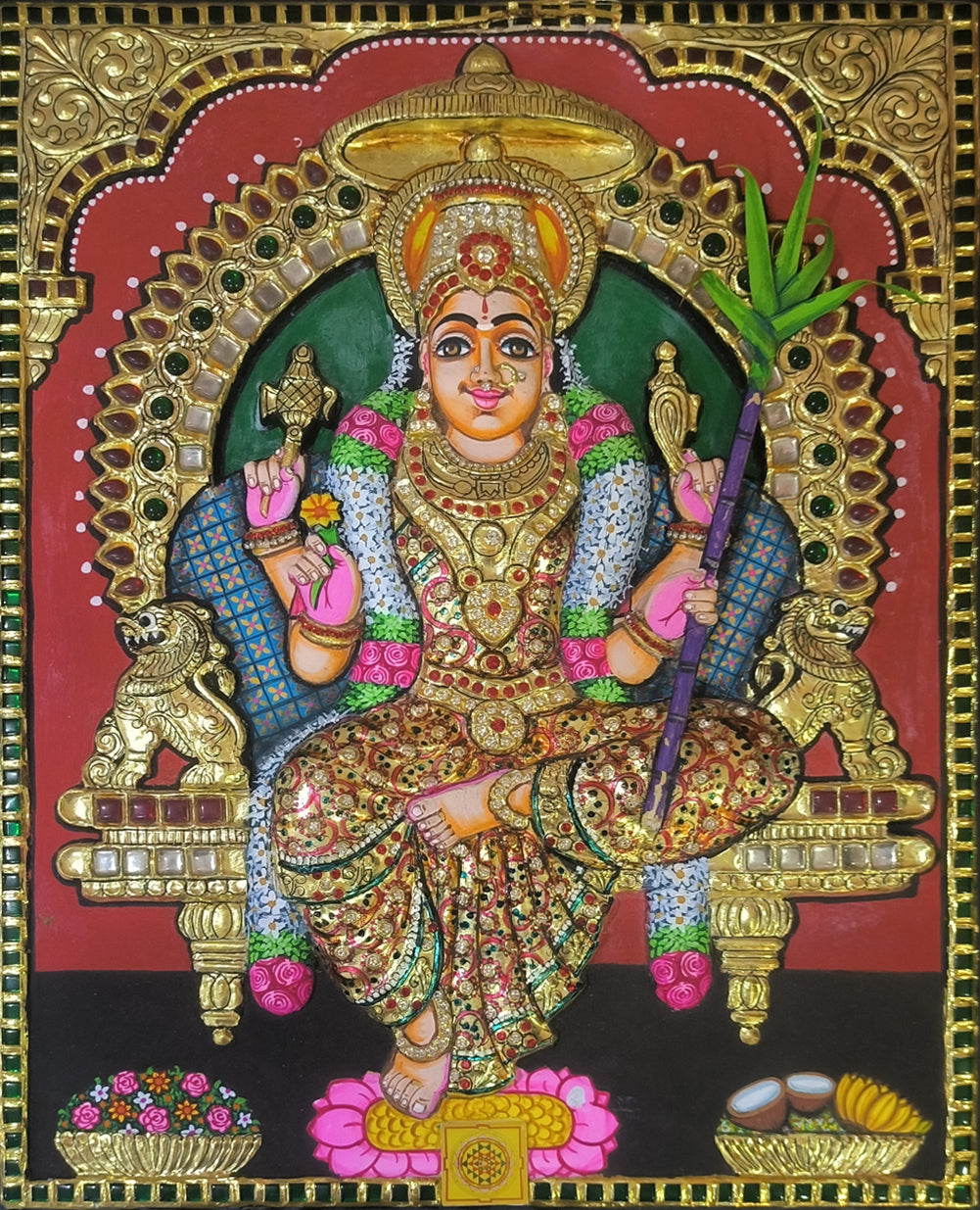 Experience the spiritual grandeur of Goddess Kamakshi, the embodiment of love and divine power, through this resplendent Tanjore painting. Every element of this handcrafted artwork, from the intricate patterns to the Goddess's compassionate gaze, is enhanced by the lavish application of 22-carat gold leaf and carefully inlaid semi-precious stones. The raised Gesso work creates a stunning three-dimensional effect, highlighting her symbolic sugarcane bow and floral arrows. This painting is not merely a decorative piece; it is a vibrant testament to ancient Indian artistry and a profound symbol of the cosmic feminine energy, perfect for inspiring devotion and tranquility in any setting.