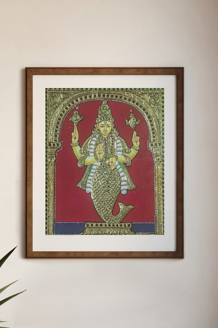 Embrace divine protection and prosperity with this magnificent Handcrafted Matsya Avatar Tanjore Painting, a stunning representation of traditional South Indian artistry. This exquisite artwork depicts Lord Vishnu in his first incarnation, Matsya Avatar, beautifully rendered in the classic Tanjore style with his distinctive fish lower body, conch, and chakra. Meticulously crafted, the painting features a striking red background, vibrant colors, and intricate details enhanced by authentic 22K gold foil work and delicate gesso work, which create a beautiful three-dimensional relief. Perfect for your puja room, living area, or as a profound spiritual gift, this framed Tanjore painting brings divine blessings and cultural elegance into any environment. Each element reflects the devotion and skill of the artisans, making it a unique and timeless piece of devotional art. Ideal for art collectors, spiritual enthusiasts, and those seeking traditional Indian home decor.