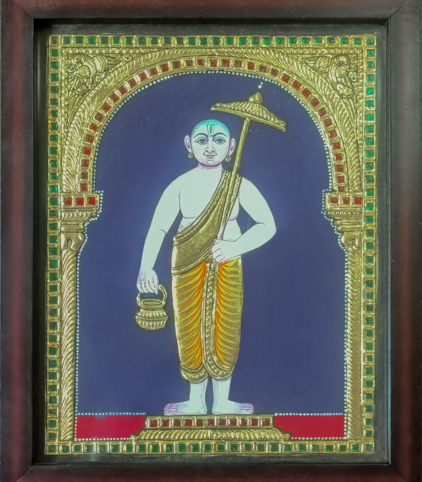 Elevate your spiritual space with this exquisite Handcrafted Saint/Guru Tanjore Painting, a beautiful embodiment of traditional South Indian artistry. This captivating artwork depicts a revered saint or spiritual teacher, adorned with classical attributes and a serene demeanor, rendered in the distinguished Tanjore style. Meticulously crafted, the painting features a rich blue background, vibrant colors, and intricate details highlighted by authentic 22K gold foil work and delicate gesso work, which create a beautiful three-dimensional relief. Perfect for your puja room, meditation space, or as a profound spiritual gift, this framed Tanjore painting brings peace, wisdom, and cultural elegance into any environment. Each element reflects the devotion and skill of the artisans, making it a unique and timeless piece of devotional art. Ideal for art collectors, spiritual enthusiasts, and those seeking traditional Indian home decor.
