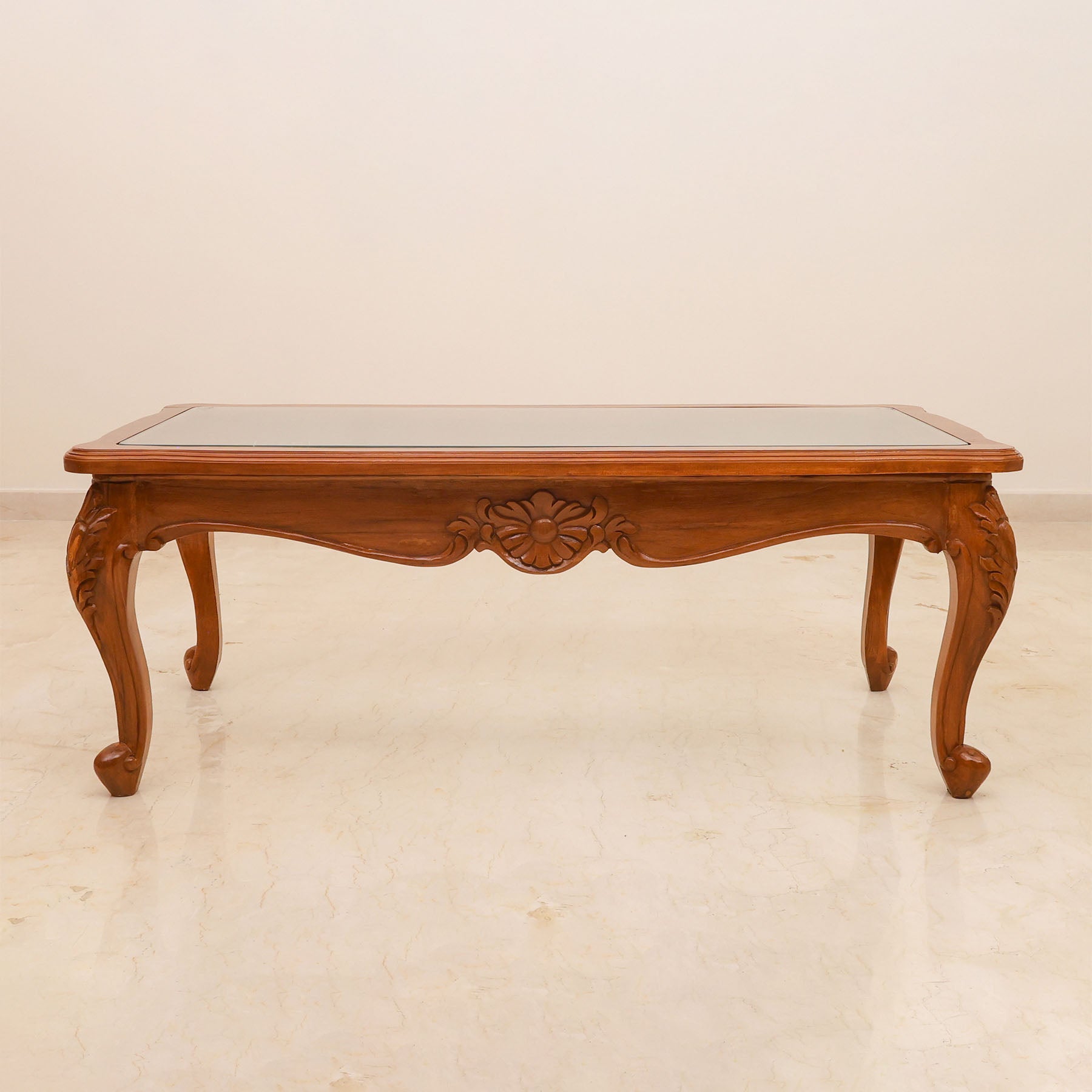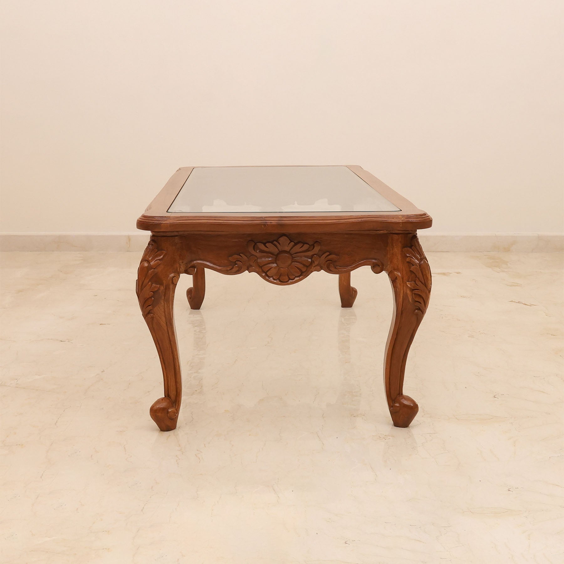 The Antique Style Glass Coffee Table exudes timeless elegance with its clear glass top resting atop a richly carved wooden frame in a warm teak finish. Intricate floral motifs adorn the apron, while graceful cabriole legs with subtle scrolling add a touch of opulent vintage flair, evoking the grandeur of bygone eras. Crafted for both beauty and practicality, the tempered glass surface offers a spacious, easy-to-clean platform ideal for serving beverages, displaying vases, or arranging decorative trays without obstructing the stunning view of the carved base. This heirloom-quality piece blends antique charm with modern durability, making it resistant to daily wear and versatile enough for traditional, Victorian, or fusion interiors. Hand-finished for a lustrous sheen, it elevates any seating arrangement into a sophisticated focal point for your living room.