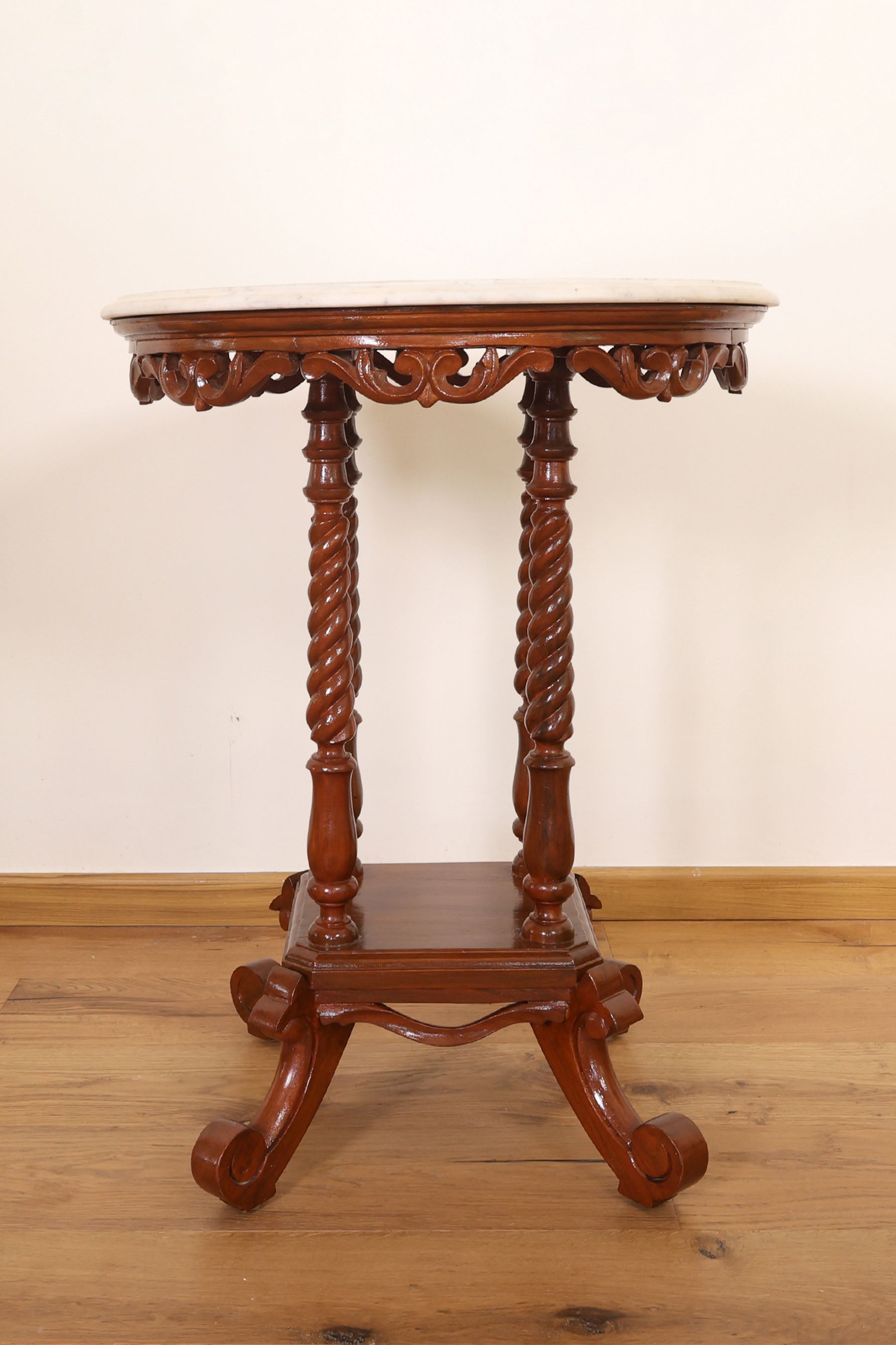 Florentine Marble Top Pedestal with Hand-Carved Teakwood Base & Twisted Column Design