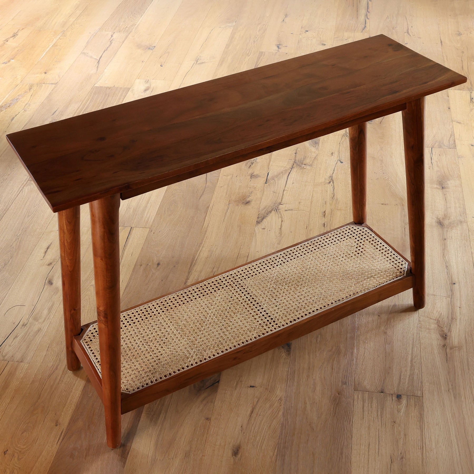 The Wood and Weave Console blends mid-century modern aesthetics with natural craftsmanship, featuring a solid teakwood top in a warm, lustrous finish that highlights beautiful grain patterns. Tapered teak legs provide sturdy elevation, while the woven cane lower shelf offers breathable storage for keys, books, or decorative accents, adding texture and lightness. Ideal for entryways, hallways, or behind sofas, this elongated console creates an inviting focal point without overwhelming the space. Its clean lines and organic materials suit minimalist, bohemian, or transitional decors, ensuring durability against daily use.