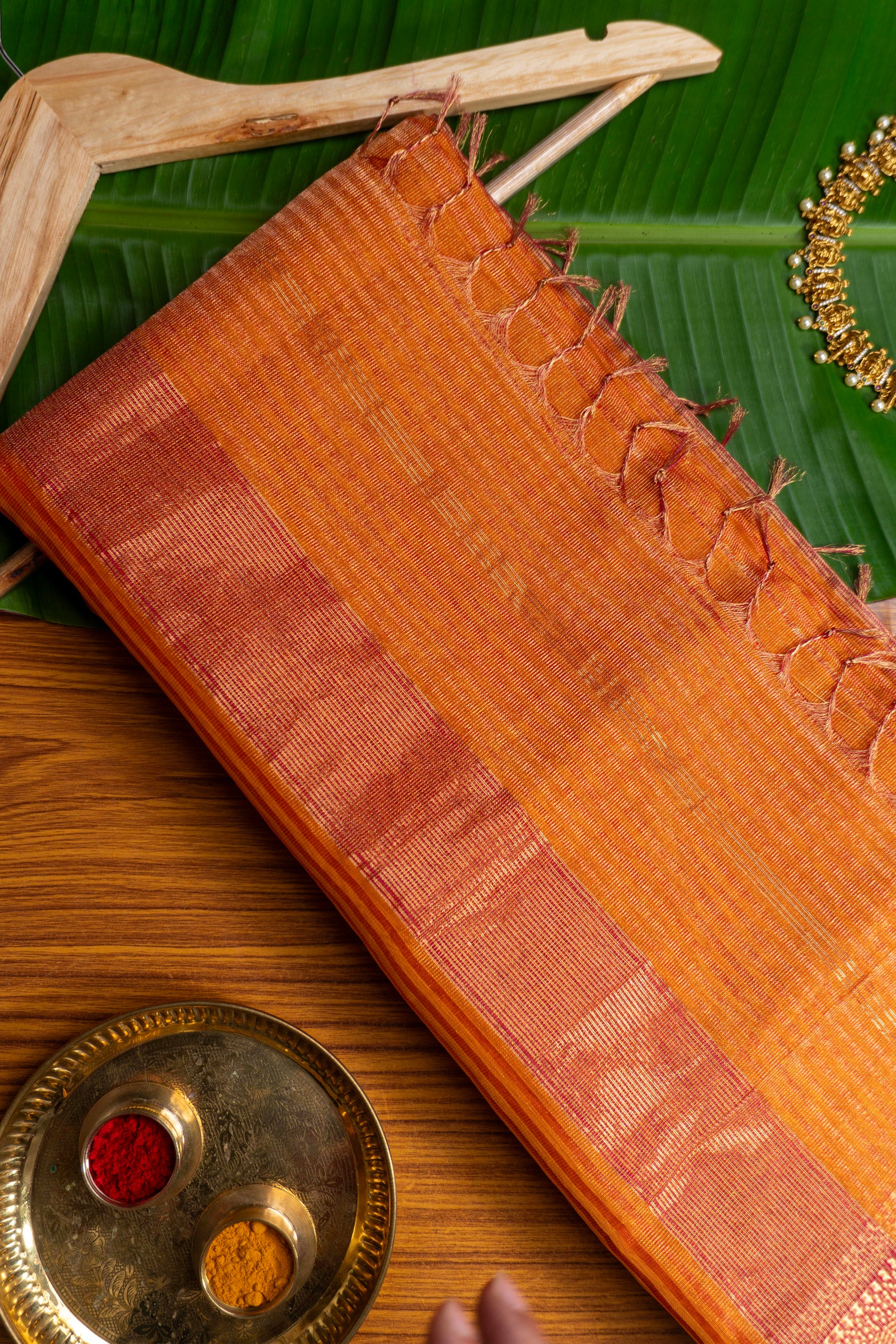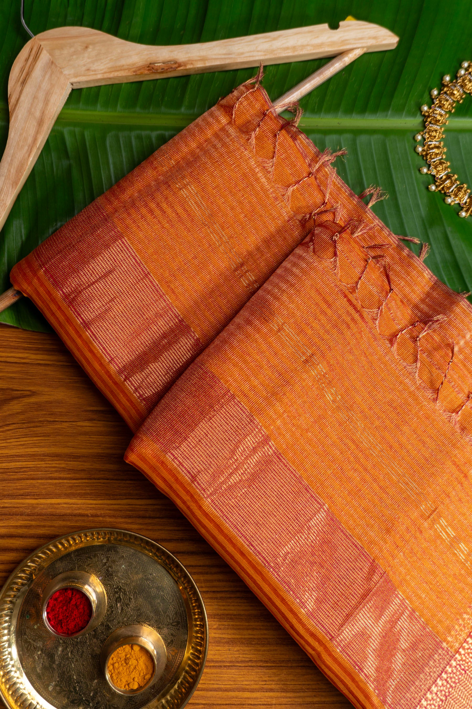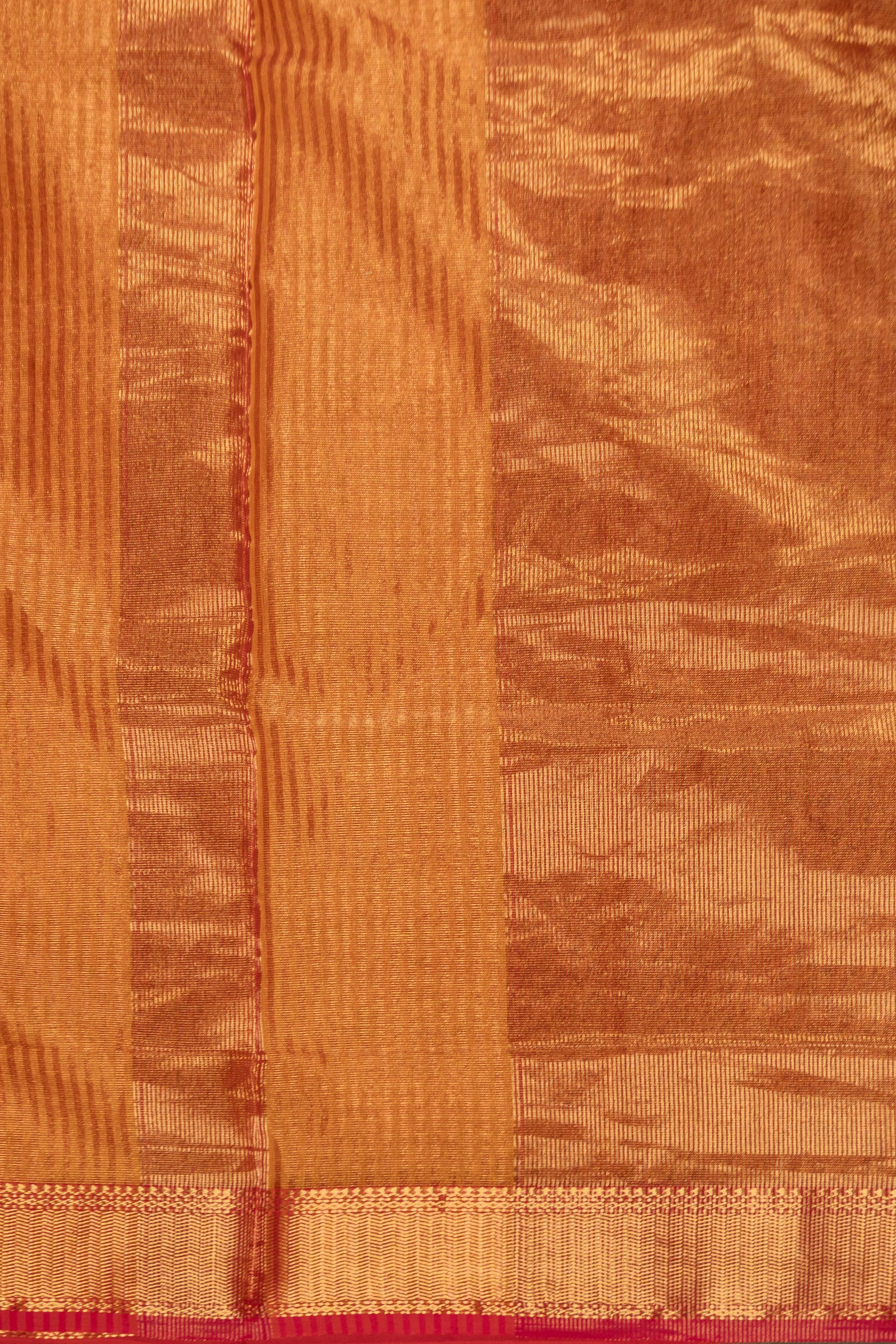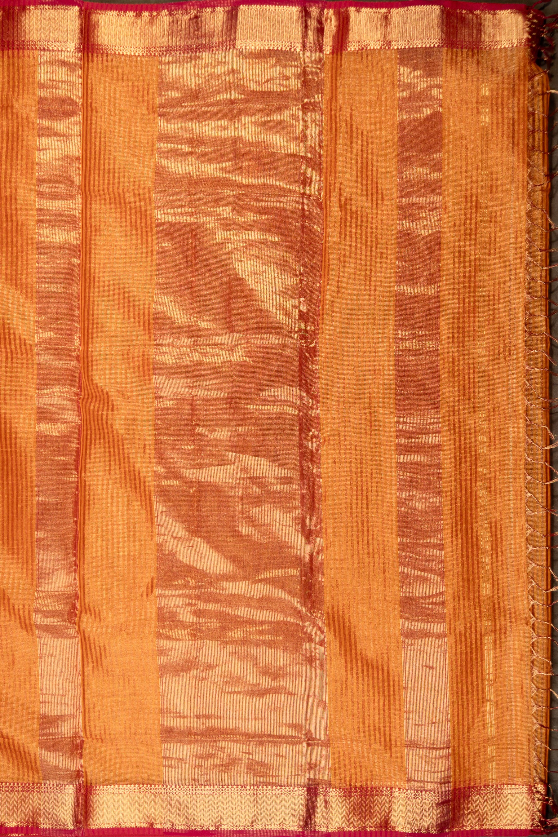 Capture the warmth of the season in this magnificent Maheshwari saree, skillfully handwoven from a luxurious silk-cotton (SICO) blend for a graceful drape and comfortable wear. The body features a rich Burnt Orange hue, interwoven with prominent horizontal Gold Zari stripes and broad bands that create a subtle, luminous texture. A bold contrast is provided by the thin Rani Pink detail seamlessly integrated into the edge of the wide Gold Zari border. This exquisite Burnt Orange and Rani Pink Border Zari Striped Maheshwari Saree is an outstanding choice for festive occasions, traditional gatherings, or formal events, showcasing the authentic heritage and artistry of the handlooms of Maheshwar.