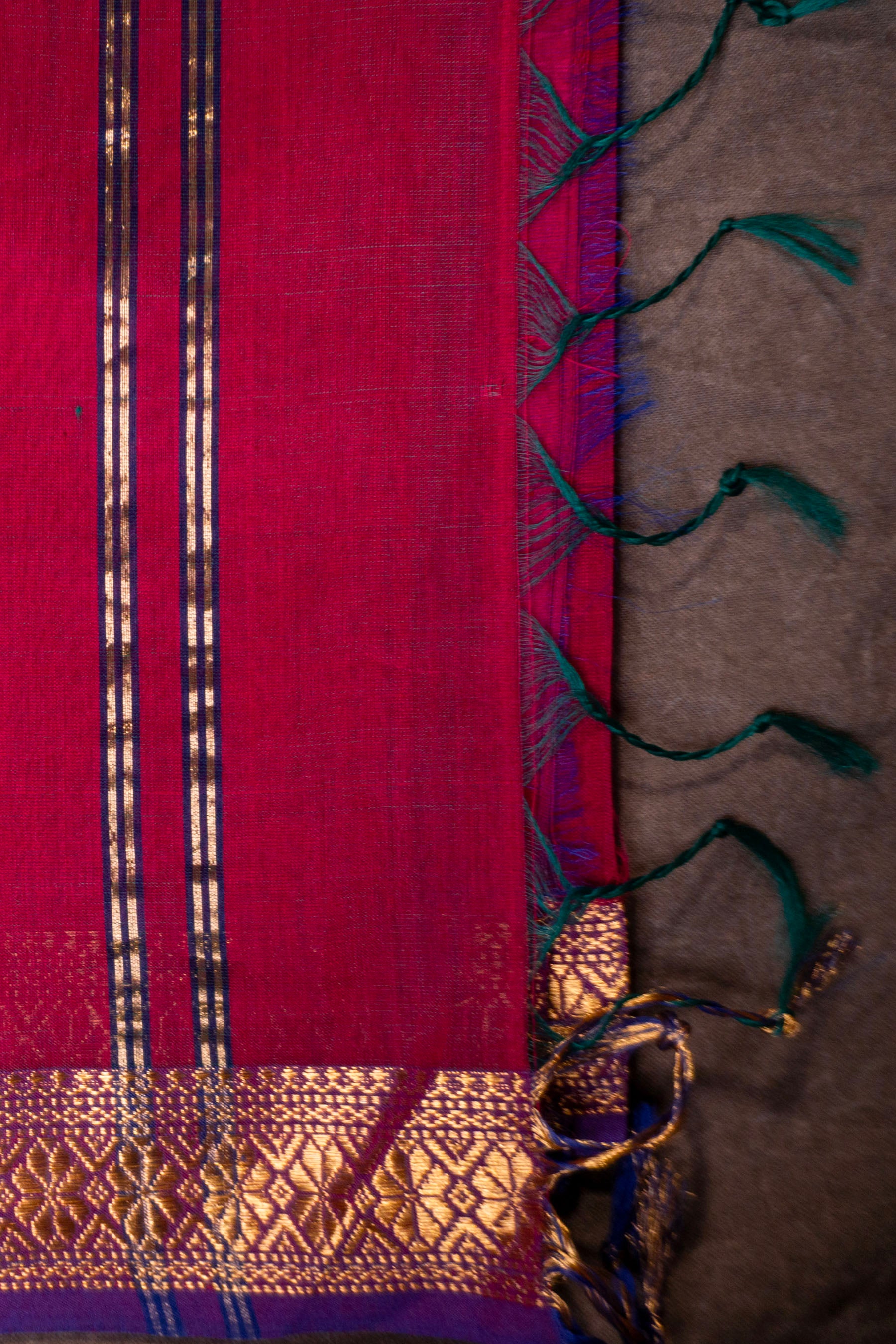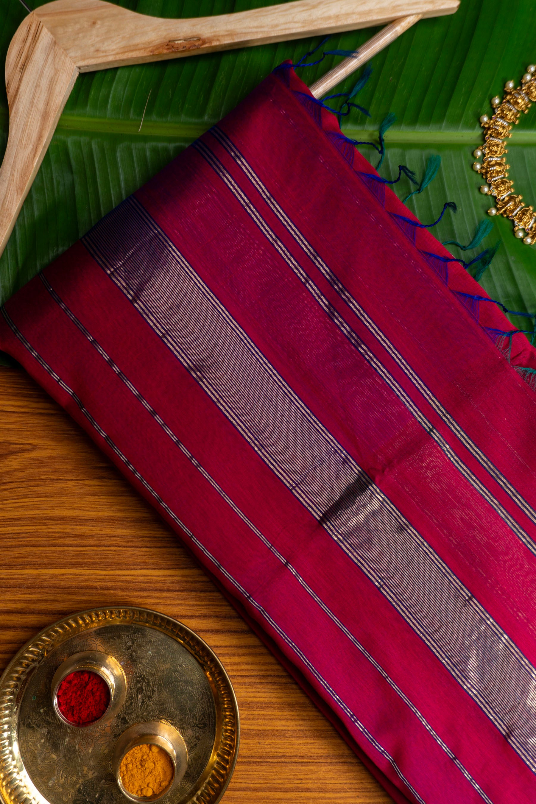 Fuchsia Maroon and Silver Silk Handloom Zari Striped Maheshwari Saree