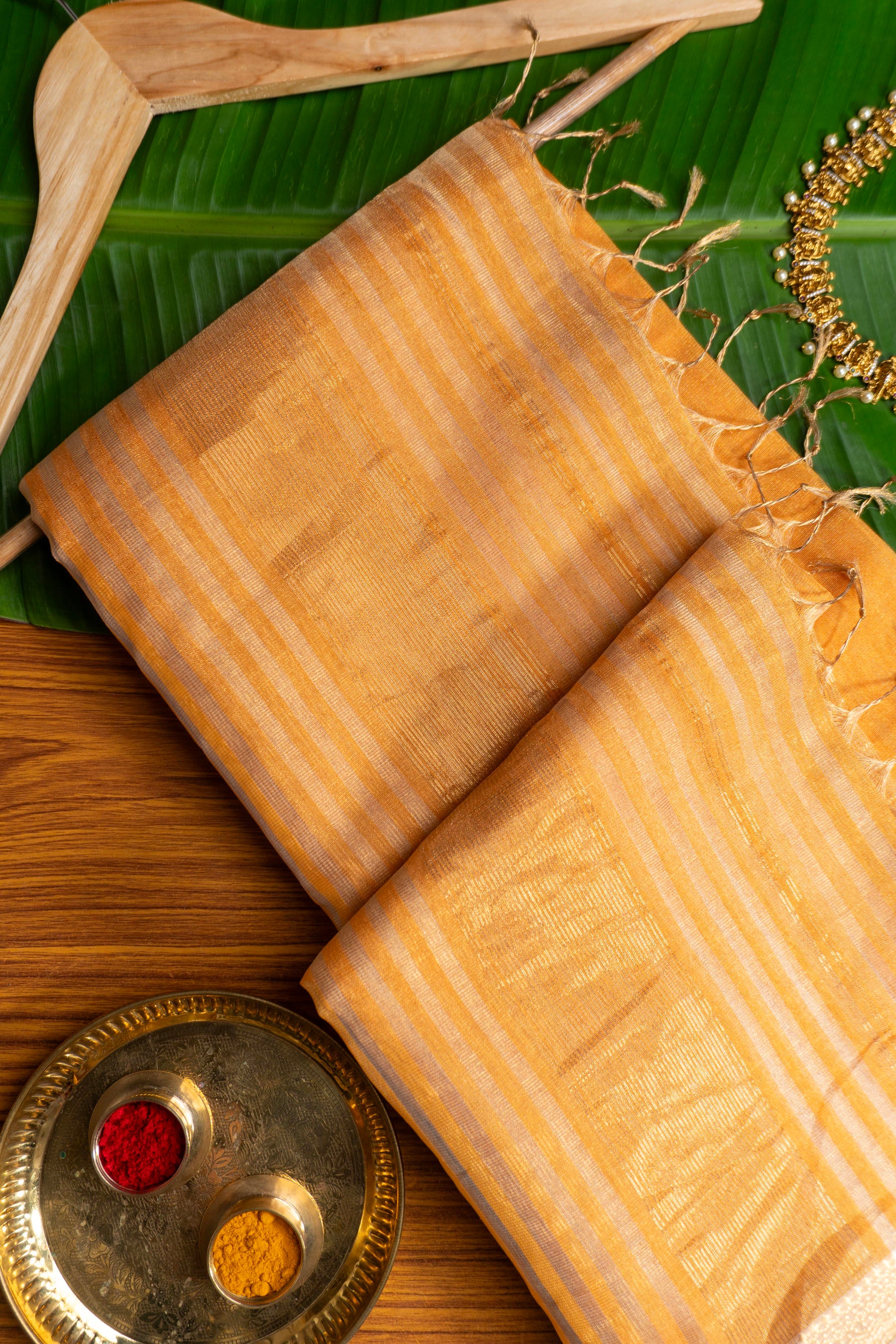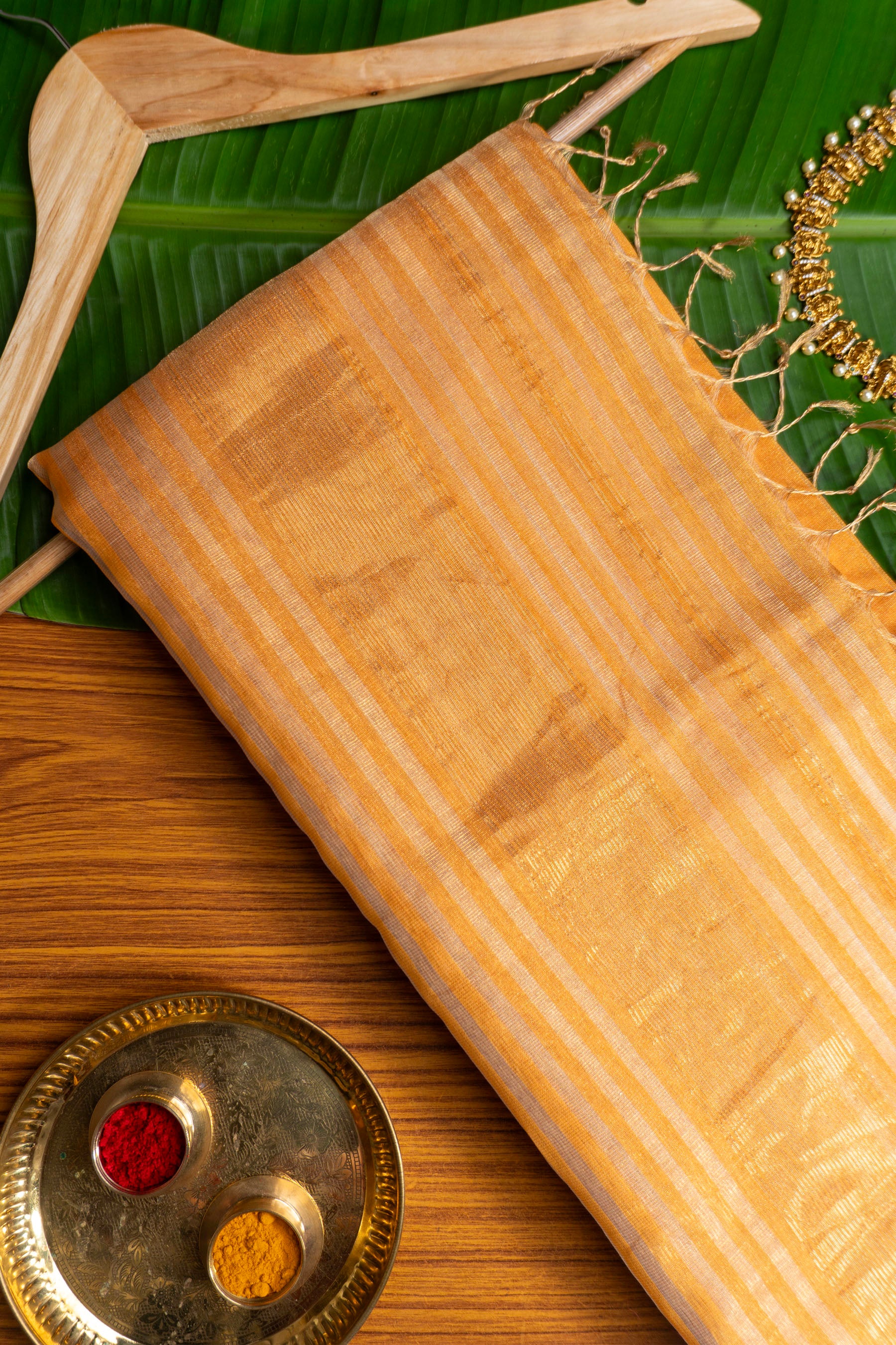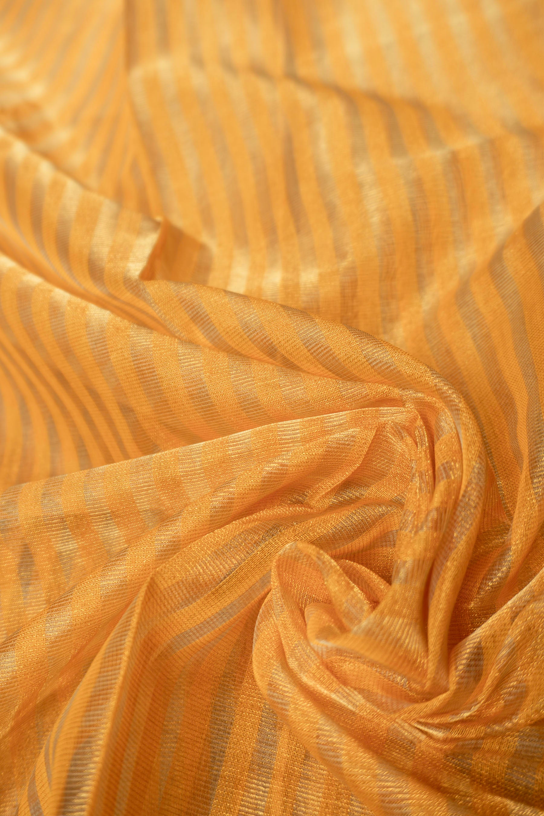 Embrace radiant elegance with this stunning Maheshwari saree, meticulously handwoven from a luxurious silk-cotton (SICO) blend, offering both comfort and a graceful drape. The saree features a vibrant Golden Yellow body, beautifully adorned with shimmering Gold Zari stripes woven horizontally across the fabric, creating a rich and inviting appeal. The pallu showcases an intricate gold chevron pattern, complemented by classic Zari tassels, reflecting the authentic craftsmanship synonymous with Maheshwari weaving. Lightweight and effortlessly charming, this Golden Yellow and Gold Zari Striped Maheshwari Saree is a perfect choice for festive celebrations, special occasions, or adding a touch of traditional glamour to your wardrobe.