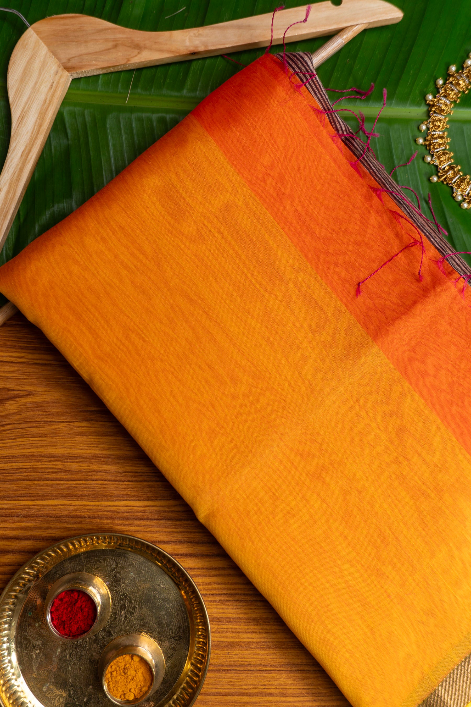 Orange Yellow Silk Cotton Handloom Dual Tone Color Block Maheshwari Saree