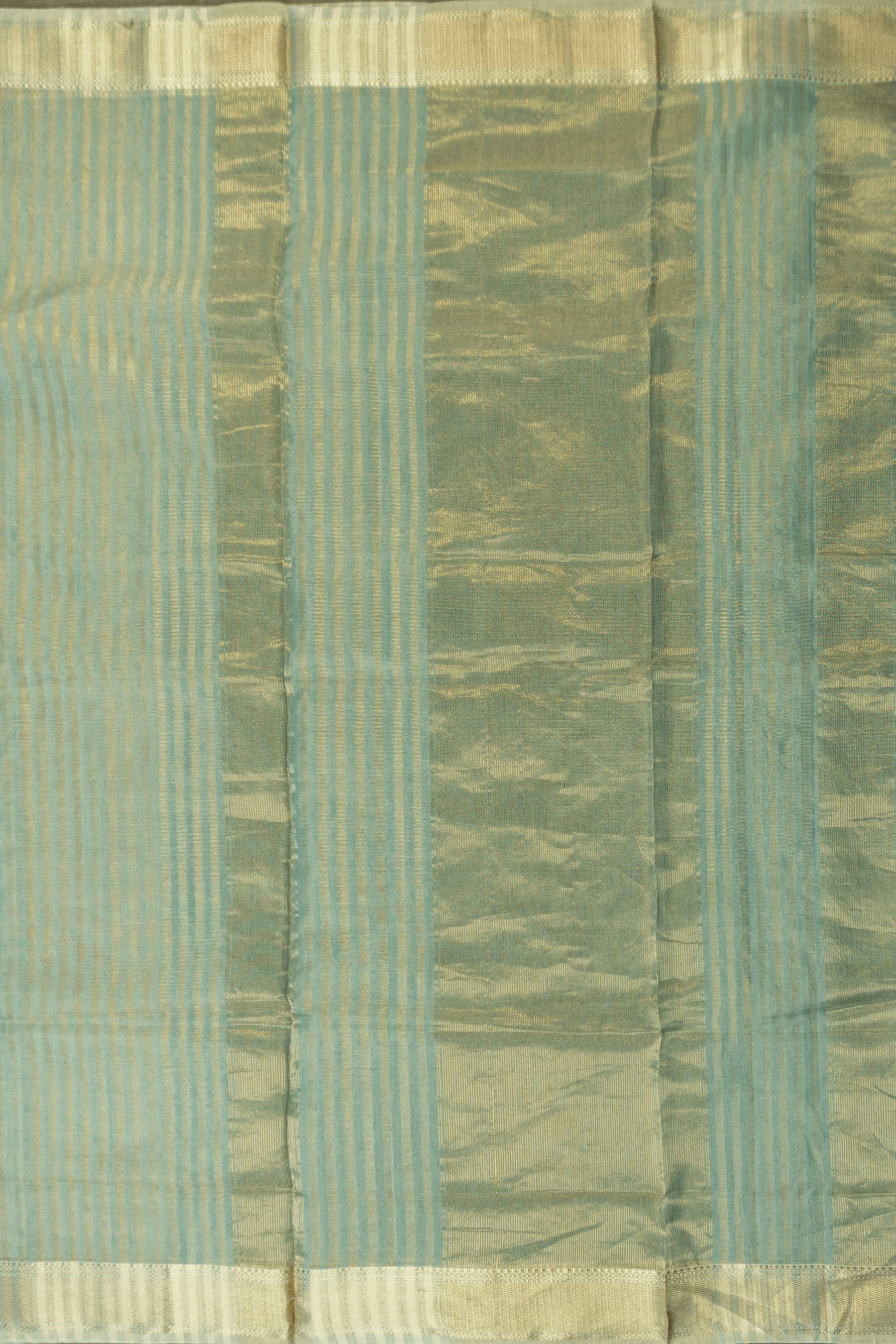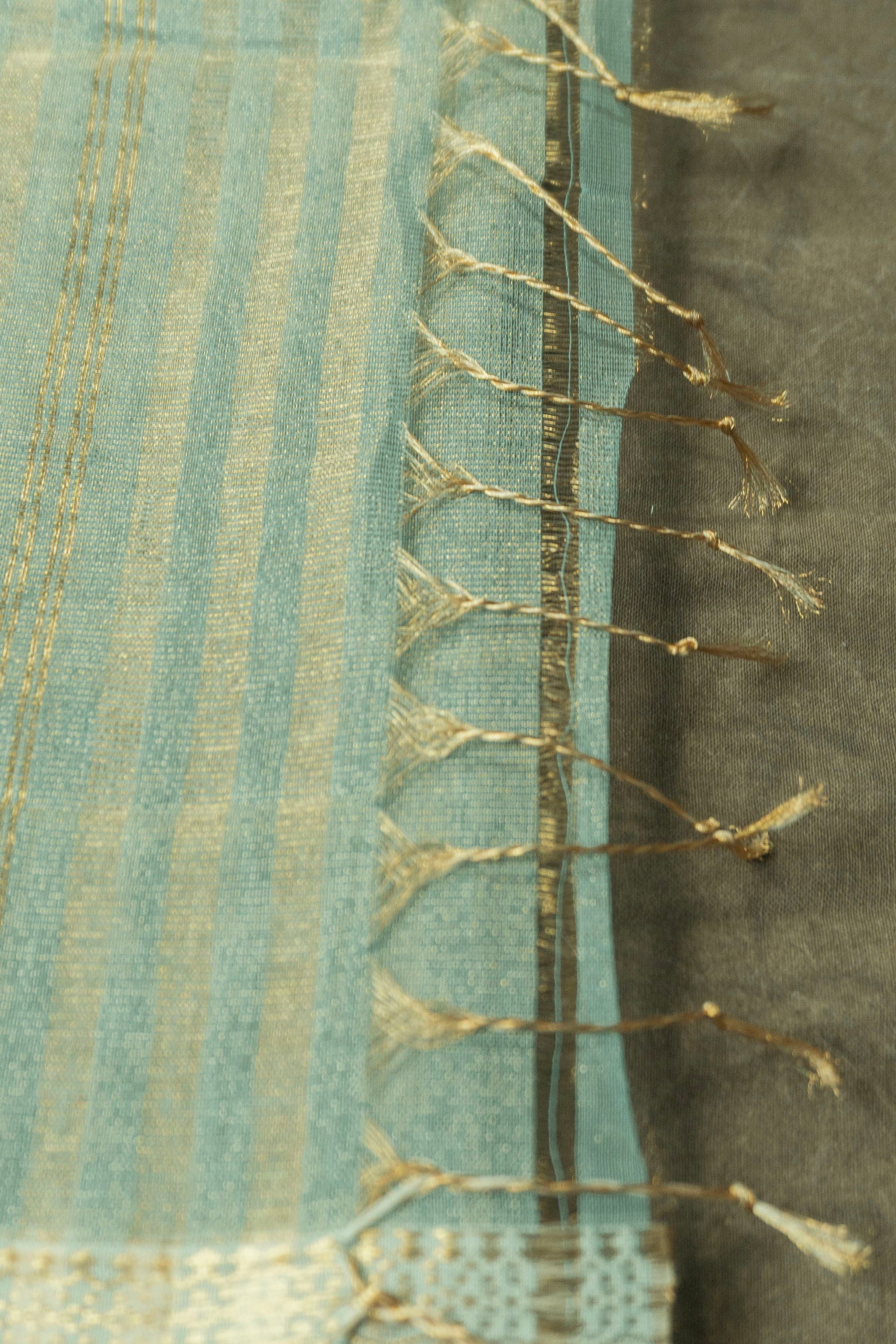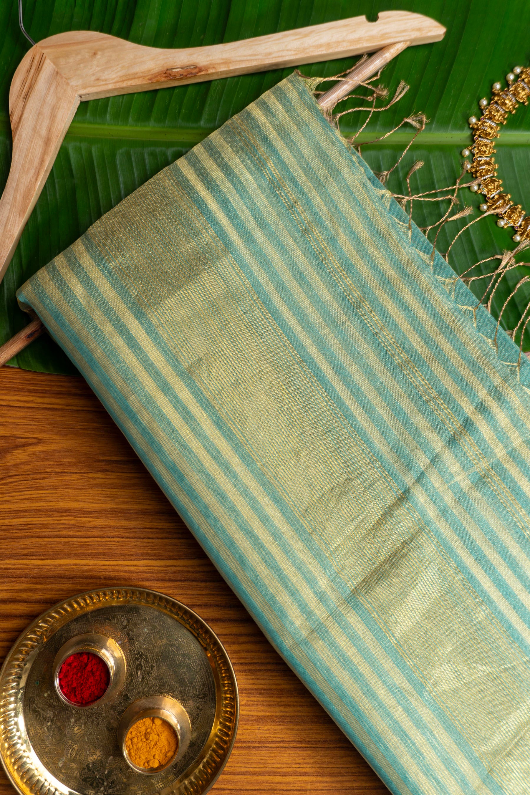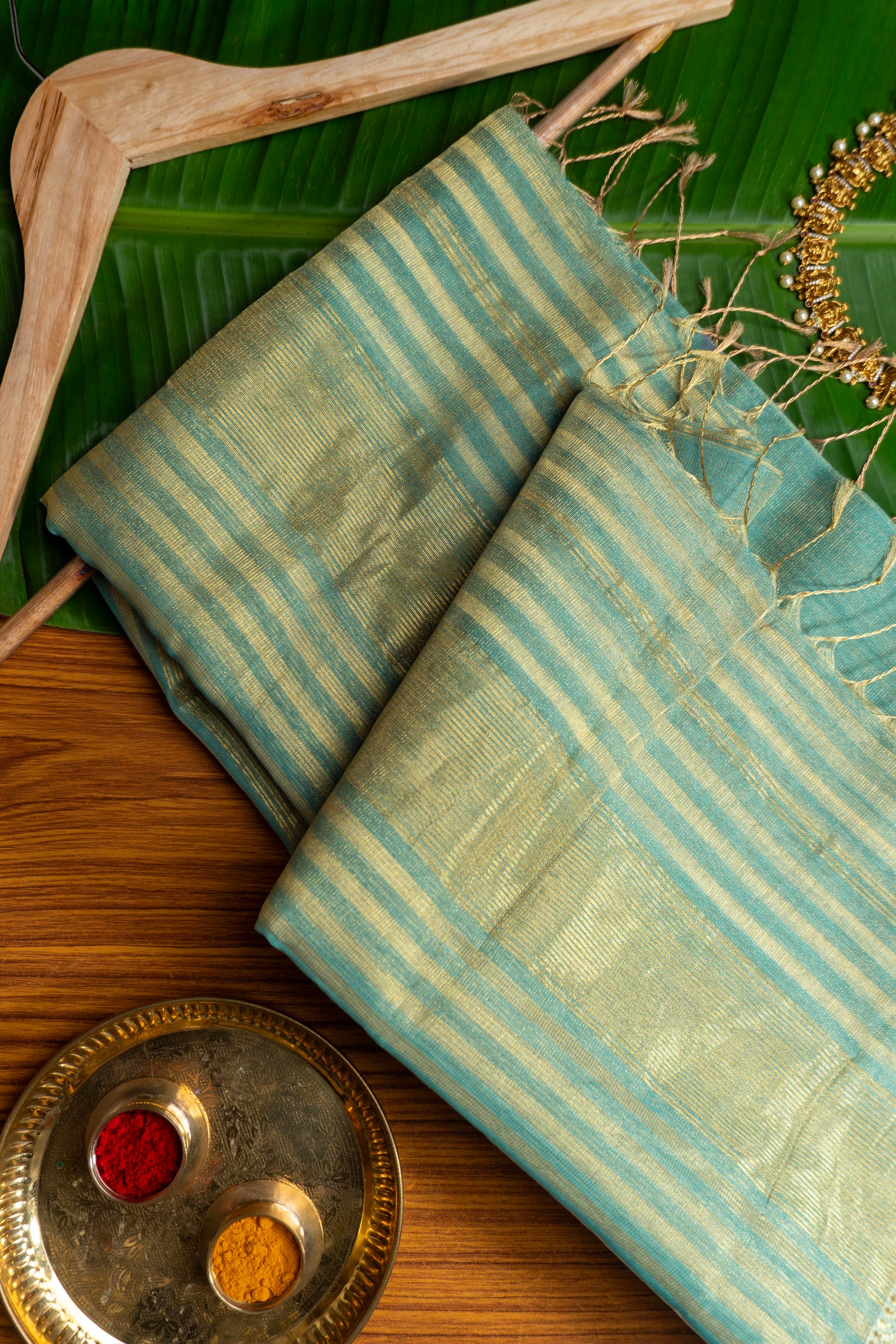Seafoam Green and Gold Silk Cotton Handloom Zari Striped Maheshwari Saree