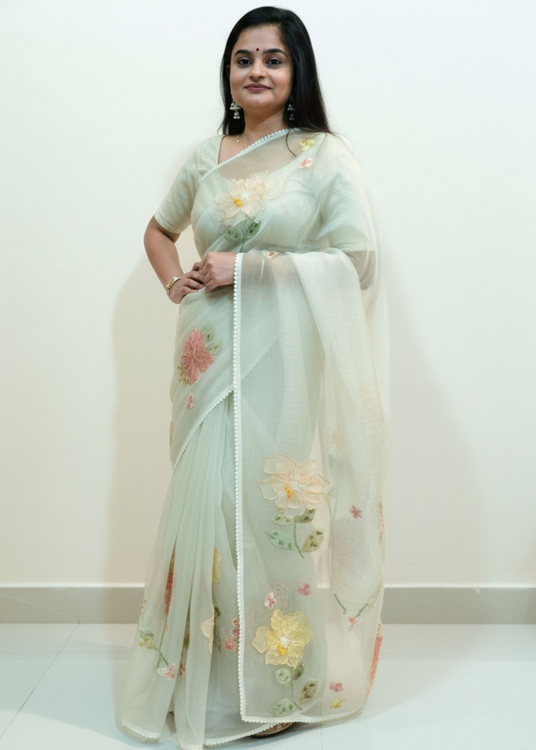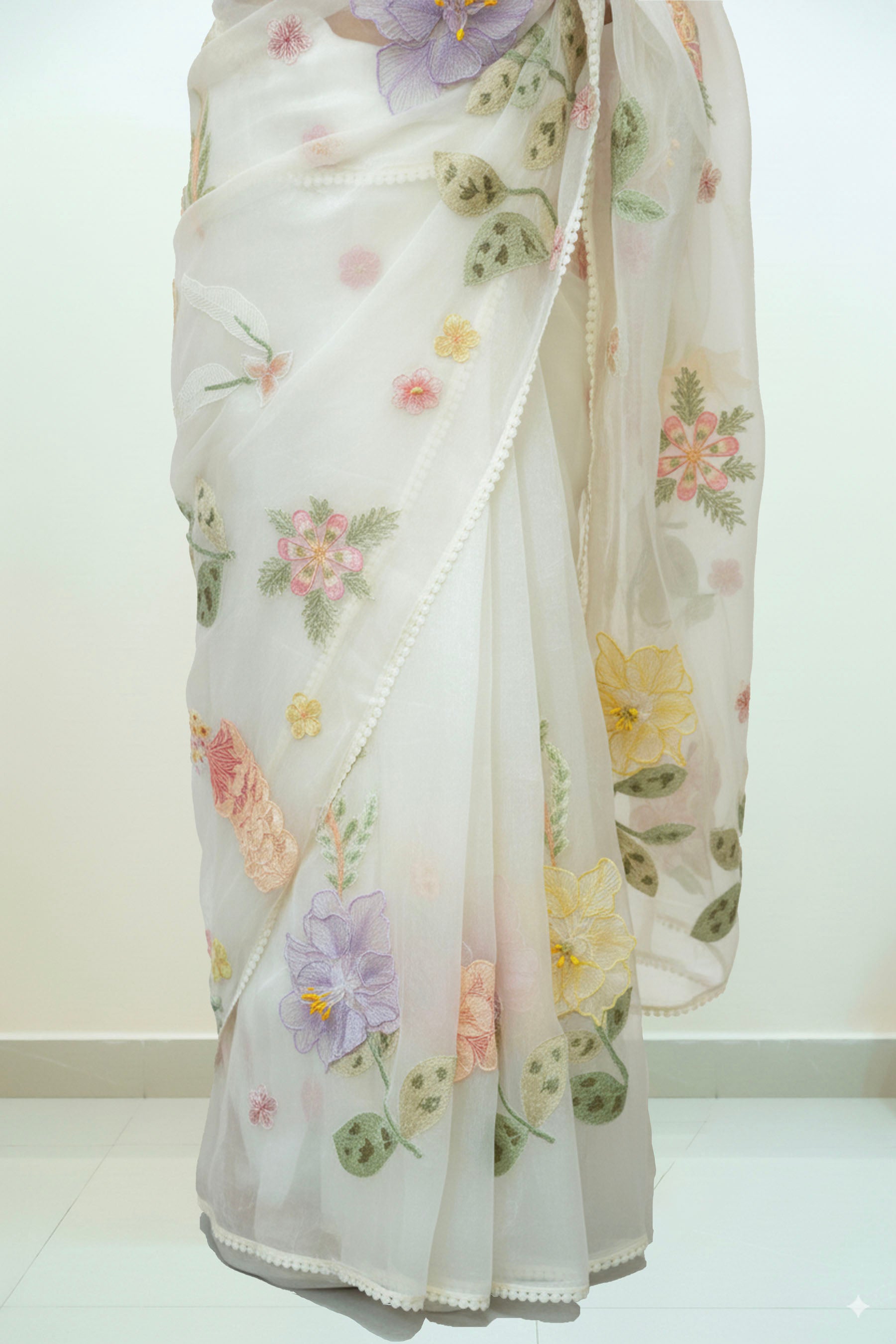 Pearl White Tissue Organza Saree with 3D Embroidery