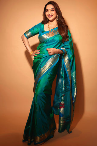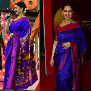 Our collection of authentic Paithani sarees showcases timeless elegance and craftsmanship. Worn by celebrities like Madhuri Dixit, Bhumi Pednekar, and Pooja Hegde, these sarees are perfect for special occasions and festivities, offering a royal touch to your wardrobe.