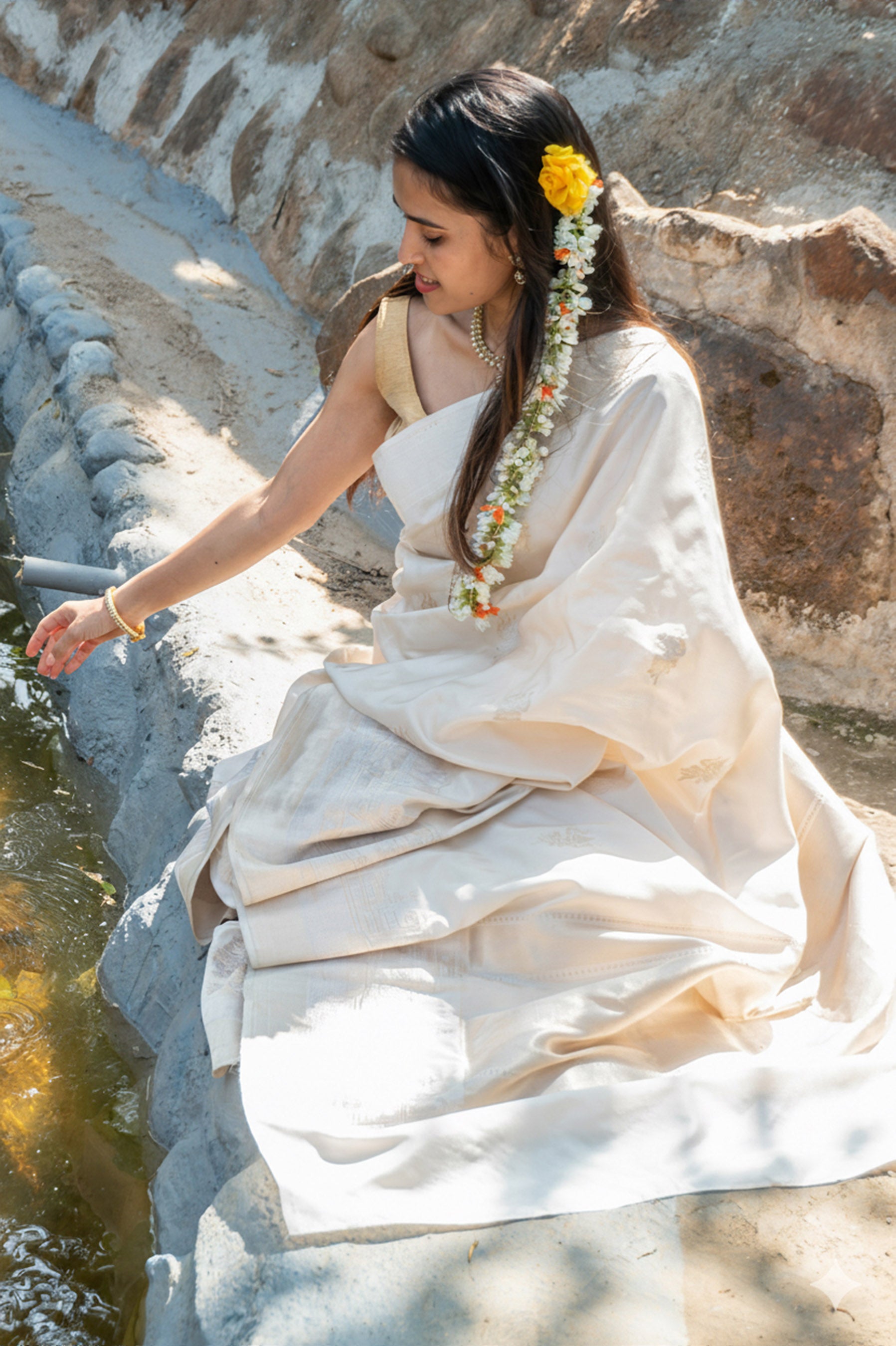 Bathed in a soft off-white glow, this Banarasi pure silk saree draws its soul from the ghats of Kashi- stone steps meeting the sacred Ganga, lined with temples, bells, and drifting boats. The trishul, with the damru gently entwined, motifs on the saree symbolize balance and rhythm - strength softened by serenity. Pre-order this drape and leave a lasting impression at weddings and festive celebrations.
