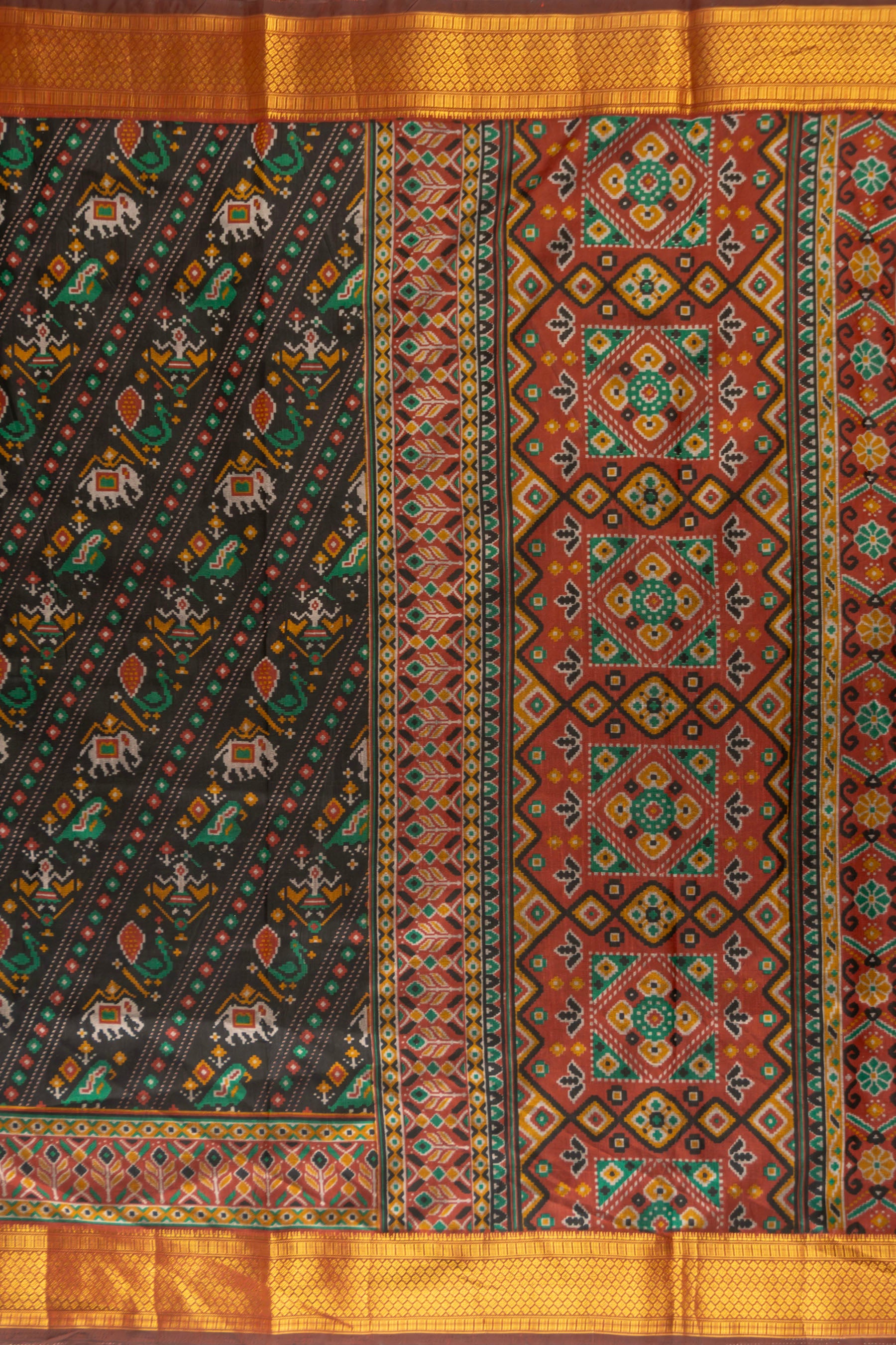 This striking saree is a high-quality Art Silk reproduction that elegantly mimics the look and feel of a handwoven silk Patola saree. The body of the saree features a rich, deep Black base, patterned with vibrant, diagonal ikat stripes. These stripes are filled with traditional Patola motifs, including stylized elephants (Hathi), birds, and geometric floral patterns in contrasting colors like green, yellow, white, and red. A prominent section (likely the pallu) is a contrasting color, such as a Dark Rust or Terracotta, woven densely with large, concentric diamond and geometric floral Patola motifs in teal, yellow, and black. The saree is finished with a bold, wide Pure Gold Zari border featuring a detailed cross-hatch or diamond band, which adds a striking, festive contrast to the richly patterned print.