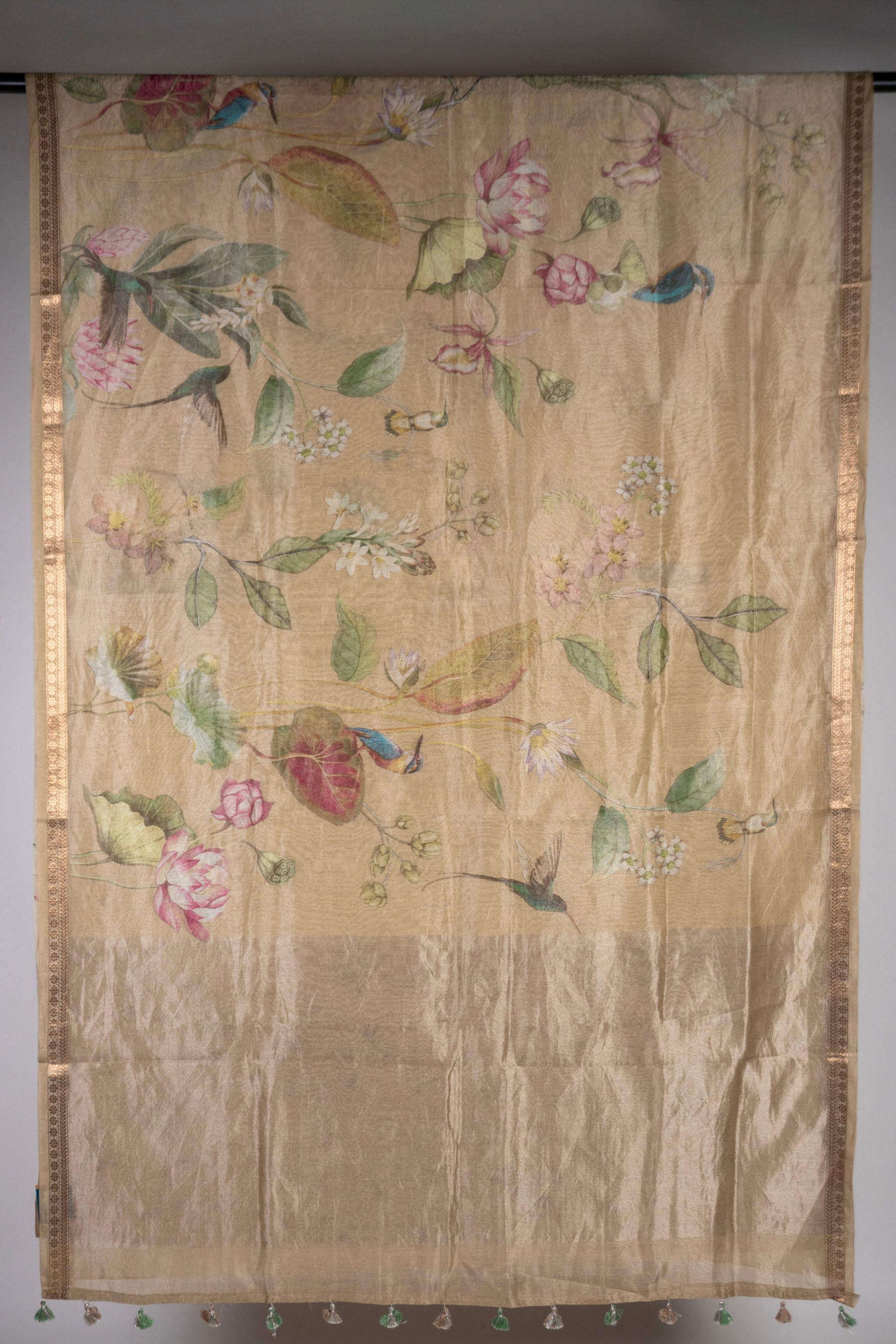 This elegant champagne soft linen tissue saree from Madhurya is a masterpiece of cultural storytelling and sophisticated luxury. The fabric blends the lightweight comfort of linen with the radiant shimmer of tissue, creating a luminous drape that captures light beautifully. The body of the saree features intricate digital prints inspired by traditional Indian art, showcasing a rich tapestry of figures, peacocks, and cows amidst lush trees and temples. Further enhancing its whimsical charm are digital prints of colorful birds and hummingbirds flitting through blooming floral gardens. The edges are defined by a refined golden zari border with a delicate floral creeper pattern, while the pallu is adorned with a striking pink lotus motif and finished with matching champagne and green tassels. Perfect for festive celebrations or romantic evenings, this digital print saree offers a modern and artistic take on heritage handlooms.