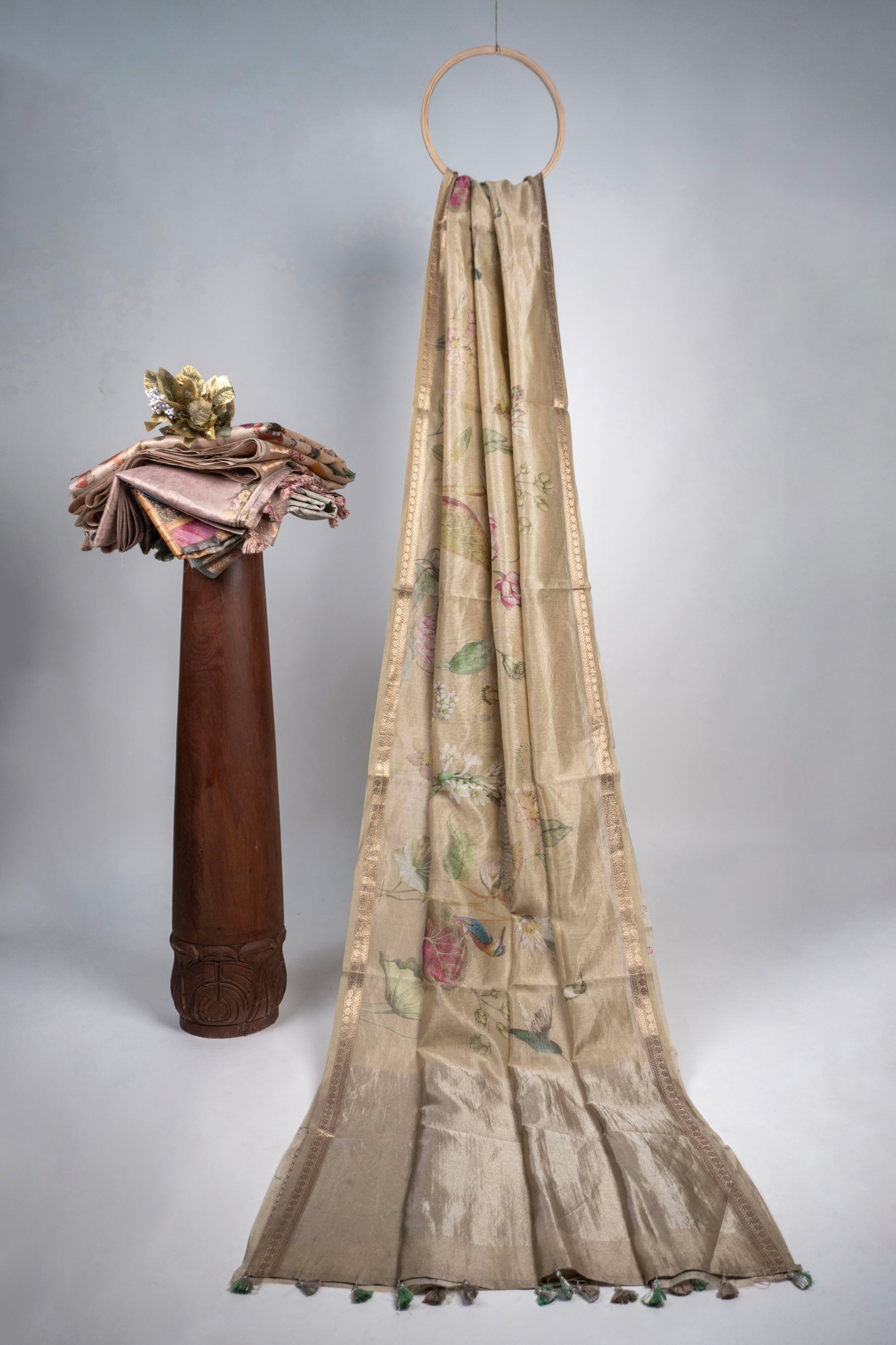 Champagne Soft Linen Tissue Saree with Digital Heritage Art and Bird Prints