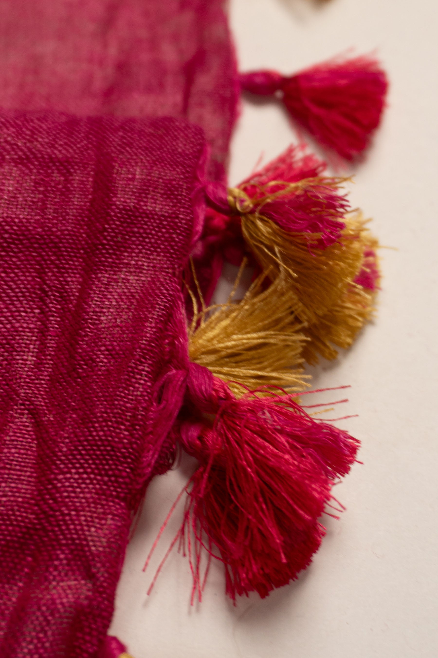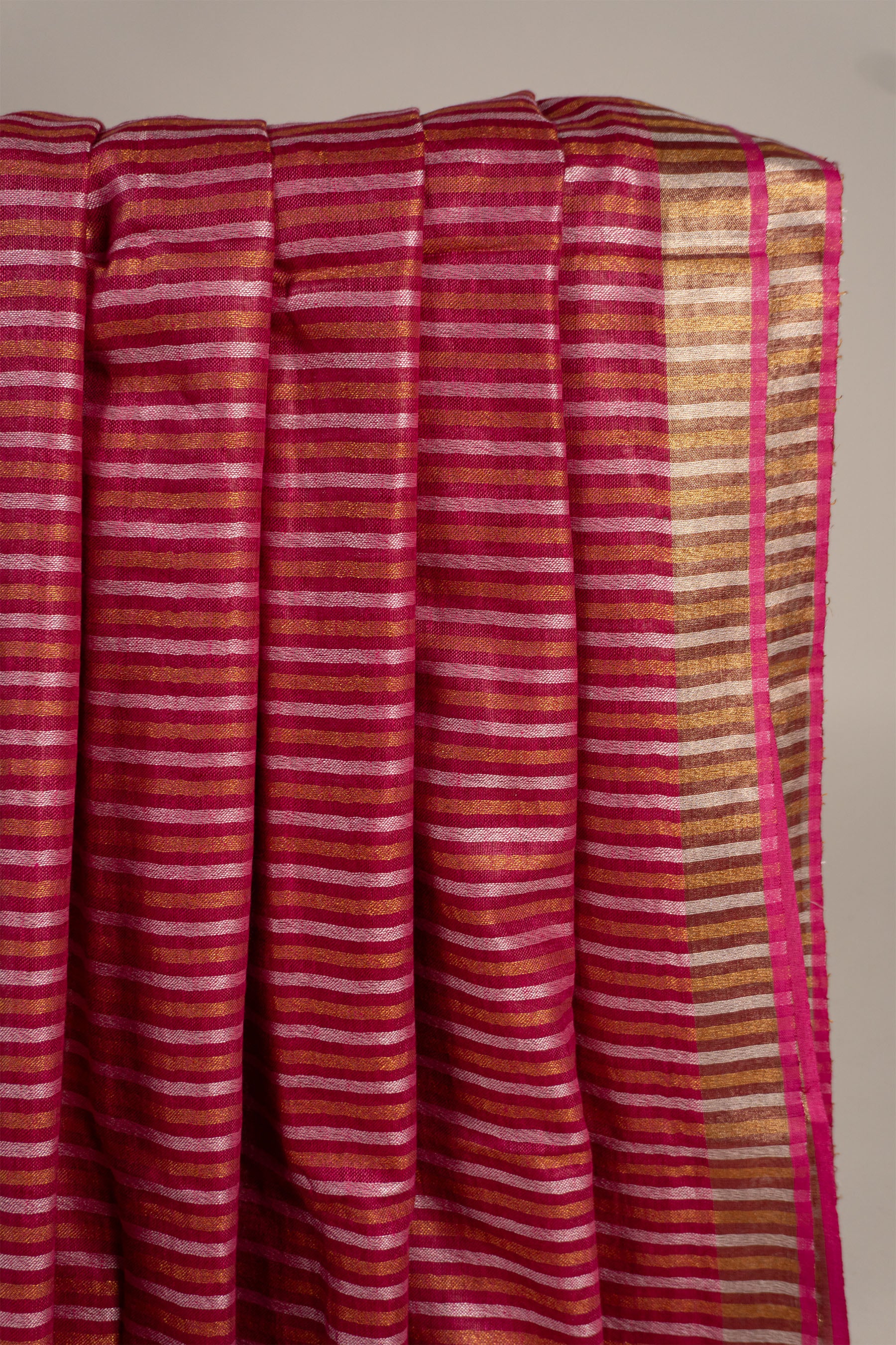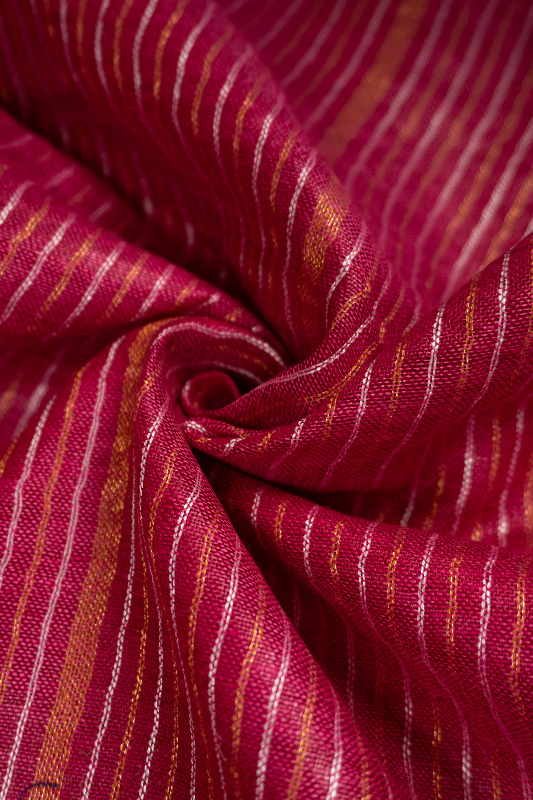 Dark Pink Pure Linen Saree with Silver Zari Stripes and Tassels
