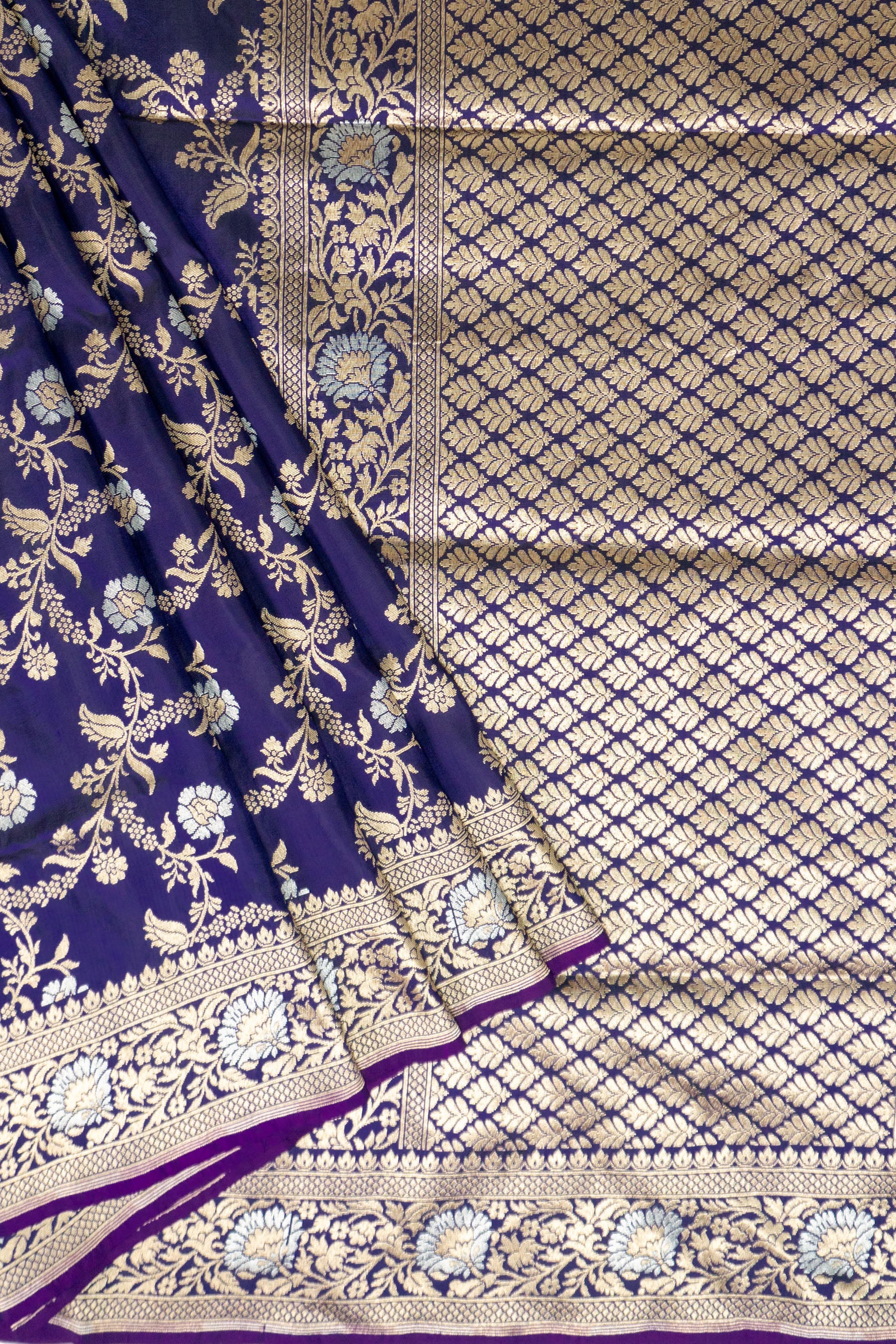 This majestic deep royal purple saree is a celebration of heritage artistry, meticulously handwoven from premium pure Katan silk for a rich, lustrous texture and graceful drape. The body of the saree is adorned with intricate silver and gold zari floral vines that wind across the intense purple fabric, creating a look of classic opulence. A striking contrast is provided by the elaborate pallu, which features a dense geometric grid of traditional leaf motifs framed by ornate floral borders. The saree is finished with a vibrant purple selvedge and a blouse piece featuring delicate buta work, making it an ideal choice for grand weddings and festive occasions where timeless elegance is required.