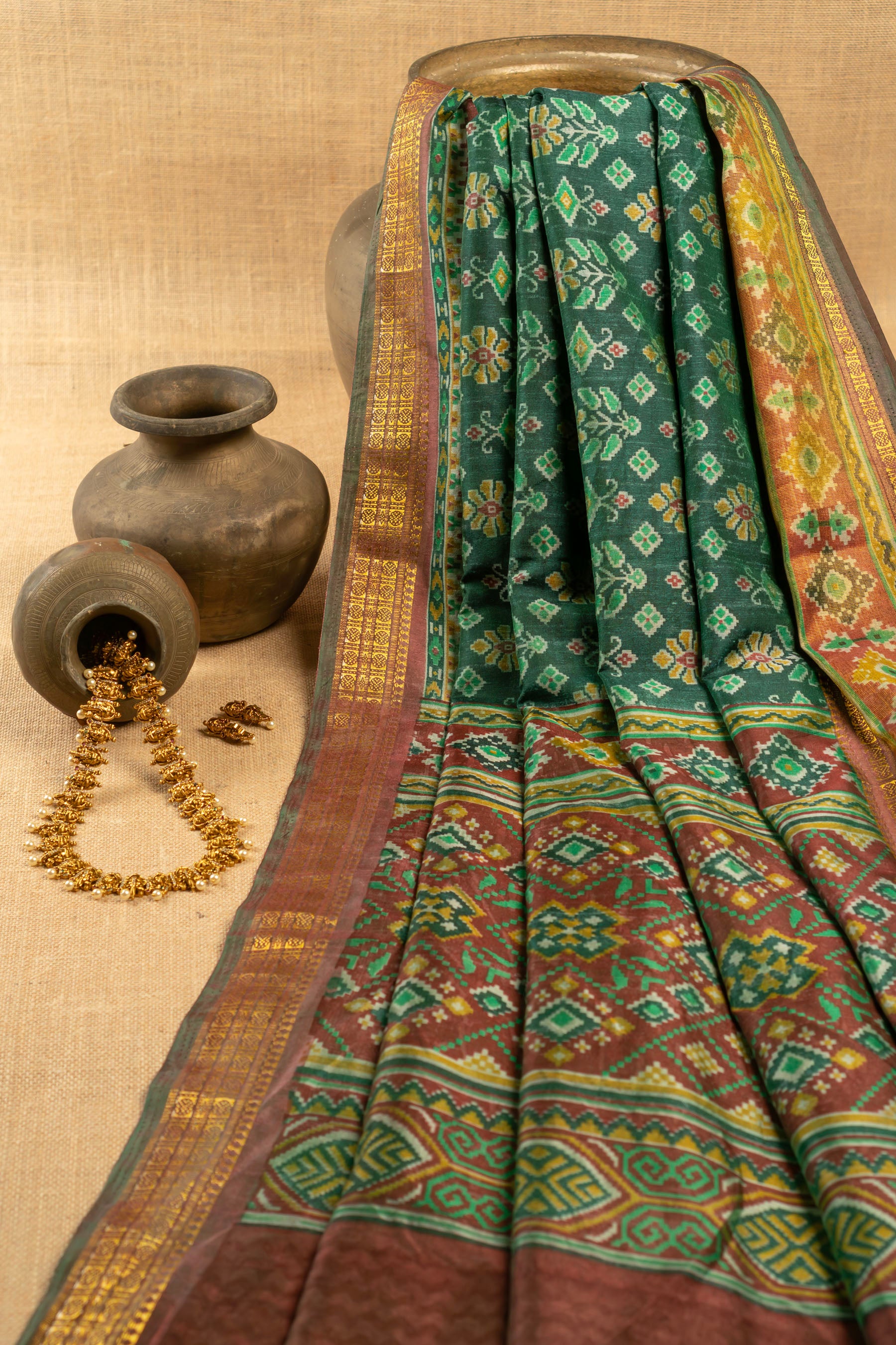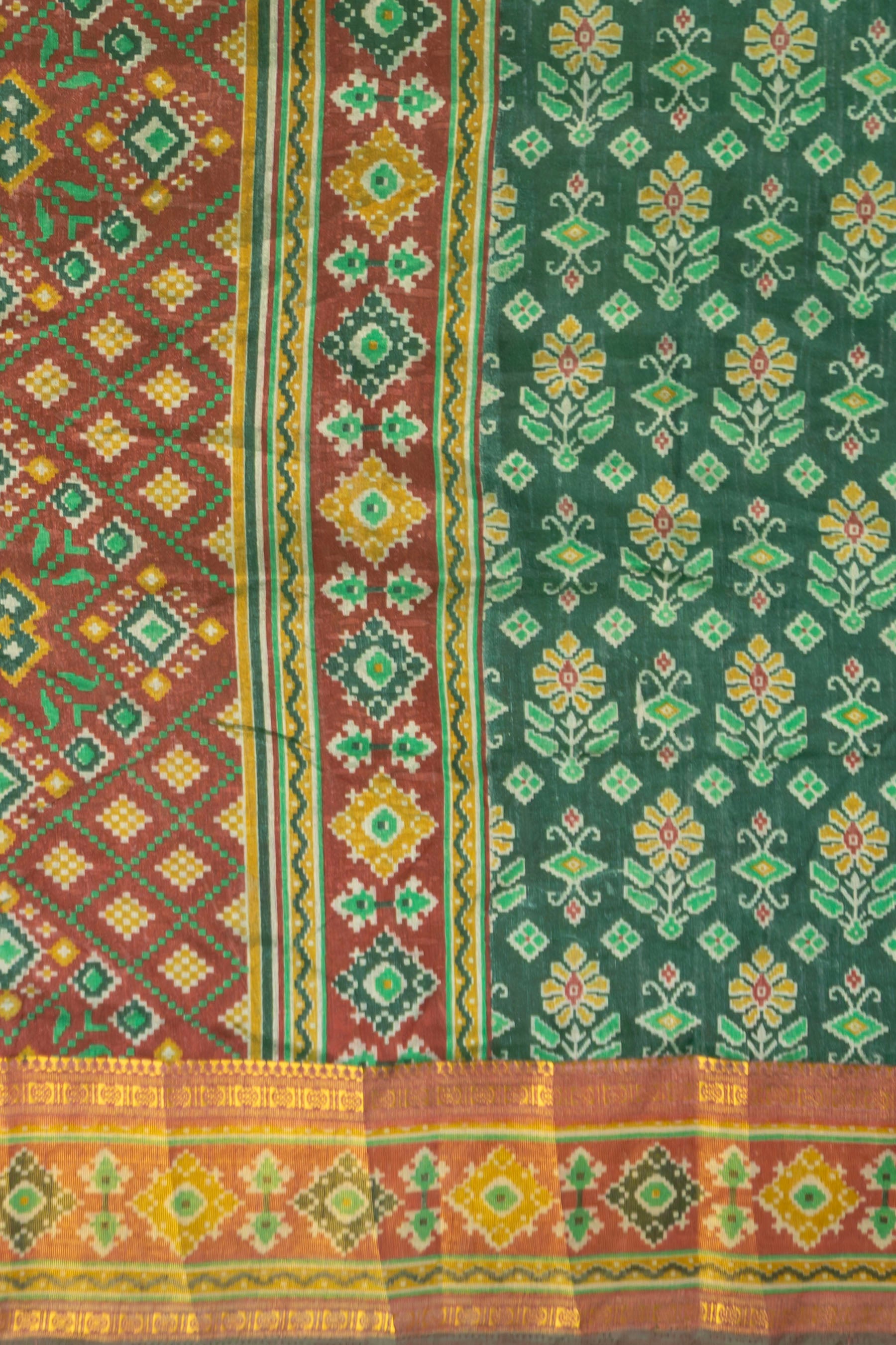This enchanting saree is an Art Silk replication of the luxurious Patola weave, offering the traditional look and vibrant complexity of Patola patterns in an accessible, easy-to-manage fabric. The design is characterized by broad panels of vibrant colours and intricate motifs. The body features significant sections in a rich Forest Green with repeating floral buttas in yellow and pink, interspersed with contrasting panels displaying intricate diamond and geometric lattice patterns. The vibrant Patola Print detailing is further highlighted by vertical stripes separating the main panels. The saree is framed by a broad, ikat-style border in shades of gold, orange, and red, finished with a narrow, traditional gold zari edge. This Art Silk saree flawlessly captures the double-ikat artistry, making it an ideal choice for festive wear without the maintenance required for real silk.