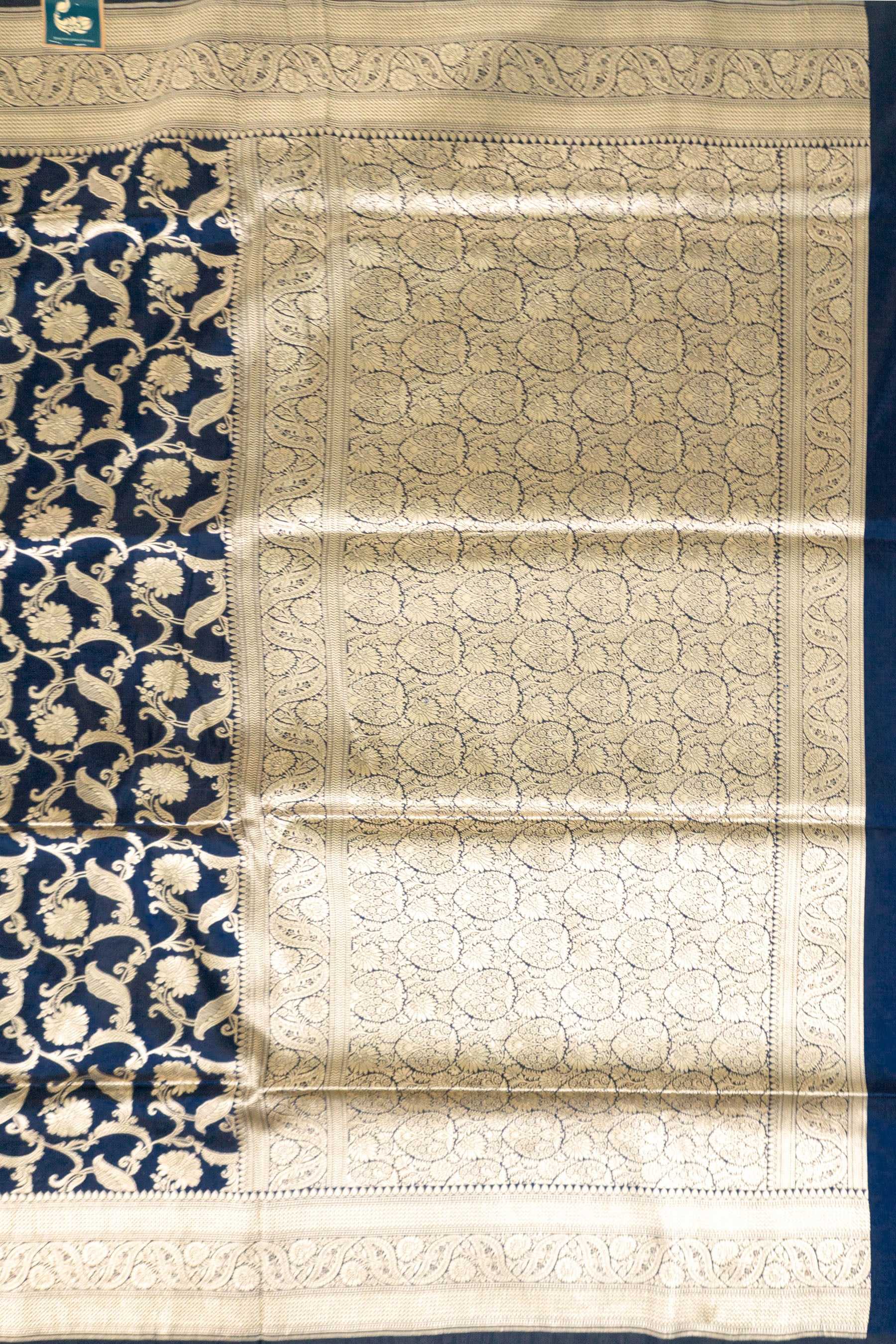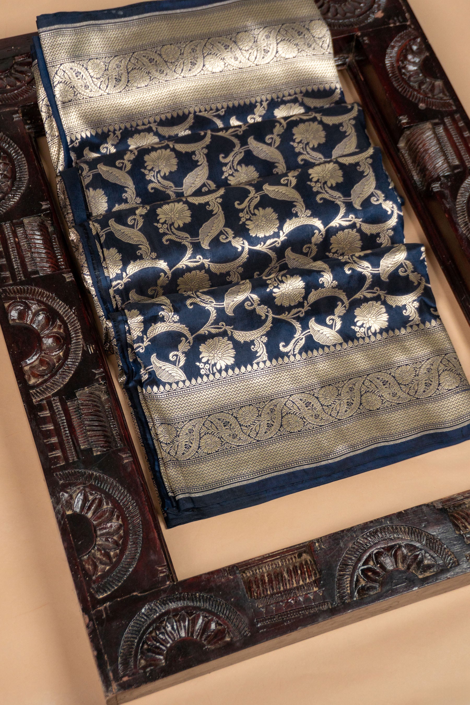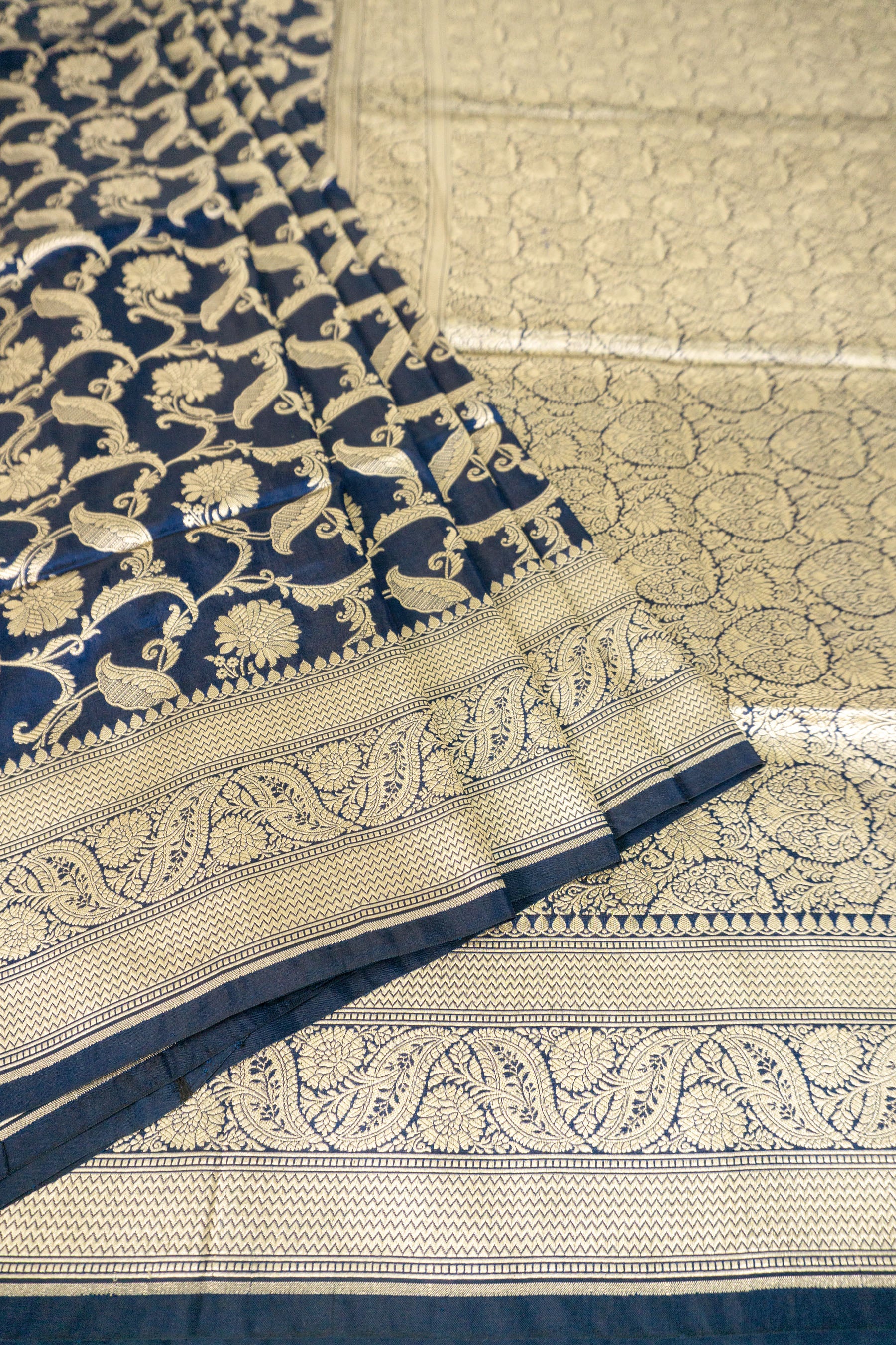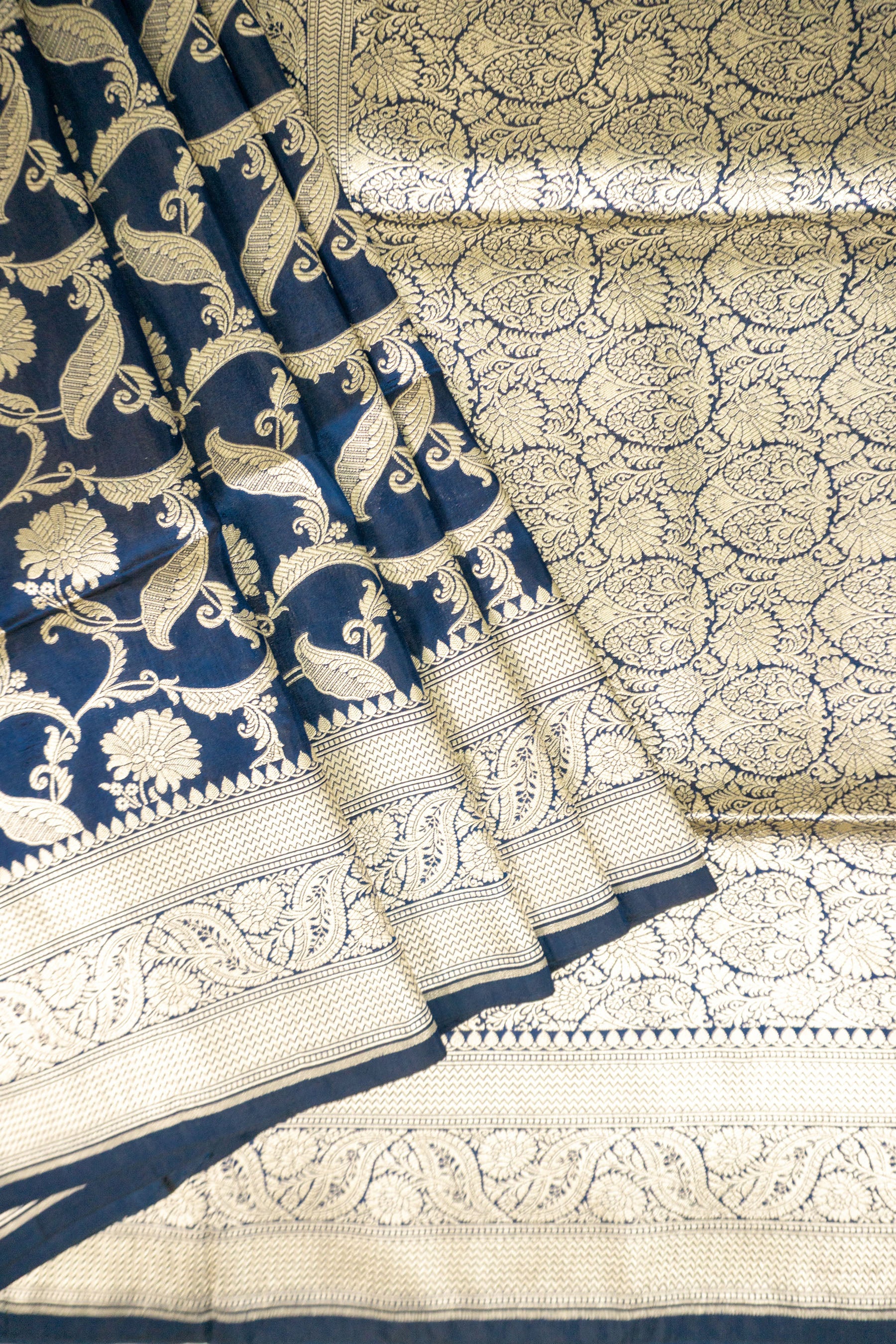 This regal navy blue saree is an exquisite example of traditional Banarasi weaving, crafted from the finest pure Katan silk to provide a structured yet graceful drape with a deep lustrous finish. The body of the saree is intricately adorned with delicate floral vines and blooming motifs handwoven in rich antique gold zari, creating a sophisticated contrast against the dark midnight blue fabric. Its heavy pallu features a classic geometric leaf grid pattern framed by ornate floral borders, while the matching blouse piece is accented with dainty gold butas to complete the ensemble. Perfect for grand weddings or high profile festive celebrations, this handloom masterpiece embodies timeless elegance and royal heritage through its superior craftsmanship and opulent color palette.