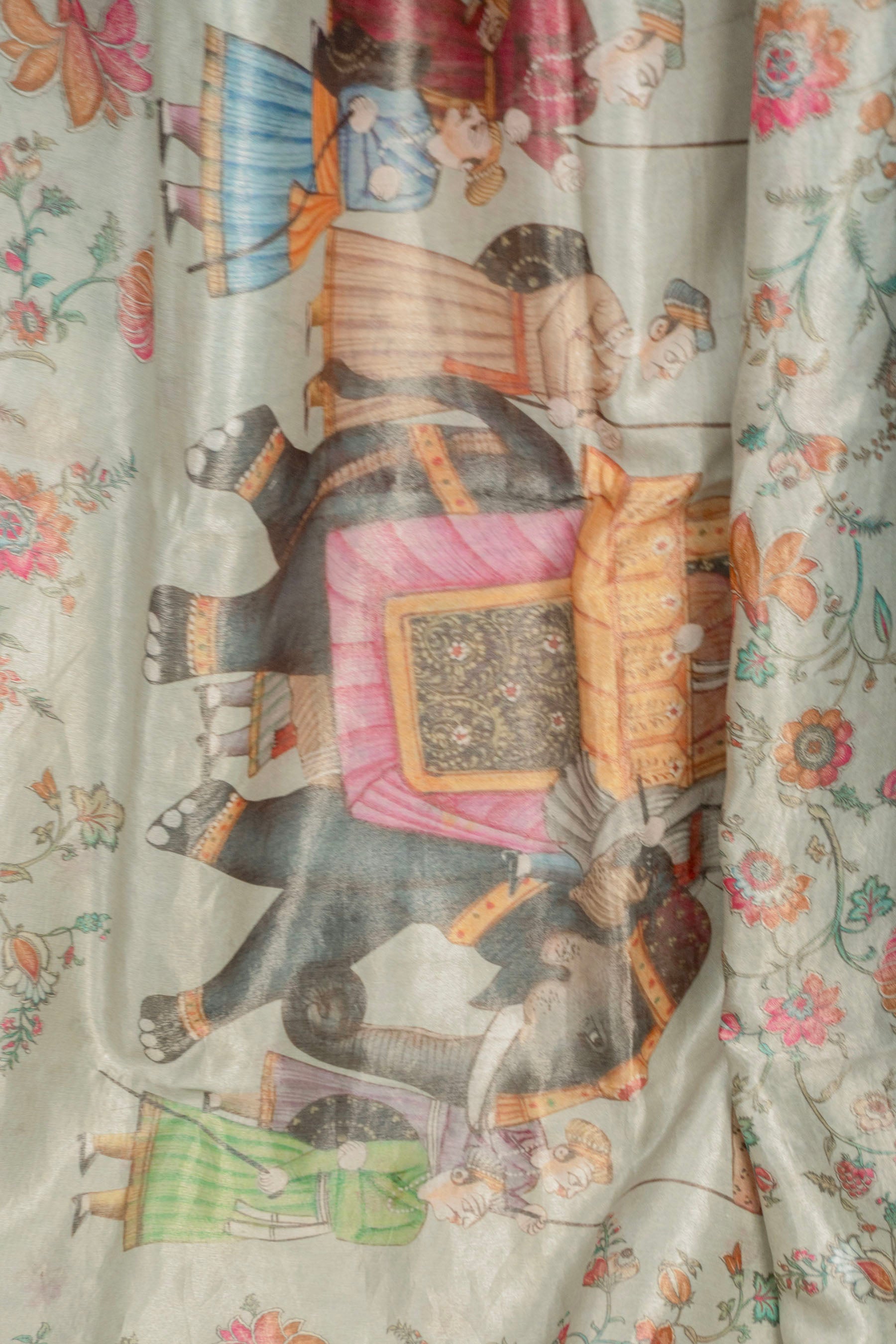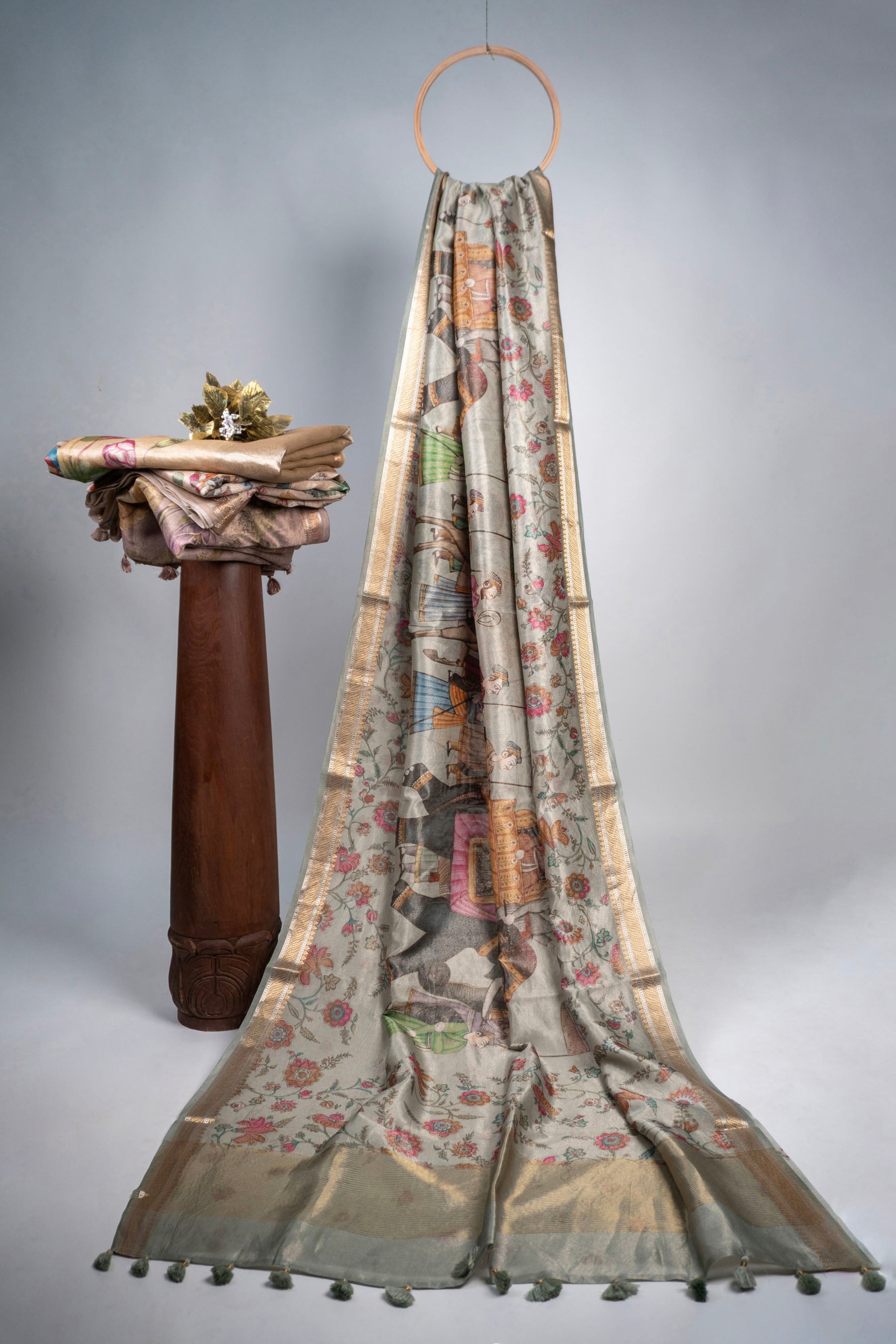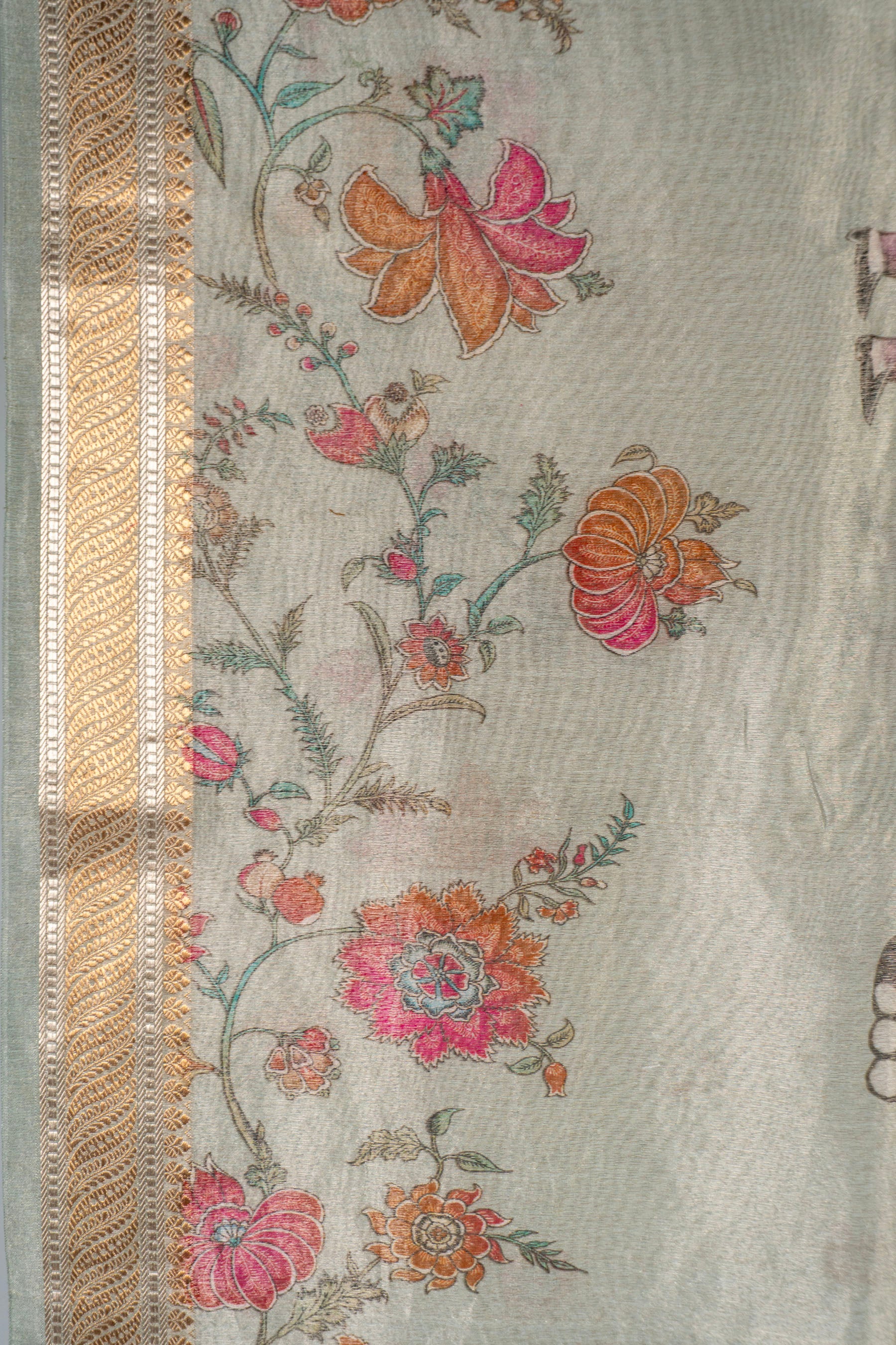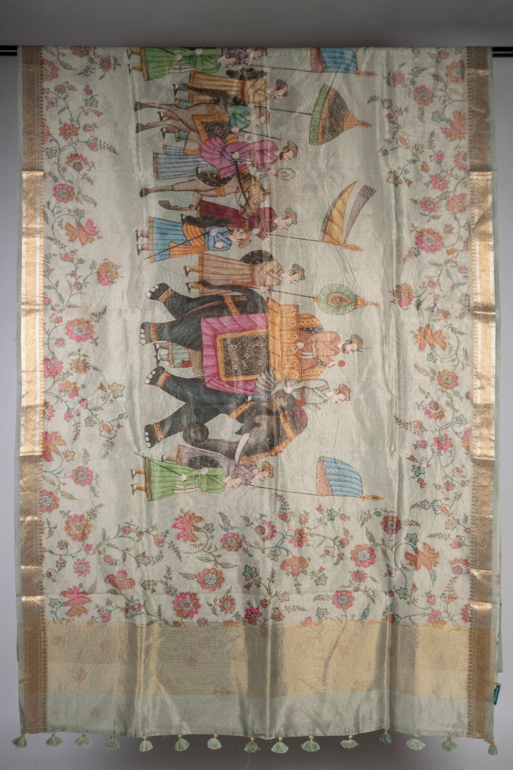 Pastel Pista Green Soft Linen Tissue Saree with Digital Heritage Art Prints