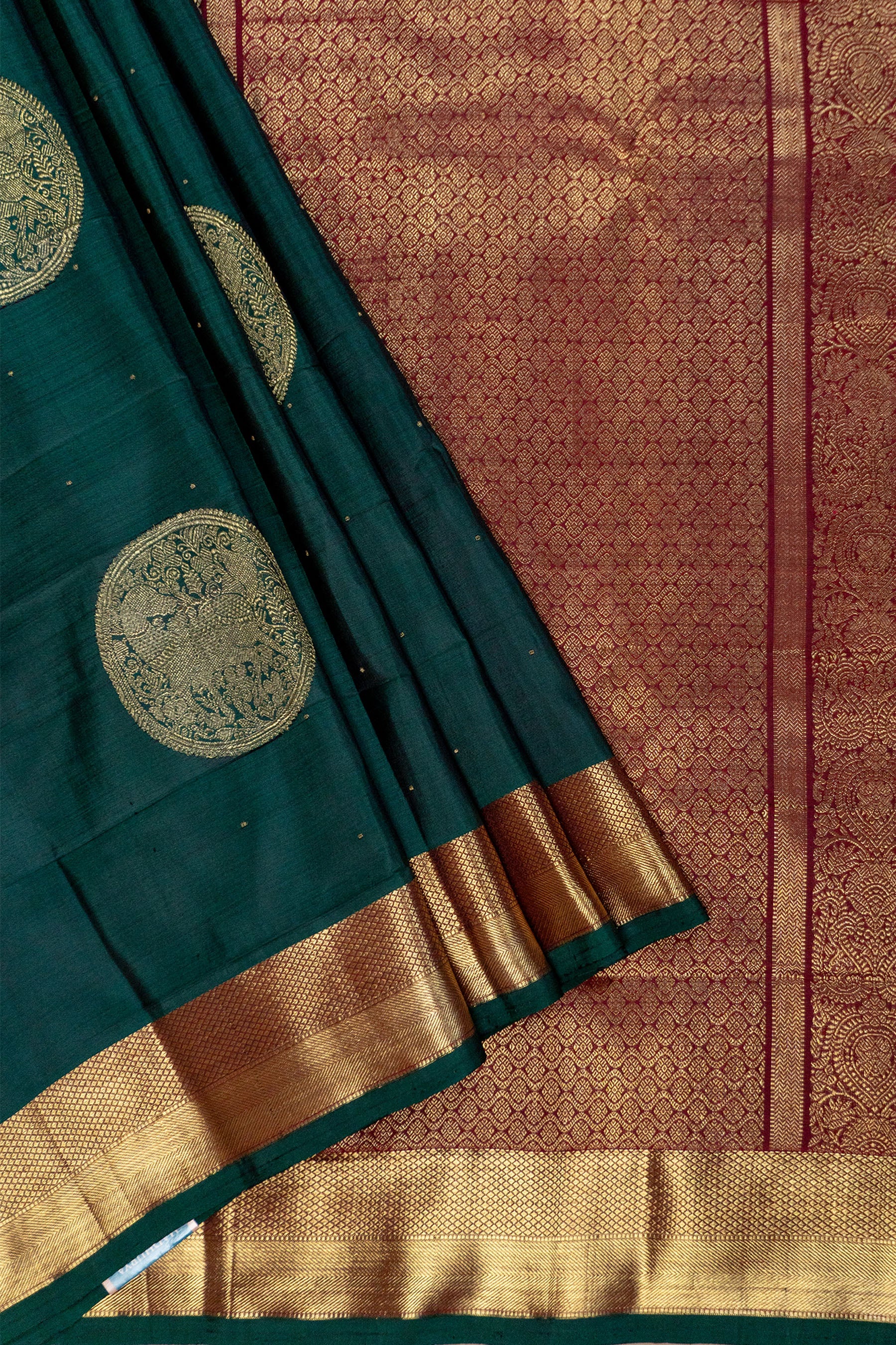 Bottle Green Kanjivaram Silk Saree Featuring Ornate Golden Flora Borders and Shimmering Zari Pallu