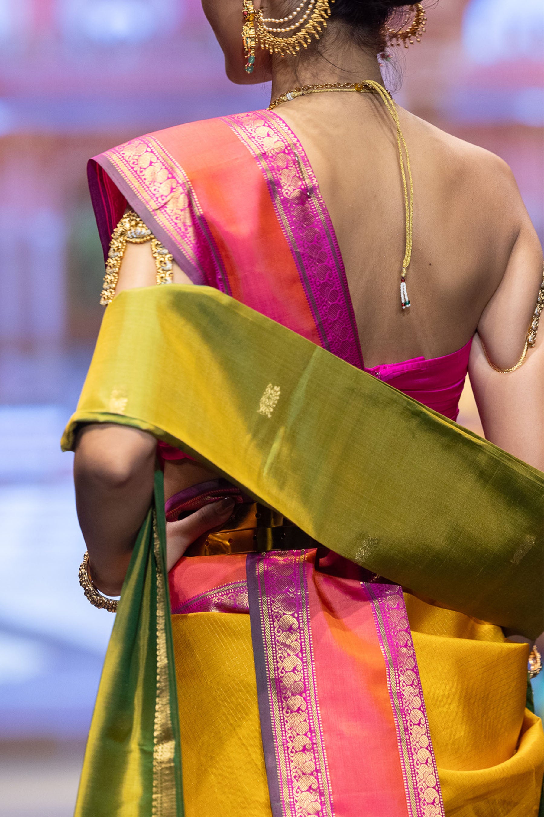 Crafted from the finest pure silk, this saree boasts a lustrous sheen and a structured drape that holds its shape with regal grace. The dual-tone border adds a modern dimension to the heritage design, making it a versatile choice for a bride or a guest of honor. Pair this stunning ensemble with traditional temple jewelry and a contrasting pink blouse to complete a look that is both deeply rooted in culture and effortlessly sophisticated.